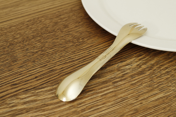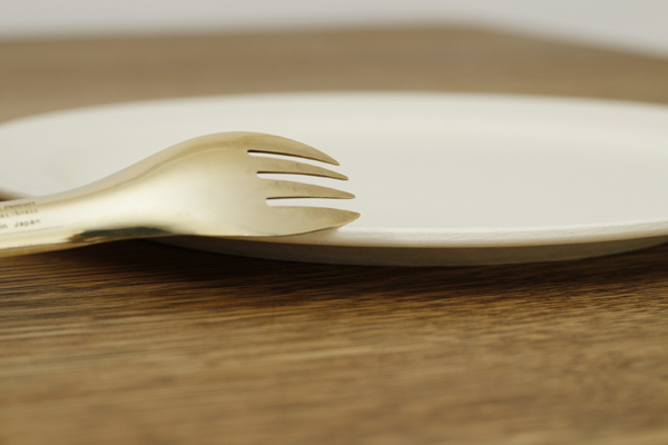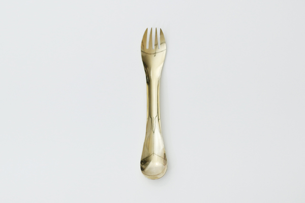 スプーンとフォークが一体となった真鍮製のスポークは、とても軽量で、日常使いからピクニック、アウトドアでも活躍します。真鍮は人体に害を及ぼすものに触れると色が変わるため、昔から安全食器として愛用されてきた歴史があります。 真鍮は経年変化の愉しめる素材です。愛着がわき、味わい深くなって行く様をお楽しみください。 お手入れ方法 : 真鍮は銅と亜鉛の合金です。最初は金属特有の匂いがありますが、使うほどに表面が酸化膜で覆われていくことで軽減されていきます。 食器用洗剤で洗い、布巾などで水気をしっかり落してください。濡らしたままにしておいたり、洗わずに長い間放って置くと、黒ずんだり緑青が出やすくなるので、初めのうちは特に気をつけてご使用ください。丁寧に使うと均等に酸化膜が張ります。黒ずみや緑青が気になる場合は塩と酢を混ぜた物や研磨剤の入った洗剤などで磨くと元の光沢が出てきます。汚れの落ちにくい場合は薄めた酢に一晩つけた後、磨いてください。緑青は毒と言われていたこともありますが、人体には無害です。 このスポークは、菊地氏のハンドクラフトによる原型をもとに、工場やスタッフとの試行錯誤を経て完成した商品です。 工業製品の洗練された良さと、菊池氏のハンドクラフトによる原型の持つ雰囲気を合わせ持っているのが魅力です。_