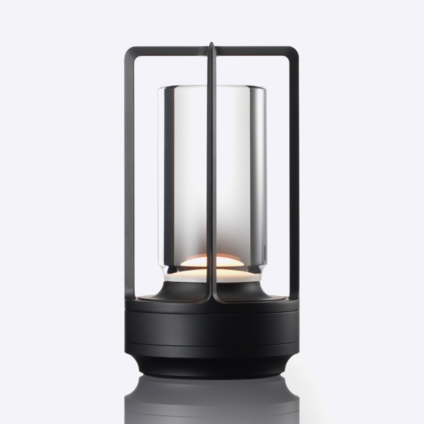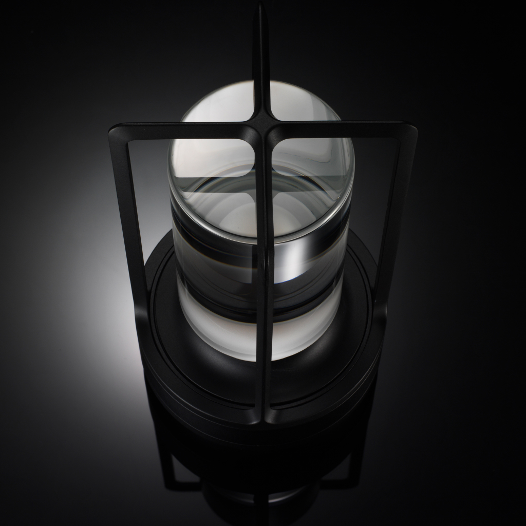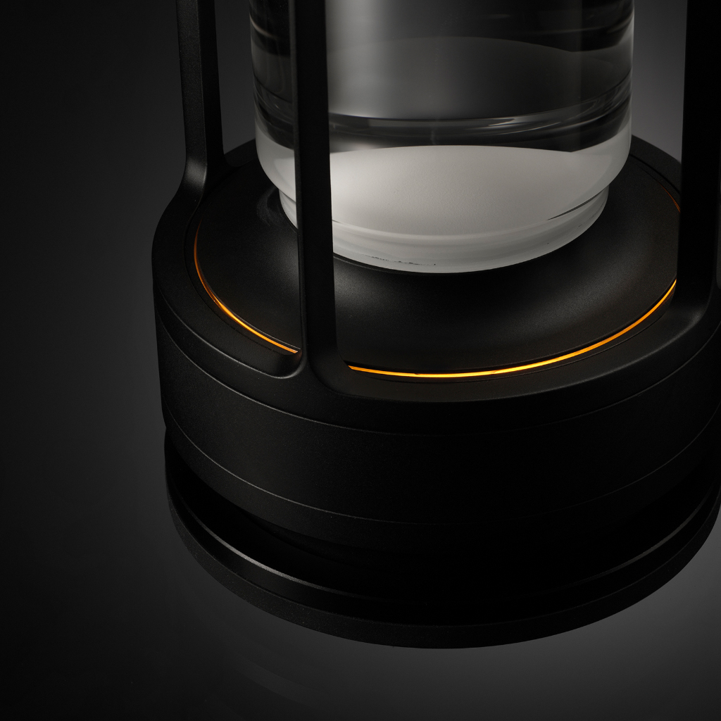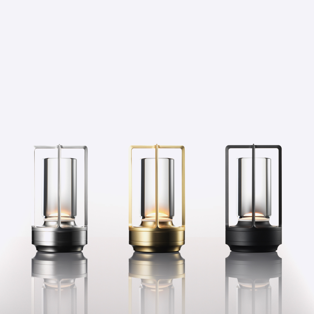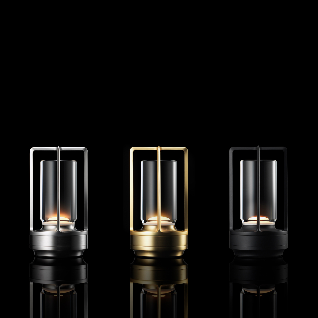 手元を照らすタスクランプとして発売された「TURN」に対し、空間の雰囲気を作り出すアンビエントランプとして新たに登場した「TURN+」 「TURN」同様に削り出した金属の素材から3種類のバリエーションがあります。 アルマイト加工された、マットブラック焼付塗装のアルミニウムモデルは、シリーズ内で最も軽量でスタイリッシュな雰囲気を持っています。 良い灯りは、それが灯っていることさえ忘れてしまうくらいに自然に環境に馴染んでいきます。 人間の眼は、日の出から日没までの陽の光に順応しているので、日没後の不自然な光は体内のリズムを狂わせてしまう恐れがあります。 ロウソクの揺らぎや、火の粉がはぜる焚き火の灯りがリラックスできるのは、夜の灯りとして無意識に身体が認識しているためでしょう。 そう言った意味では、「Turn+」はアンビエント照明として十分な役割を果たします。 ブライアン・イーノの音楽のように、気がつくと環境になじんでいき、機器としての存在を消しさっていく。 それは、機能的で使い込まれた道具が身体と一体化していく様のようです。 「TURN+」の名前の由来になった ”+ " 形状のケージは、形状を美しく表現するために一切の継ぎ目をなくした鋳物にマテリアル素材に合わせたメッキや塗装が施されています。 無垢のクリスタルガラスを職人が丁寧に磨き上げた、完璧な透明素材と、光量に対して絶妙に光色が変化する新開発のLED光源を組み合わせることで、これまでにない上質で透明感のある灯りを作り出します。 光のコントロールはベース下部に軽く触れると灯りの表情が変化していきます。 キャンドルのような仄かな灯りから、食事を楽しむ灯り、テーブルを照らす灯り、部屋に奥行きを与え明るさをプラスする灯りと4段階に調光が可能です。 硬質な金属の本体から放たれる、柔らかい光のコントラストが TURN+ の魅力です。 また、コードレスでIP66※相当の防水性能も備えていますので、バスルームからキャンプなど屋外での使用も十分に楽しめます。 (IP66 : 微塵が内部に侵入しない、あらゆる方向からの強い噴流水による有害な影響がない保護レベル) シリーズとして、真鍮、ステンレス、アルミニウムの三種類があり、それぞれの金属から削り出されたものとなります。 重量感や雰囲気がそれぞれ異なりますので、好みや使うシーンによって選ぶ楽しみもあります。