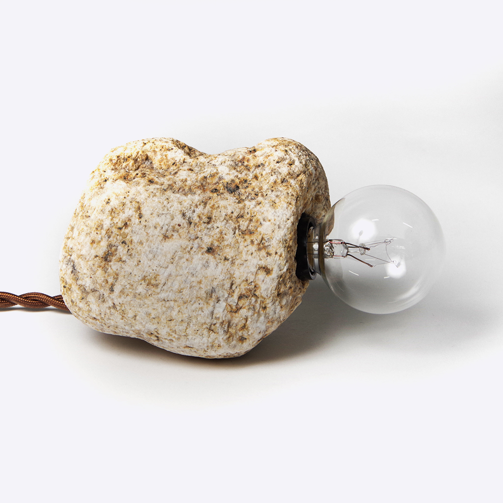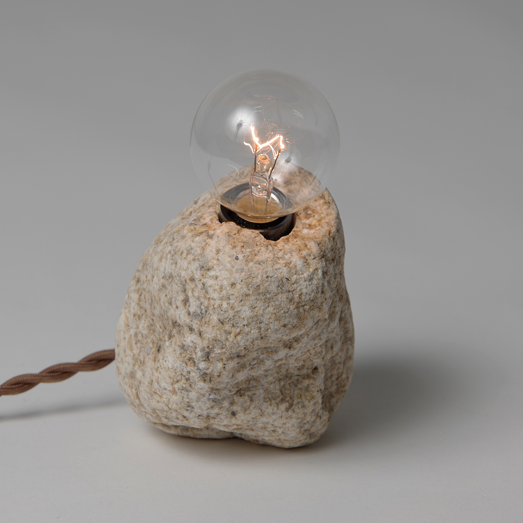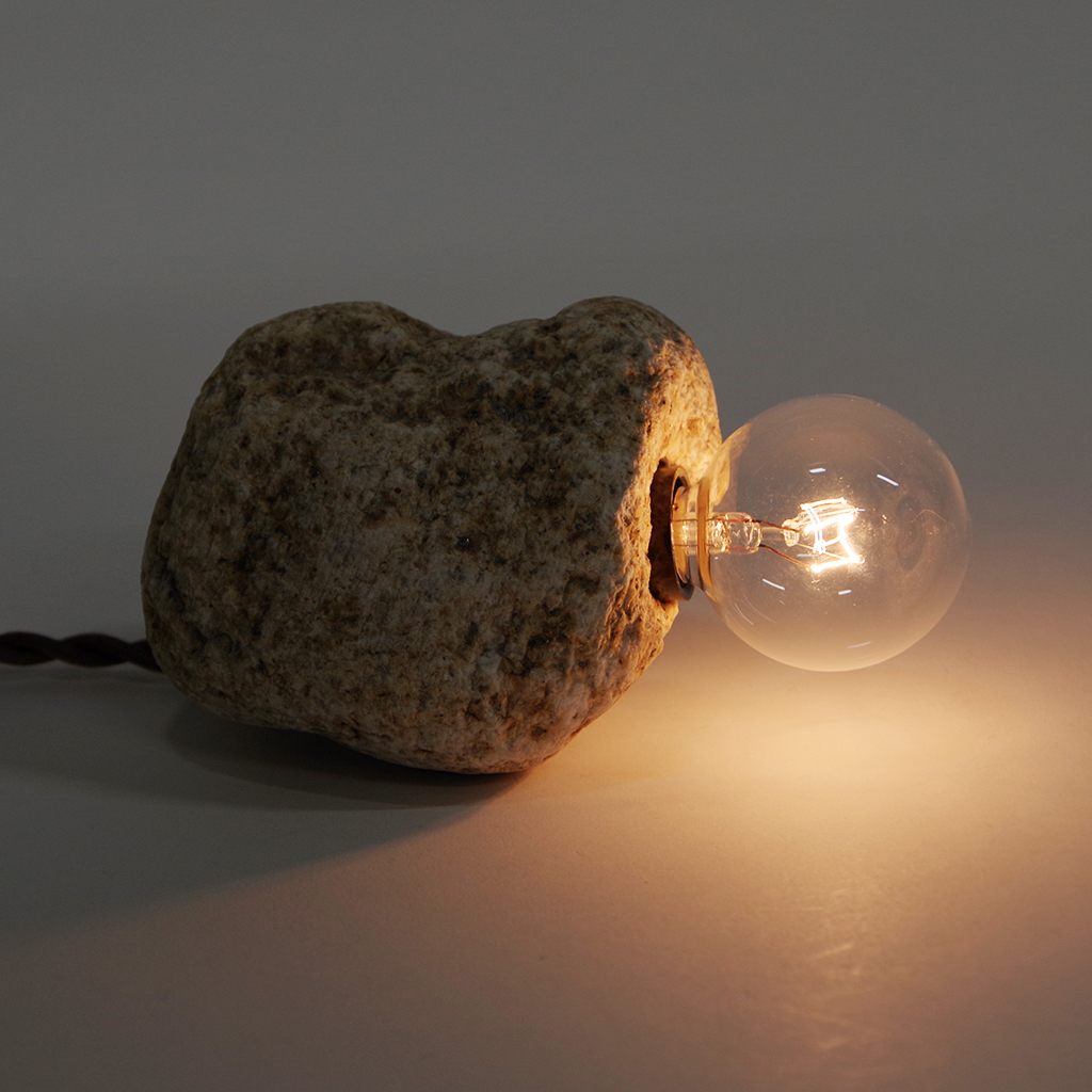 空間デザインをベースに店舗設計や展示会などイベントの会場構成、ディスプレイデザインを手がける外山翔さんによるアートプロジェクト【Atelier matic(アトリエ マティック)】 「品がありユーモアもある」「大胆さと繊細さ」をテーマに、現在は天然石やアクリルなどの樹脂を用いた一点ものを製作しています。 アクリルに亀裂を入れたり、花やアンティークアイテムを閉じ込めることで、まるで時間が止まったように一瞬を切り取ったような作品や、天然石のアートピースでは、石を選別する中で、石の自然な模様や無骨な荒々しい部分など、そのものの持つ美しさや力強さを表現しています。 こちらは、白の御影石にサビ色がついていて丸みを帯びた伊勢ゴロタを用いた照明。 照明としてはもちろん、オブジェとしても。棚に置いたり、床にそのまま置いて使用するのもオススメです。 すべてハンドメイドの1点ものとなります。 ※点灯確認用にE17 (10W) の電球が付属します。ご自身でお好みの電球を探してみてください。