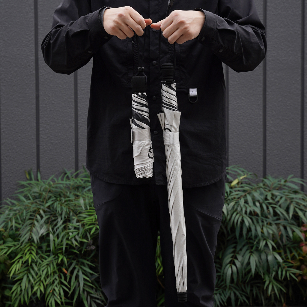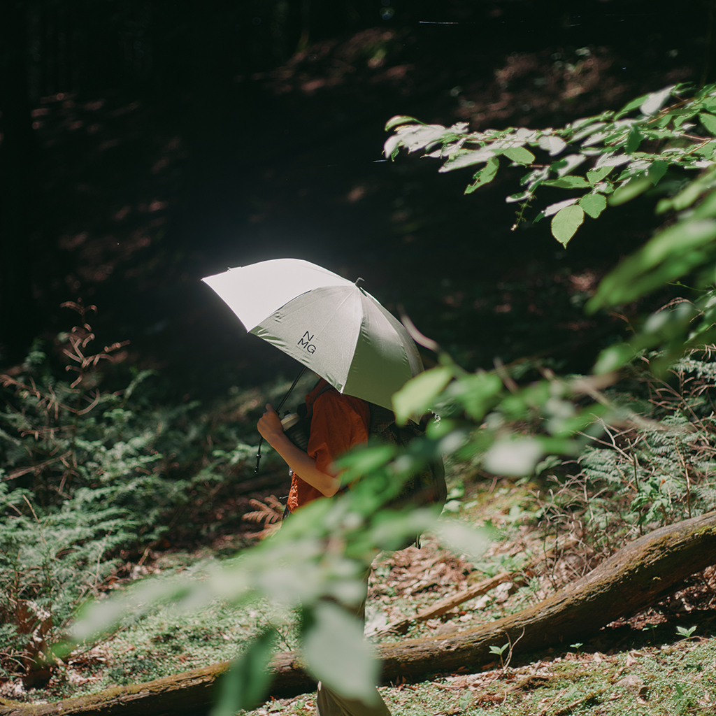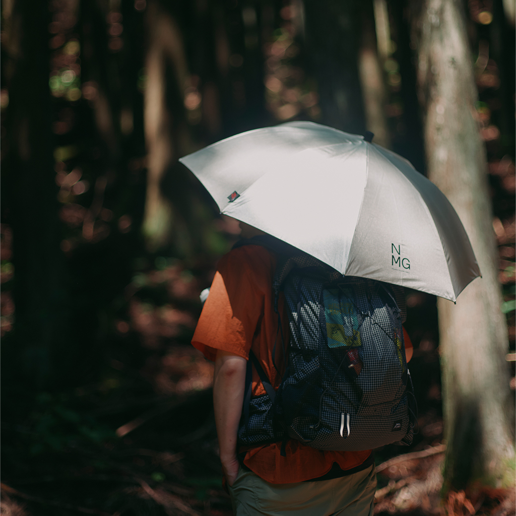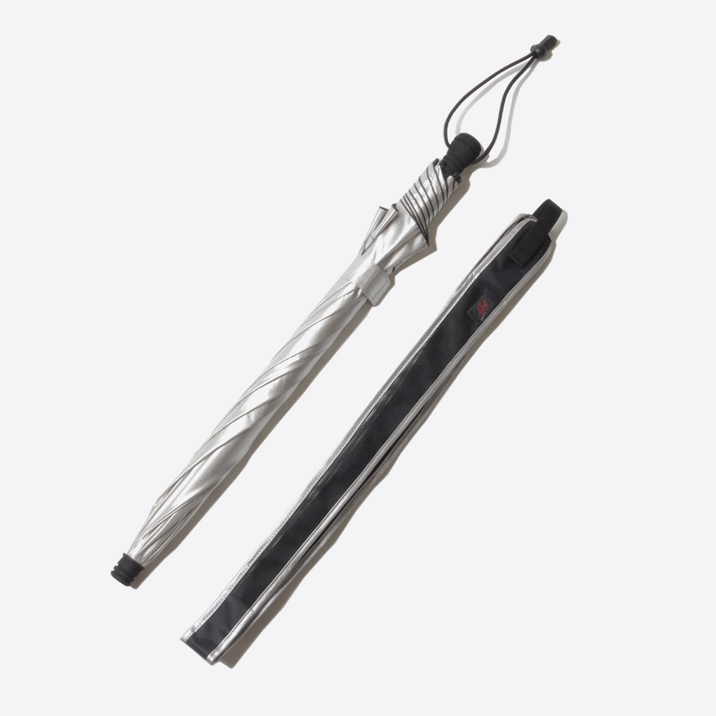 groovisions/グルーヴィジョンズにデザインしていただいた『Nicetime Mountain Gallery』オリジナルロゴを刻印したアイテム。 高品質かつ高機能アンブレラ作り一筋100年余年のEuroSCHIRM(ユーロシルム) ドイツの ウルム(Ulm)を拠点に素材を厳選して製品づくりを行っています。 『スイング ライトフレックス アンブレラ シルバーメタリック』は、その驚くような軽量性にもかかわらず、非常に耐久性があり、ちょっとの強風ではへこたれません。 親骨の中心部から放射状に取り付けられたアームが強風を受けた際に渦巻き状にフレックスにしなることで、風圧を上手く受け流す構造になっています。また、絶縁性があり落雷の危険性も軽減してくれます。 キャノピーには、DuPontテフロン加工を施した耐水性に優れた超軽量100%ポリエステル素材を使用し、泥が付着しにくく引き裂き強度にも優れています。 溝の入った高密度EVAハードフォーム製のハンドルは、軽量で握りやすく、雨で濡れても滑りにくくドライ感を維持します。突然の強風でも傘が飛ばされないよう、エンド部にセーフティランナーが付いています。 しかも、紫外線保護指数50+。日傘として日焼け防止、暑さ対策としても有効です。 軽量なのでバックパックのサイドポケットに入れていても重量は気になりません。 傘は置き忘れたり、壊れて廃棄されたりすることがとても多いアイテムですが、耐久性が高くお気に入りの製品を選ぶことで、廃棄までの時間も長くゴミになりにくく、なおかつ電車に置き忘れてしまうことも減らすことができます。 軽量で握りやすく、雨で濡れても滑りにくくドライ感を維持するハンドル部。 エンド部のセーフティランナーに手首を通せば、突然の強風でも傘が飛ばされません。 通気性に優れたメッシュパネルを使ったナイロンケースが付属。ショルダーストラップ付きで肩に掛けることもできます。 モデル:182cm サイズ比較