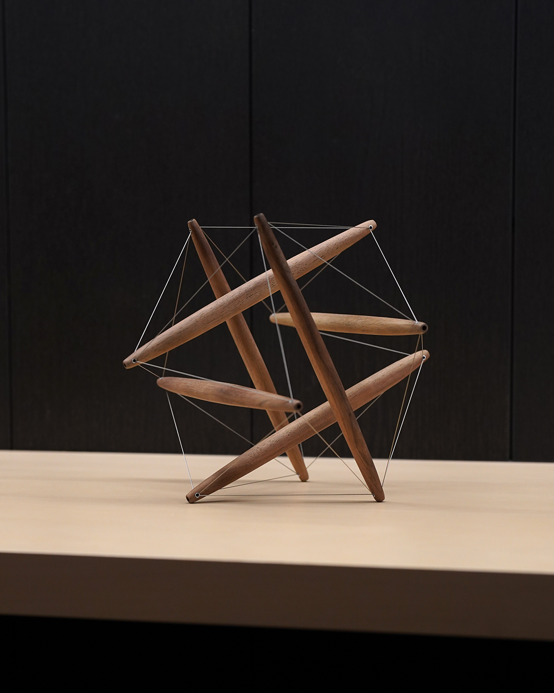 張力のつり合いによって均衡が保たれ成立するオブジェクト「テンセグリティ」。 ケネス・スネルソンとバックミンスター・フラーによって発明、提唱されたテンセグリティは、構造概念や構造システムのモデルとして、またパブリックアートとしても世界的に知られています。 こちらの作品は、木工作家 ikkaku mosaic./井出裕太氏と、TENSEGRITYLAB.を主宰する山本考志氏によるスペシャルなコラボ作品。 ikkaku mosaic.がハンドメイドで一本ずつ丁寧に削り出した木製ロッドを用い、TENSEGRITYLAB.が緻密に組み上げました。 豊かな表情を持つ木と、自然に内在する構造原理が呼応することで、目に見えない力の関係が美しく可視化され、空間に馴染む新しいオブジェが生まれました。 ※すべて1点ものとなります。