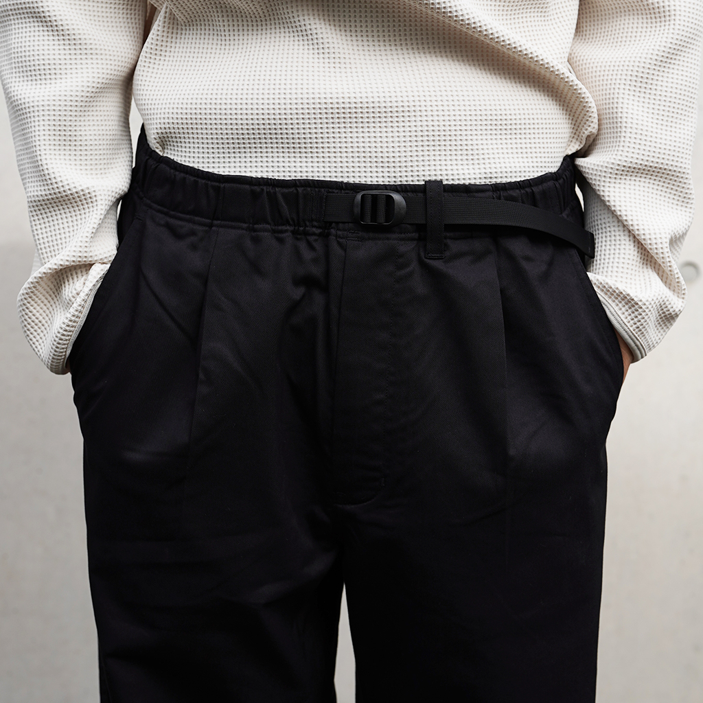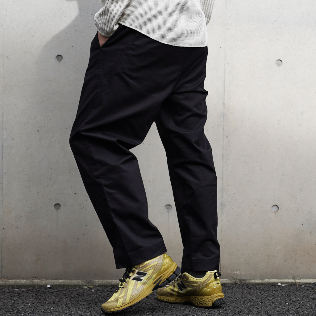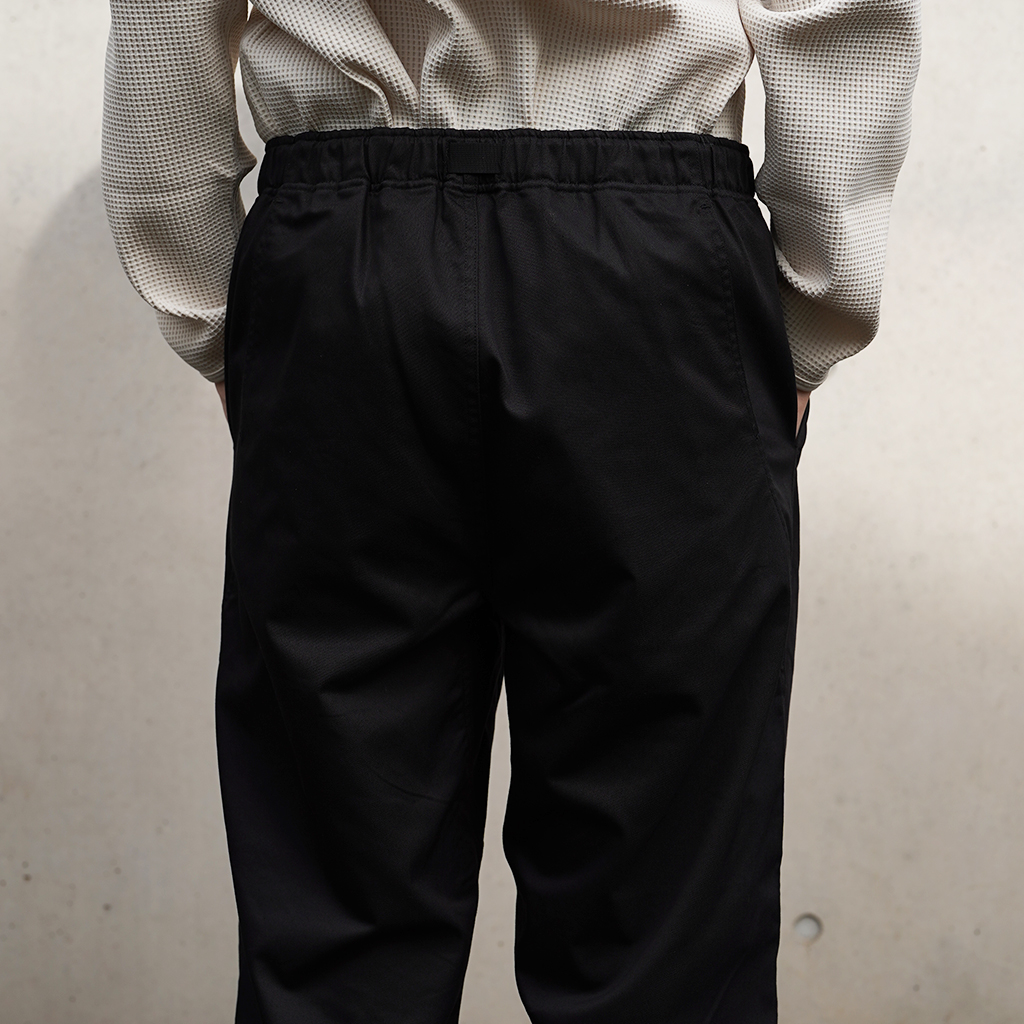 脚が動かしやすく機能的であること、立ち姿のシルエットが美しいことにこだわった【Goldwin】のパンツ。スポーツウエアブランドならではの設計や素材選び、快適性を維持しながらすっきりとした印象に見えるデザインが、年齢やジェンダーを問わず支持され、年々人気が高まっています。 また、ウォーキングやキャンプといったアクティブなシーンから、ジャケットを着用するようなビジネスシーン、そして日常使いまで。幅広いシーンで活用できる汎用性の高さから、シルエット違い、色違いで揃えるリピーターが多いのも際立つ特徴です。 『Twill Easy Pants』は、コットンツイルのような風合いとストレッチ性を両立させたパンツ。 生地には、ナチュラルな素材感をもたらすコットンと、ストレッチ性や形態安定性に優れたソロテックス、ペットボトルが原料のリサイクル素材を一部に使用したポリエステルを交織したツイル生地を採用。ウエストは平ゴムのイージー仕様で、バックルでサイズ調節が可能。股下はフルレングスの設計で、マチを付けることで脚を動かしやすくしています。 ワンタックが入ったワイドストレートシルエットで、カジュアルな装いにフィット。両腰にポケットがあり、右側にはセキュリティポケットも配しています。バックポケットは、ヒップラインに沿うようカーブさせた切り替えラインを活かして配置。縫製をダブルステッチにしてパッカリングを出し、カジュアルな印象に仕上げました。環境への負荷に配慮して、素材の一部にリサイクル糸を使用しています。