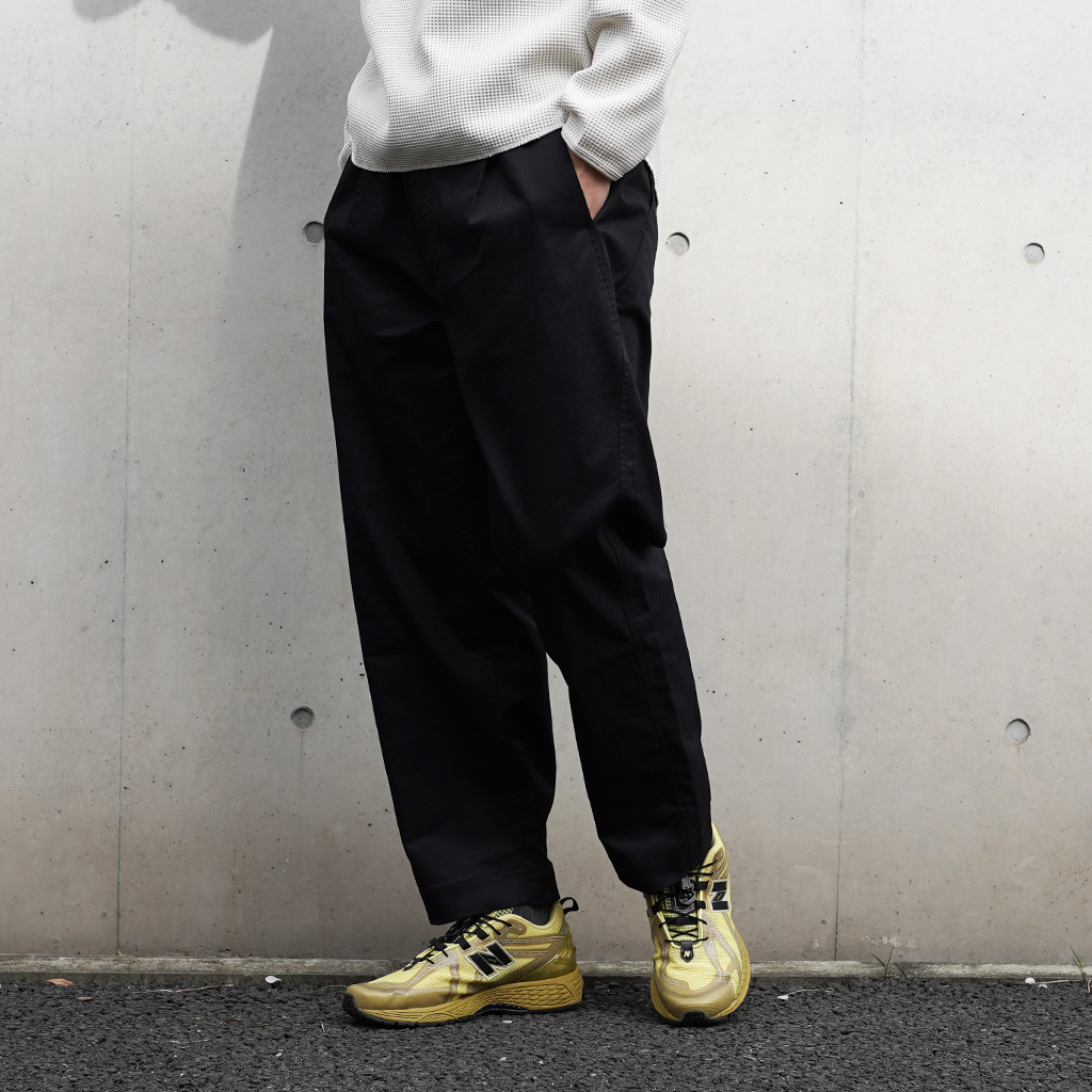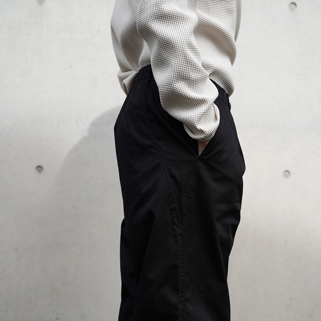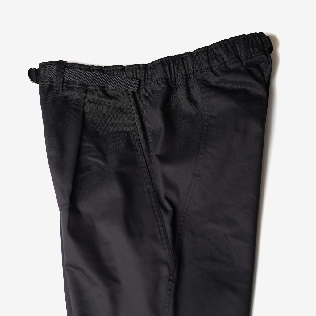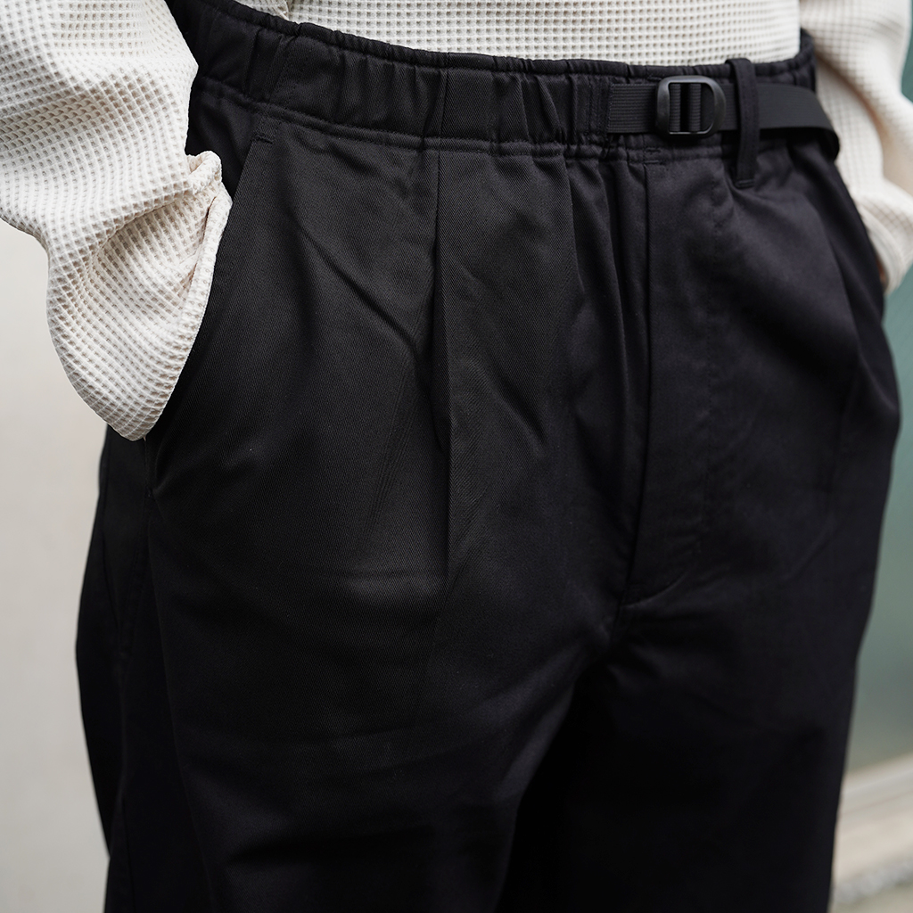 脚が動かしやすく機能的であること、立ち姿のシルエットが美しいことにこだわった【Goldwin】のパンツ。スポーツウエアブランドならではの設計や素材選び、快適性を維持しながらすっきりとした印象に見えるデザインが、年齢やジェンダーを問わず支持され、年々人気が高まっています。 また、ウォーキングやキャンプといったアクティブなシーンから、ジャケットを着用するようなビジネスシーン、そして日常使いまで。幅広いシーンで活用できる汎用性の高さから、シルエット違い、色違いで揃えるリピーターが多いのも際立つ特徴です。 『Twill Easy Pants』は、コットンツイルのような風合いとストレッチ性を両立させたパンツ。 生地には、ナチュラルな素材感をもたらすコットンと、ストレッチ性や形態安定性に優れたソロテックス、ペットボトルが原料のリサイクル素材を一部に使用したポリエステルを交織したツイル生地を採用。ウエストは平ゴムのイージー仕様で、バックルでサイズ調節が可能。股下はフルレングスの設計で、マチを付けることで脚を動かしやすくしています。 ワンタックが入ったワイドストレートシルエットで、カジュアルな装いにフィット。両腰にポケットがあり、右側にはセキュリティポケットも配しています。バックポケットは、ヒップラインに沿うようカーブさせた切り替えラインを活かして配置。縫製をダブルステッチにしてパッカリングを出し、カジュアルな印象に仕上げました。環境への負荷に配慮して、素材の一部にリサイクル糸を使用しています。