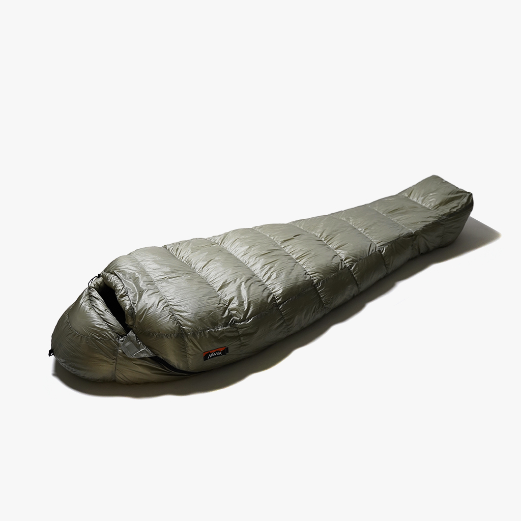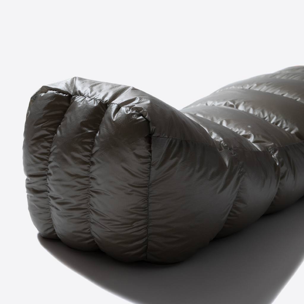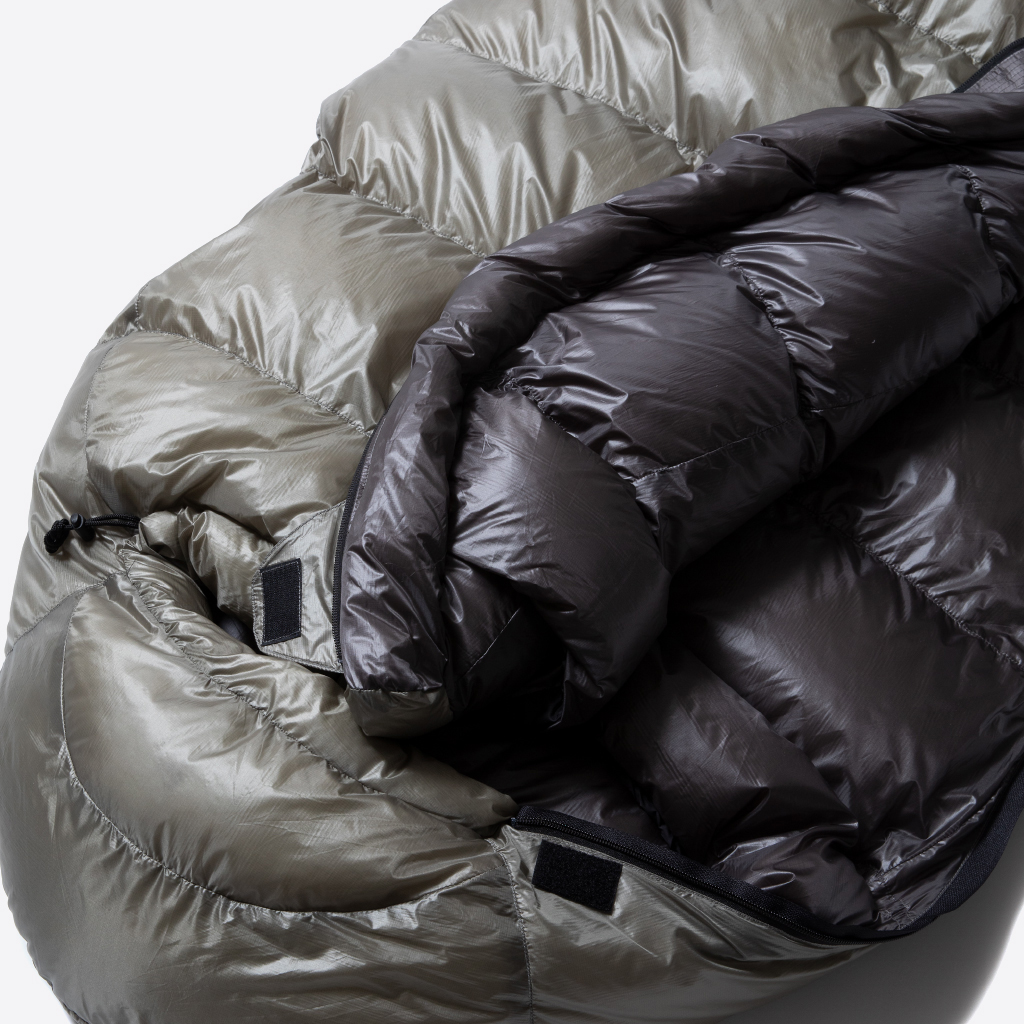 その問題を軽減させるため、NANGAとYKKのタッグにより特殊パーツを開発。噛み込み原因となる隙間を減らすことで、噛み込み発生を軽減し、噛み込みが起きた際の生地へのダメージも軽減しています。しかもこの特殊パーツは、暗闇でも操作しやすい様に蓄光仕様になっています。ショルダーウォーマーとドラフトチューブの2つを備えることで、冷気の侵入を大幅に防ぎます。今回の別注でかなりこだわったグレーのカラーリング。コードロックの付いたドローコードで、フィット感をスムーズに調整できます。寒さを感じやすい足元には羽毛を多めに封入しています。トップ部分にループを追加。吊り下げて乾かしたり、保管するのに便利です。NMGロゴはさりげなく配置しています。しなやかで包まれるような肌触り。NMG別注シリーズのスペック一覧。夏から厳冬期まで用途に応じて選べます。