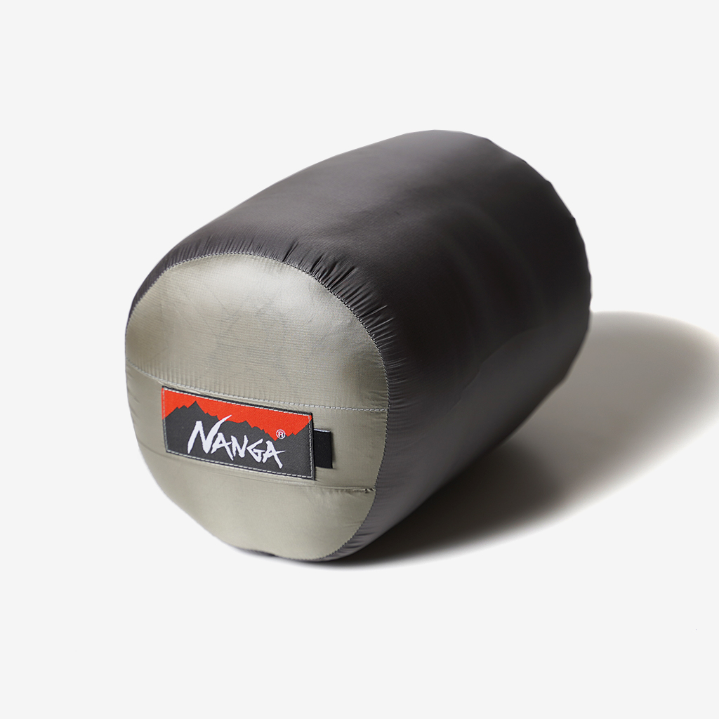 品のあるグレーのカラーリングで、レギュラー、ショートの2サイズ展開。ダウンに負荷を掛けずに保管できるメッシュバッグをセットにしました。NANGAとNicetimeのタグ。