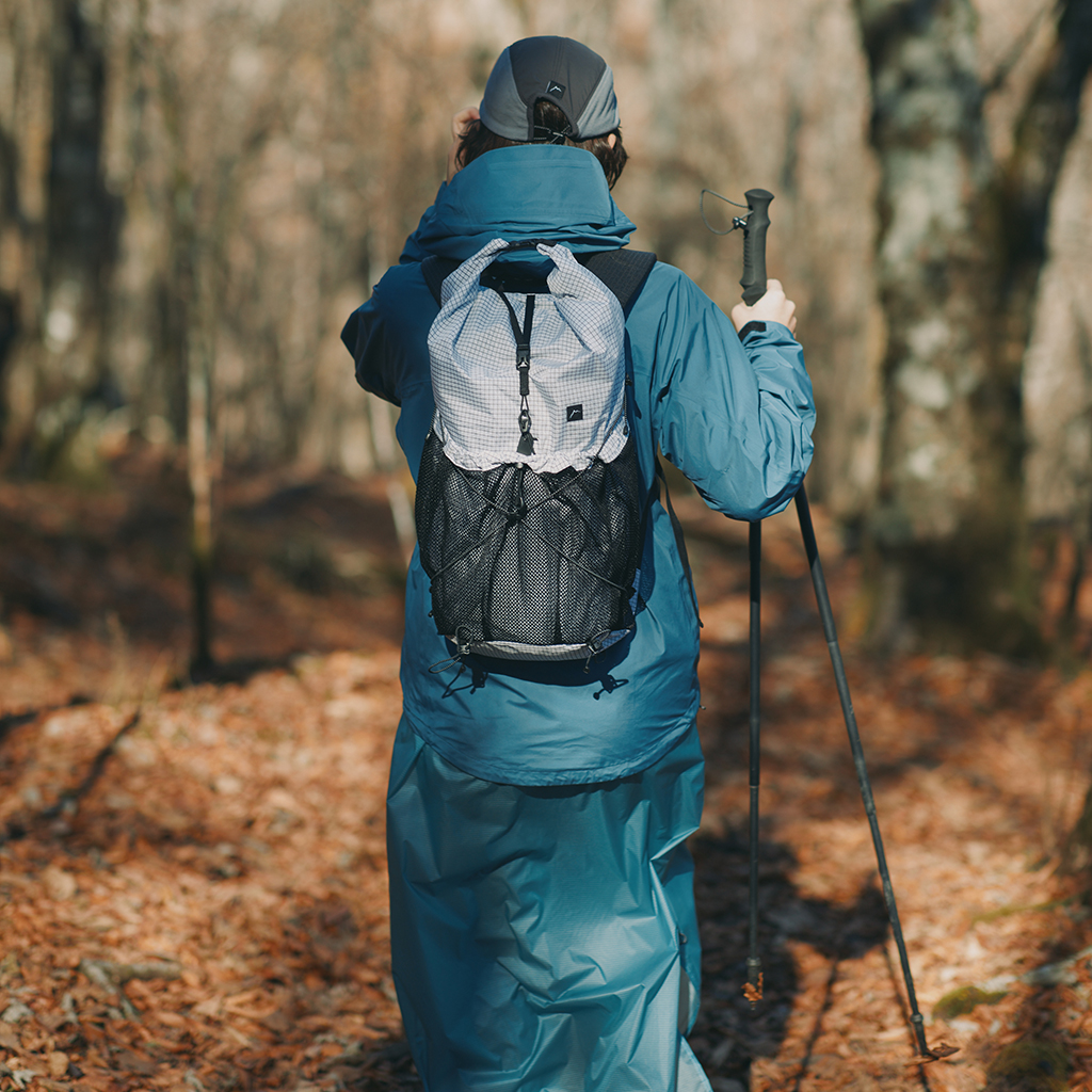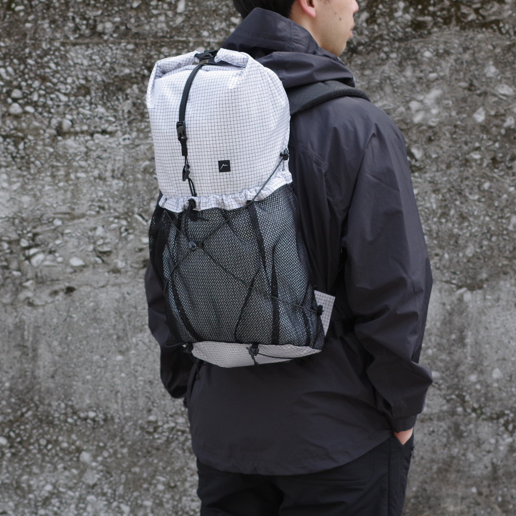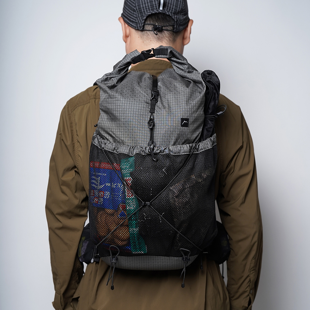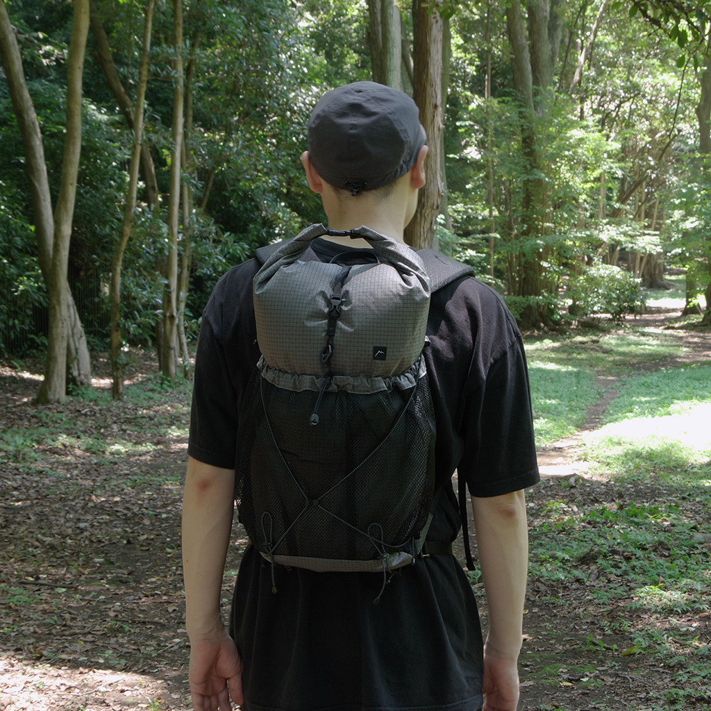 韓国のU.Lハイキングシーンを牽引するガレージブランドCAYL(ケイル)のGayaは、タウンユースから、デイハイキング、さらにULハイカーであれば長距離ハイキングにも使用可能なサイズのバックパック。 デイハイクに適したサイズですが、メッシュポケットやボトムに標準装備されたバンジーコードを活用すれば、ミニマリストハイカーであれば、夏山オーバーナイトハイクでも十分楽しめます。 約18-22Lサイズで、使い勝手と見た目の良さのバランスの良いバックパックは探すとあまり無いのが現状です。 メイン素材はCAYL B-GRID FABRICを使用。外側には使い勝手の良い大きなメッシュポケット付き。重さも約421gと軽量で申し分ありません。たるみを防止するフックも付いているので、外ポケットがだらしなく広がりすぎてしまうことがありません。僕みたいにボトルや行動食など何でも外ポケットに入れてしまうズボラな人にも嬉しい仕様。 ポケット外側のバンジーコードで、マットやアウターを挟むことも可能です。背面には取り外し可能なフォームパッドが標準装備。休憩時のマットやサブマットとしても。もちろんサイズが合えば、自分好みのマットに変更しても構いません。貴重品などを収納できるよう、内部にはジッパー付きポケットを配置しています。 ショルダーハーネスもしっかりとした厚みがあり、バックパックの軽量化に挑戦したい人にも安心しておすすめできます。 カラー:Black カラー:Beige カラー:White カラー:Grey 安心感のあるショルダーハーネス。 ※2022年7月入荷分より、背面がメッシュ仕様にアップデートされました。 ロールトップ上部はベルクロ仕様になっていて、バックルで留めなくても使用できます。 メッシュポケットのたるみを防止するフック付き。 ボトムに標準装備されたバンジーコードで、スリーピングマットやトレッキングポールを持ち運べます。 チェストストラップのバックルはホイッスル付き。 ウエストベルトは取り外し可能。 別売のStretch Pocket Hip Beltに付け替えれば、より腰で支えられます。 モデル:182cm モデル:175cm モデル:158cm のんびりデイハイクを想定したパッキング例。 コーヒーセット、レジャーシート、ハンモック、トレッキングポール、晴雨兼用傘、防寒着など。 夏のULスタイルのテント泊を想定したパッキング例。 フロアレスシェルター、テントポール、エアマット、夏用シュラフ、レインウェア上下、防寒着、ヘッドライト、クッカー、食料など。 デイハイクから、季節や装備次第ではテント泊まで、使い勝手の良いCAYLのロングセラーパックです。