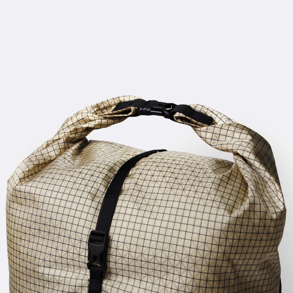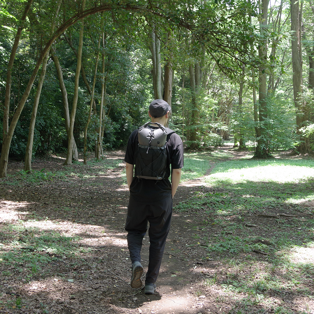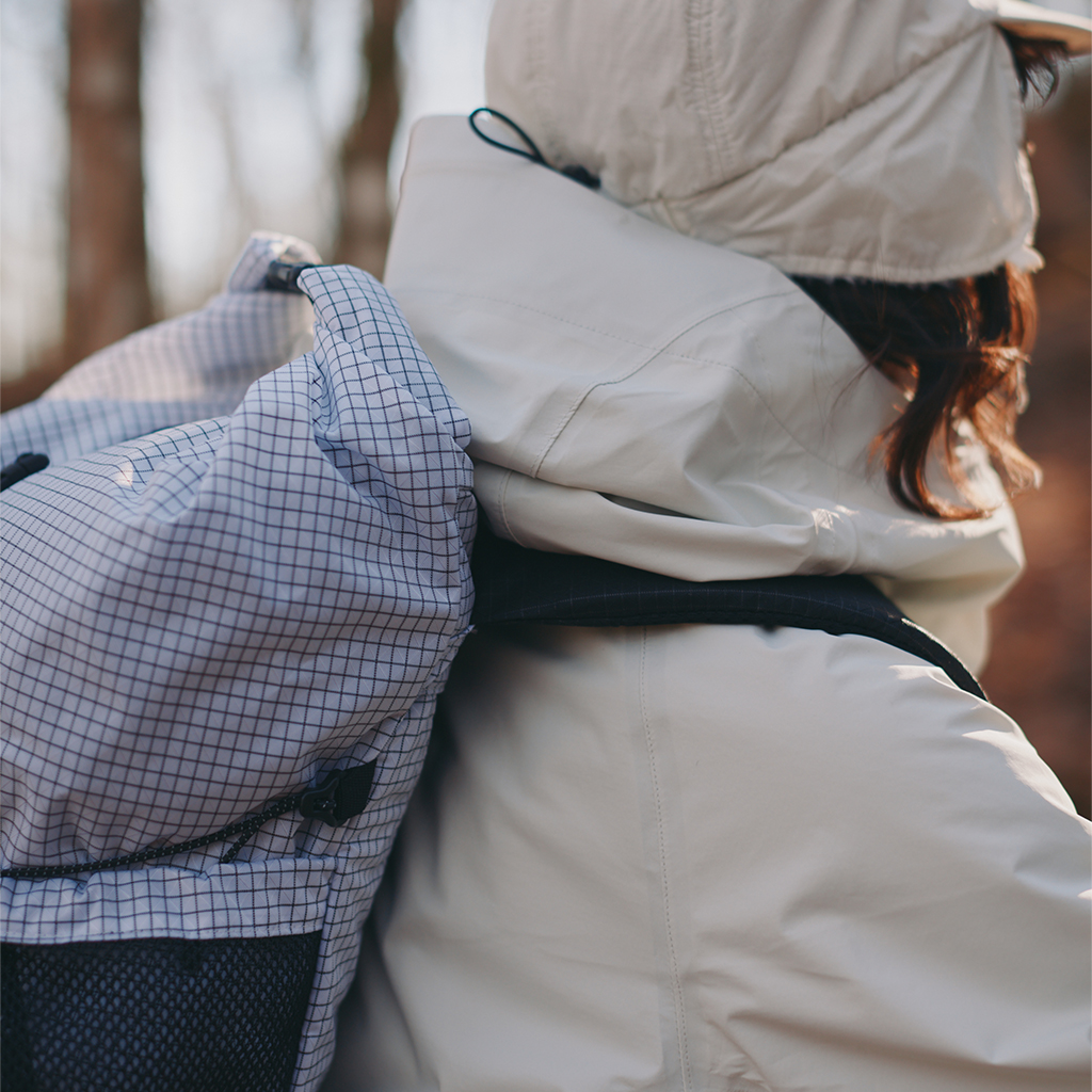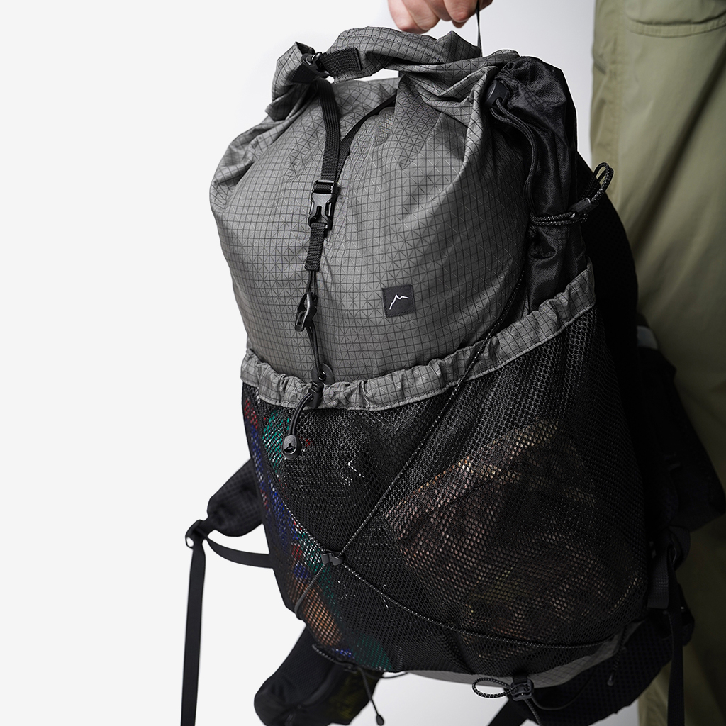 韓国のU.Lハイキングシーンを牽引するガレージブランドCAYL(ケイル)のGayaは、タウンユースから、デイハイキング、さらにULハイカーであれば長距離ハイキングにも使用可能なサイズのバックパック。 デイハイクに適したサイズですが、メッシュポケットやボトムに標準装備されたバンジーコードを活用すれば、ミニマリストハイカーであれば、夏山オーバーナイトハイクでも十分楽しめます。 約18-22Lサイズで、使い勝手と見た目の良さのバランスの良いバックパックは探すとあまり無いのが現状です。 メイン素材はCAYL B-GRID FABRICを使用。外側には使い勝手の良い大きなメッシュポケット付き。重さも約421gと軽量で申し分ありません。たるみを防止するフックも付いているので、外ポケットがだらしなく広がりすぎてしまうことがありません。僕みたいにボトルや行動食など何でも外ポケットに入れてしまうズボラな人にも嬉しい仕様。 ポケット外側のバンジーコードで、マットやアウターを挟むことも可能です。背面には取り外し可能なフォームパッドが標準装備。休憩時のマットやサブマットとしても。もちろんサイズが合えば、自分好みのマットに変更しても構いません。貴重品などを収納できるよう、内部にはジッパー付きポケットを配置しています。 ショルダーハーネスもしっかりとした厚みがあり、バックパックの軽量化に挑戦したい人にも安心しておすすめできます。 カラー:Black カラー:Beige カラー:White カラー:Grey 安心感のあるショルダーハーネス。 ※2022年7月入荷分より、背面がメッシュ仕様にアップデートされました。 ロールトップ上部はベルクロ仕様になっていて、バックルで留めなくても使用できます。 メッシュポケットのたるみを防止するフック付き。 ボトムに標準装備されたバンジーコードで、スリーピングマットやトレッキングポールを持ち運べます。 チェストストラップのバックルはホイッスル付き。 ウエストベルトは取り外し可能。 別売のStretch Pocket Hip Beltに付け替えれば、より腰で支えられます。 モデル:182cm モデル:175cm モデル:158cm のんびりデイハイクを想定したパッキング例。 コーヒーセット、レジャーシート、ハンモック、トレッキングポール、晴雨兼用傘、防寒着など。 夏のULスタイルのテント泊を想定したパッキング例。 フロアレスシェルター、テントポール、エアマット、夏用シュラフ、レインウェア上下、防寒着、ヘッドライト、クッカー、食料など。 デイハイクから、季節や装備次第ではテント泊まで、使い勝手の良いCAYLのロングセラーパックです。
