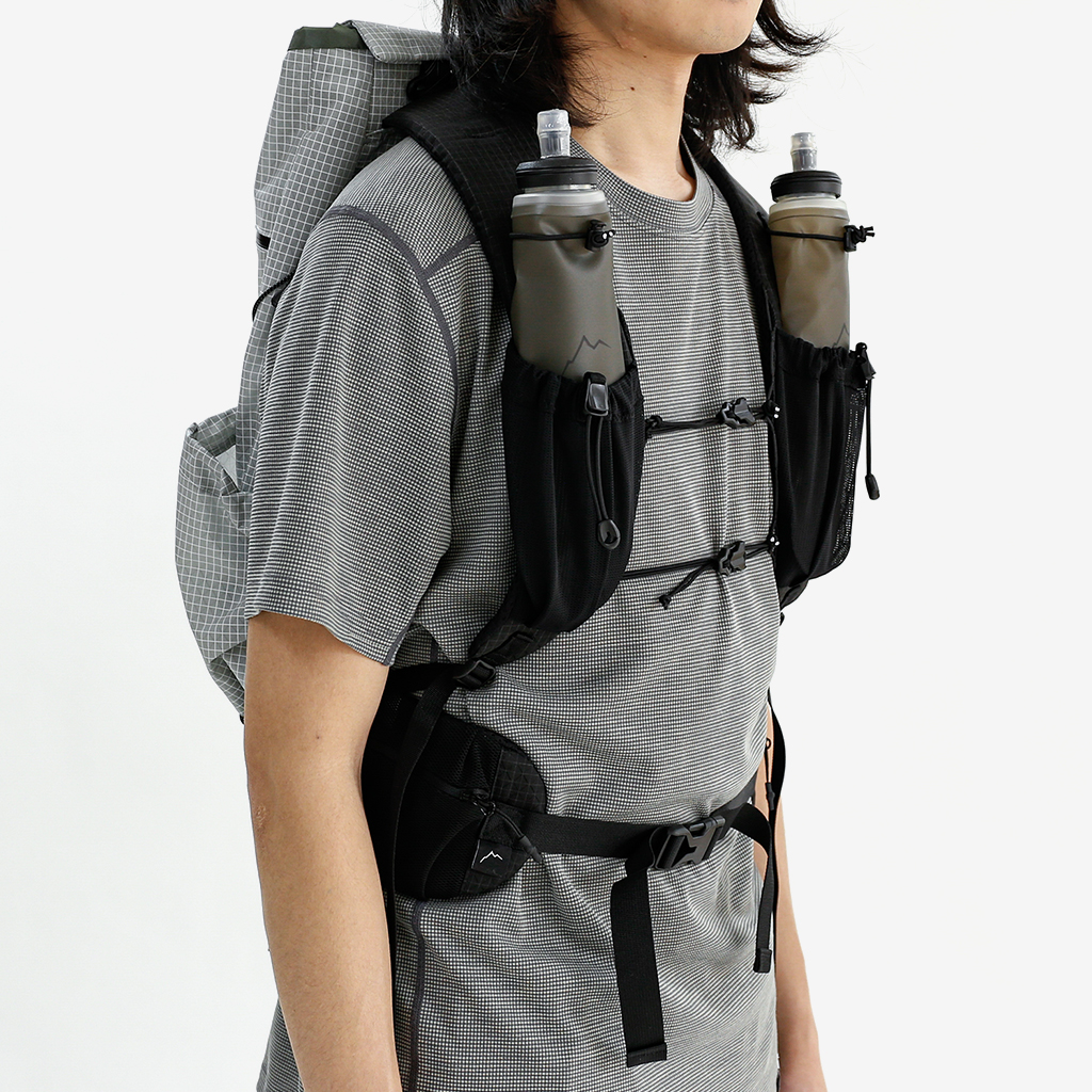 チェストストラップは上下に2か所。バックル式で、ベスト型のように身体にフィットするので、より軽快に行動できます。