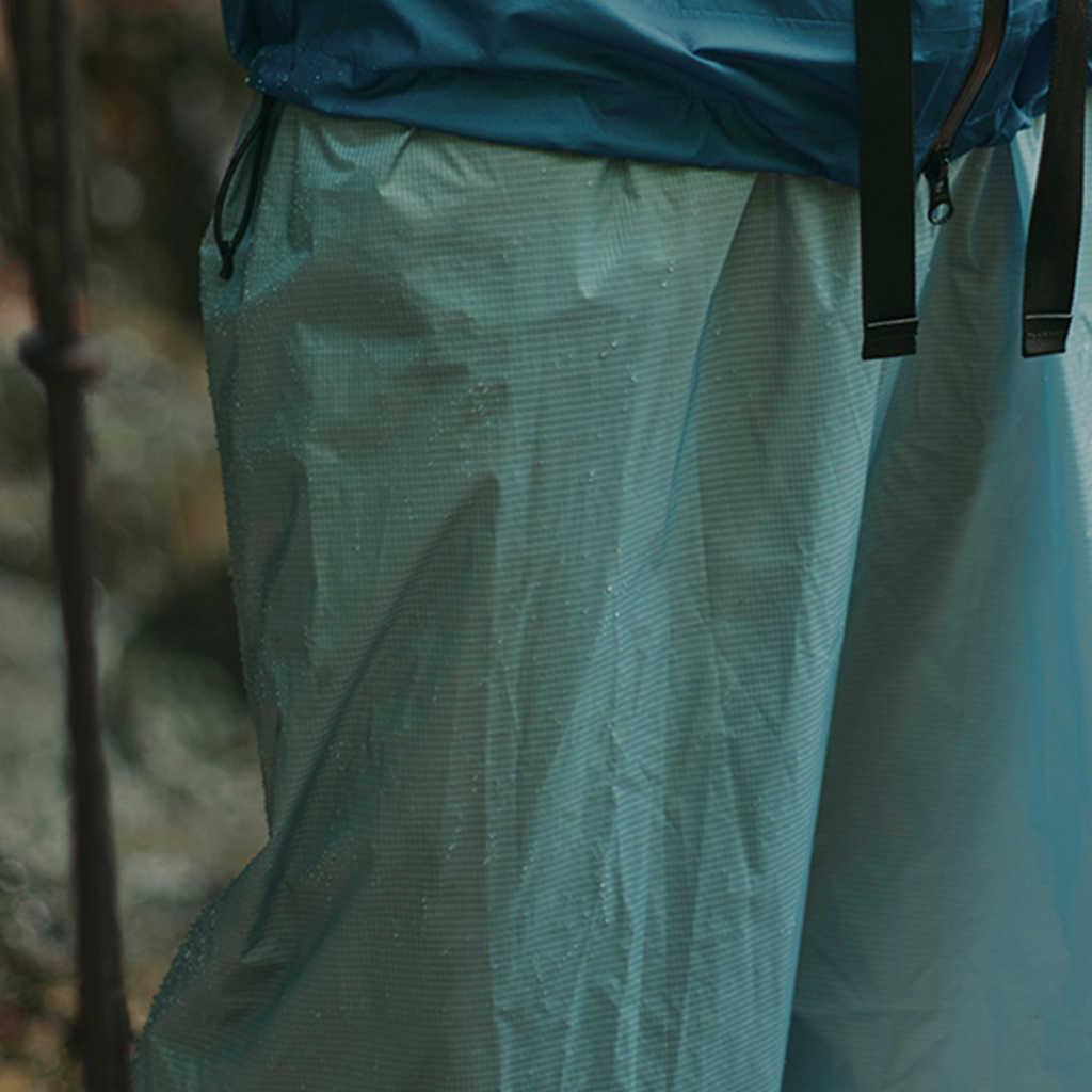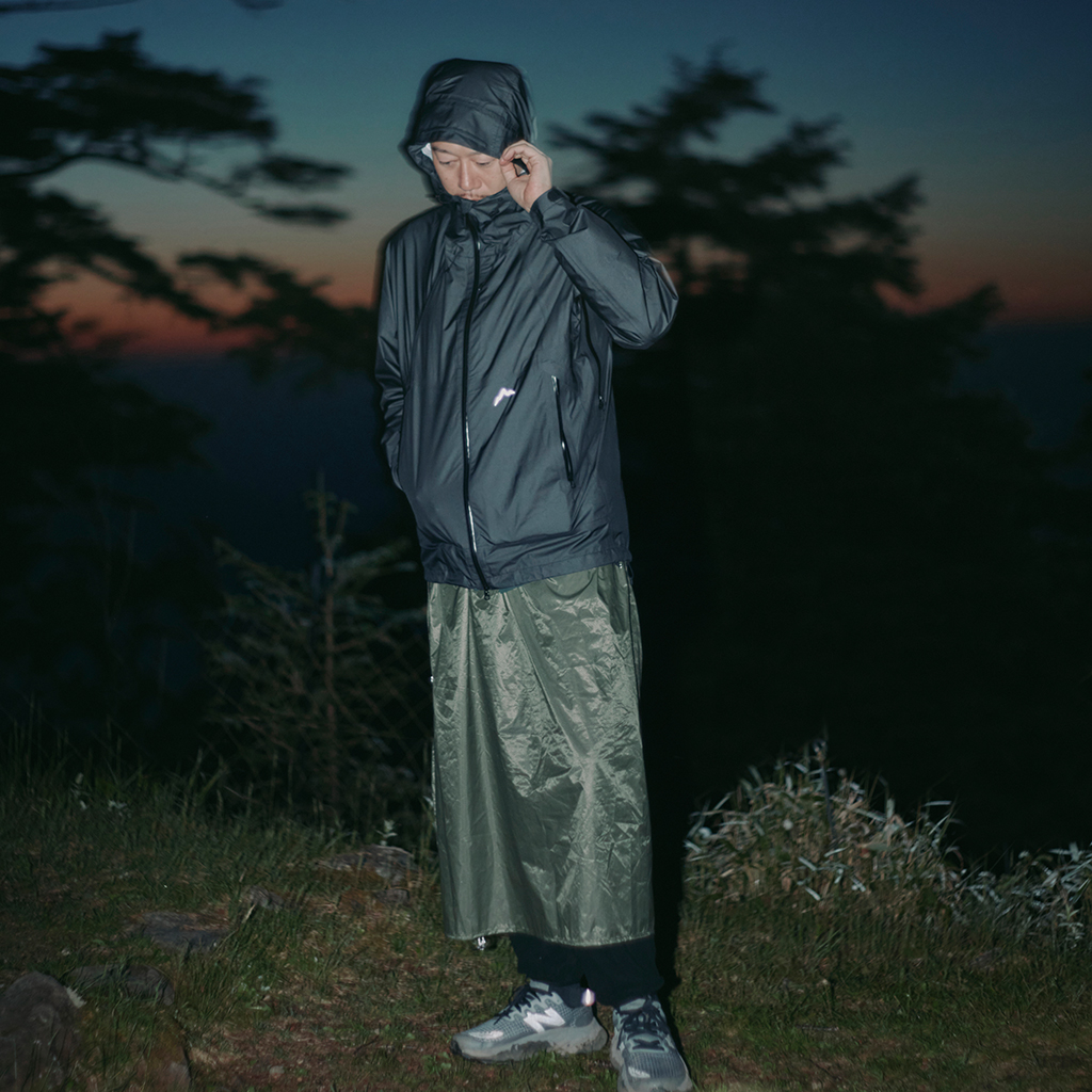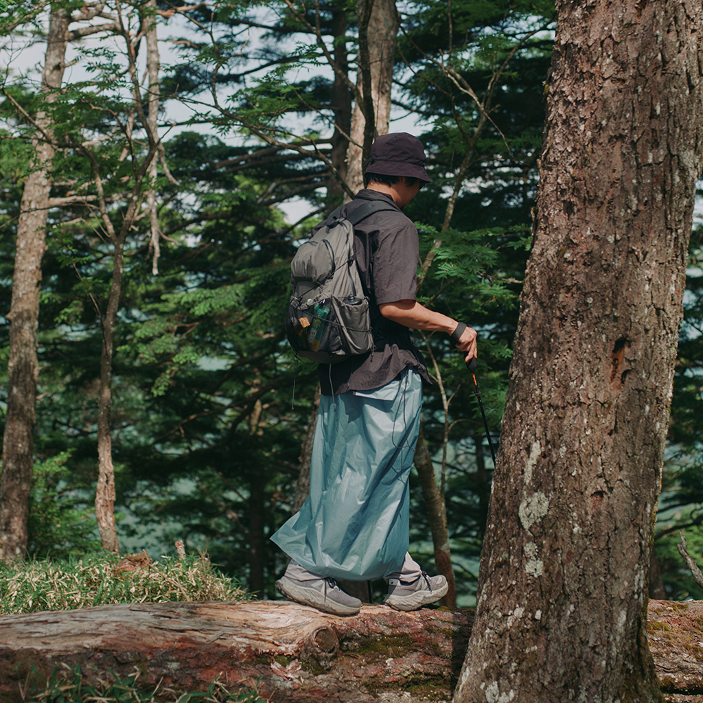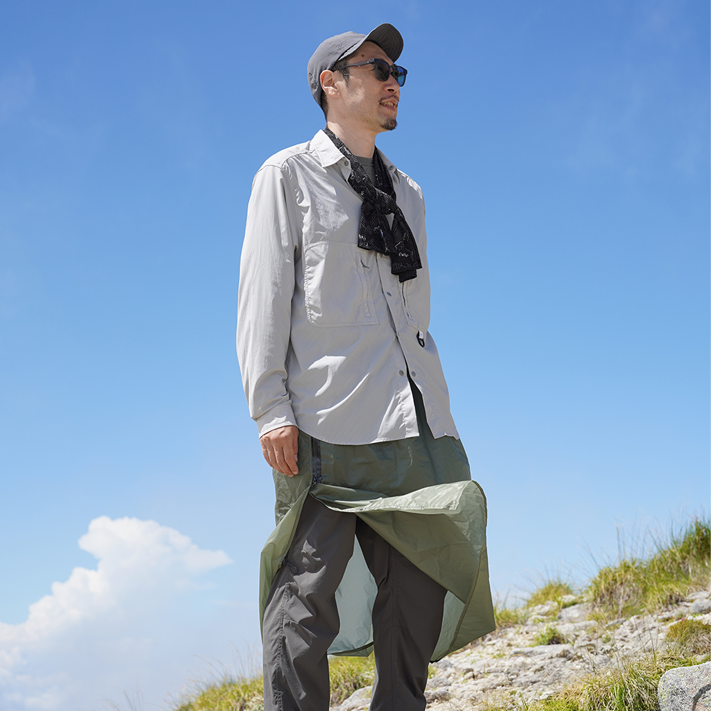 大雨の中、長時間行動するならもちろんレインパンツですが、ジャケットと違って着脱が手間だったり、蒸れやすいというデメリットもあって、ちょっとした雨なら履くのを躊躇してしまう方も少なくないのでは。 迷っているうちに気づいたらかなり濡れてしまったり、決意して履いたらすぐに雨が止んでしまったり、いつも持って行くのに使う使わないの判断が難しい。 そんな悩みをお持ちの方にこそオススメしたいのがレインスカートです。 CAYL『Hiking Skirt』は、レインスカートだけでなく、ポンチョのようにも着用できるユニークなアイテム。 上から被って、ウエスト部分をコードで絞るだけ、シューズを脱ぐ必要はもちろんありません。 ロング丈なので、小柄な方ならくるぶし辺りまで、背の高い方でもふくらはぎ辺りまでしっかりカバー。 足を大きく動かしたい時や、暑くなってきたら、スリットジッパーとバックルでスムーズに調整できます。 ポンチョとして使う時は、ウエストではなく肩の上あたりでコードを絞れば、上半身やバックパックを雨から防げます。 また、従来のレインウェアのように、簡易な防寒アイテムとしてもすごく使えます。休憩時やテント場でサッと腰に巻いたり、羽織ったり。 ポケットに収納可能なパッカブル仕様で、95gと軽量コンパクト。お守り代わりに気軽に持ち歩けるので、NMGスタッフはタウンユースでも愛用しています。 レインパンツとは一味違う、出番の多い気軽な防水防寒アイテムです。 カラー:Black カラー:Khaki カラー:Blue ウエスト部分はストリングコードで調整します。 胴体部分はジッパーとバックルで開き具合を調整できます。 ポケットに収納可能なパッカブル仕様。 モデル/184cm