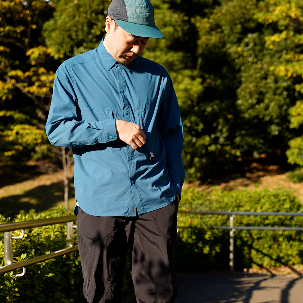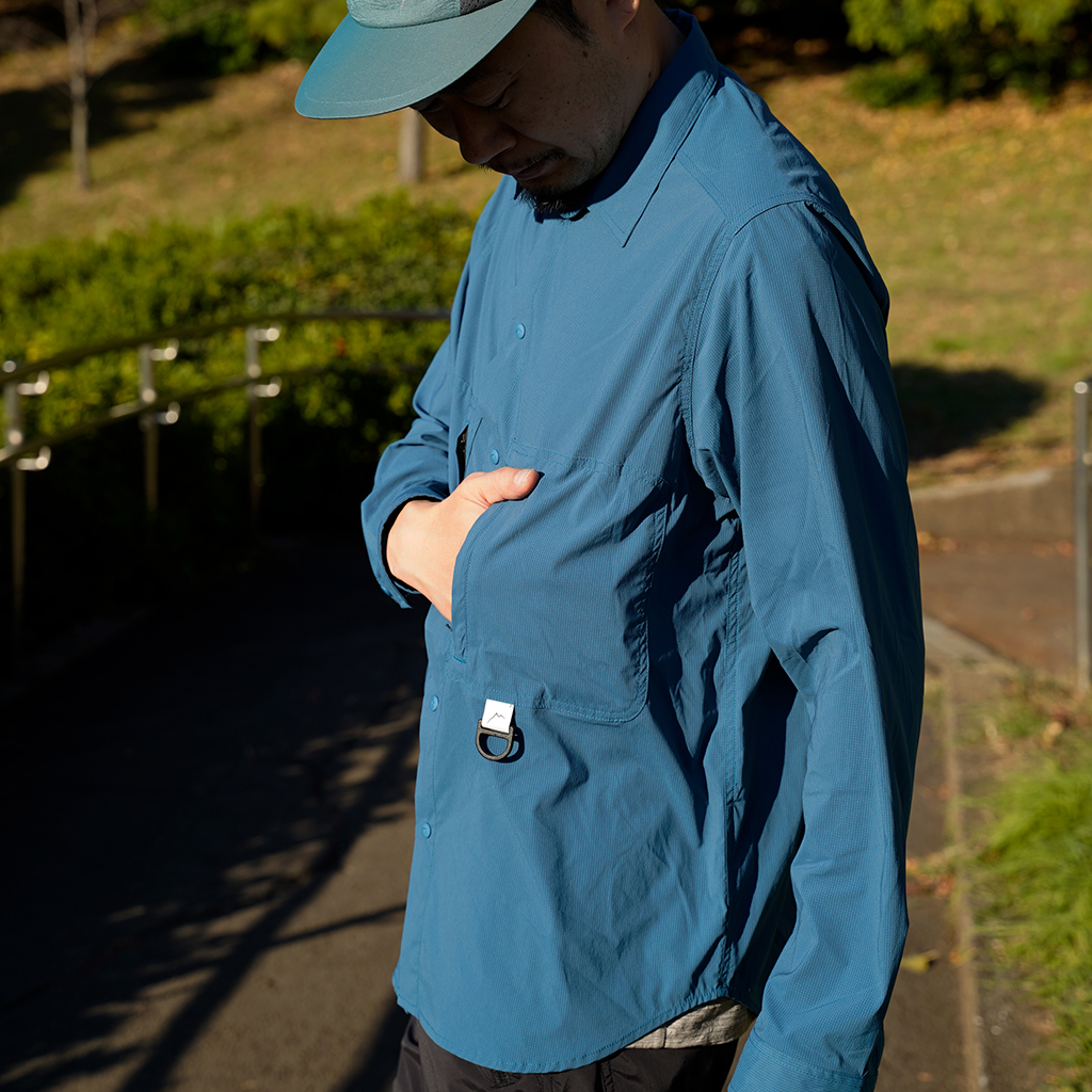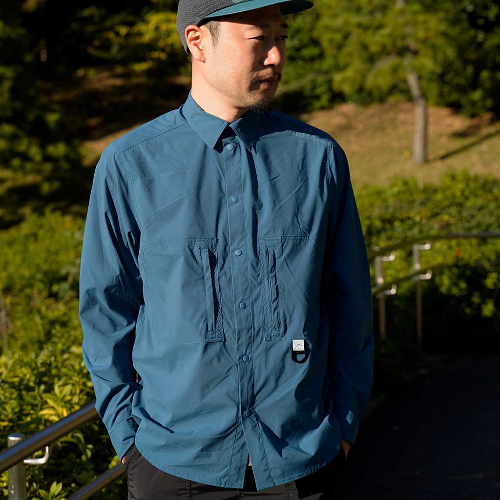CAYL『Stretch Nylon Hiker Shirts』は、ストレッチの効いたスナップボタンタイプのシャツ。 薄手ながら撥水コーティングが施され、バックパックを背負っても干渉しづらいように、両胸にジッパー付きポケットを備えます。 軽量でコンパクトになるので荷物の負担にならず、幅広いシーンで活躍します。ハイキングはもちろん、自転車や旅にも◎ インナーやアウターとのレイヤリングで、1年を通して活躍するCAYLの定番シャツです。 ※襟元内側のタグのカラーは、ロットにより異なる場合があります。 すべてスナップボタンなので、通常の縫い付けボタンの様な糸切れによるボタン紛失の心配がありません。 バックパックを背負ってもショルダーハーネスと干渉しないよう、内側にジッパーが配置されています。 Dリングには、小さなポーチやタオルを取り付けるのも便利。 ハンガーがない時にはフックに吊り下げるのに使ってもOK。 ボタンにさりげなくCAYLのロゴが刻印されています。 モデル:184cm/Lサイズ モデル:182cm/XLサイズ