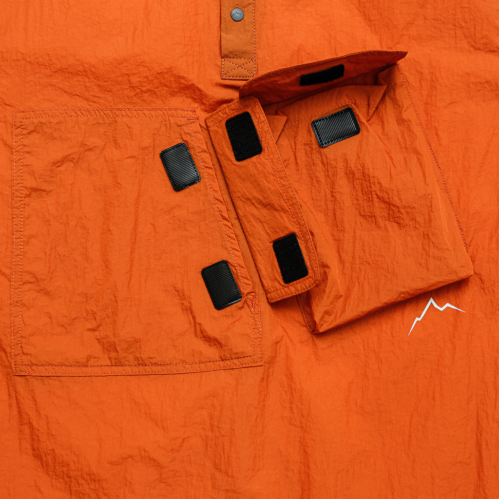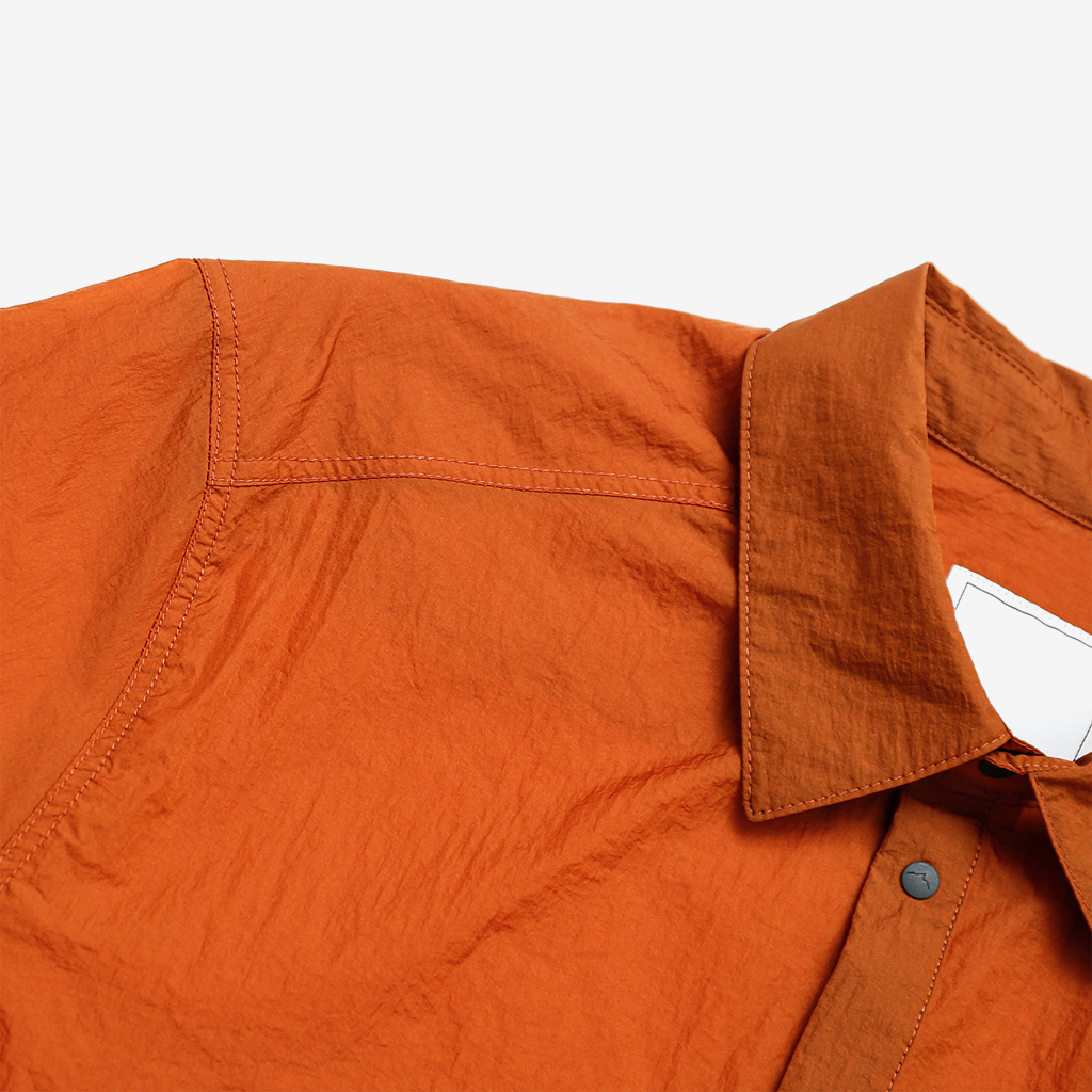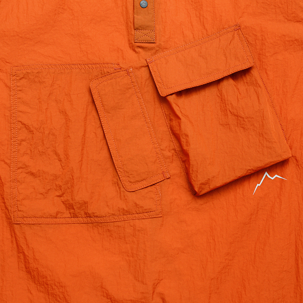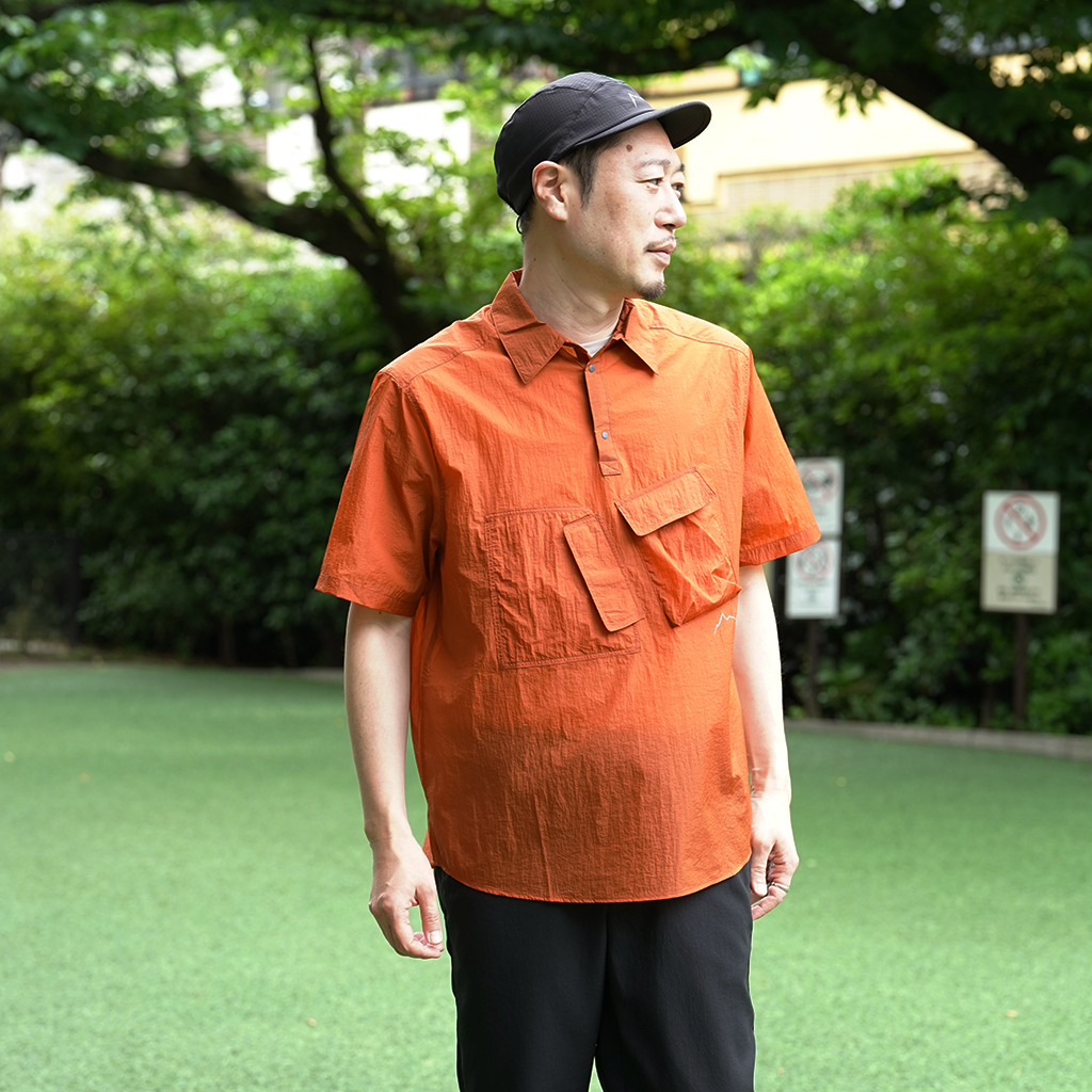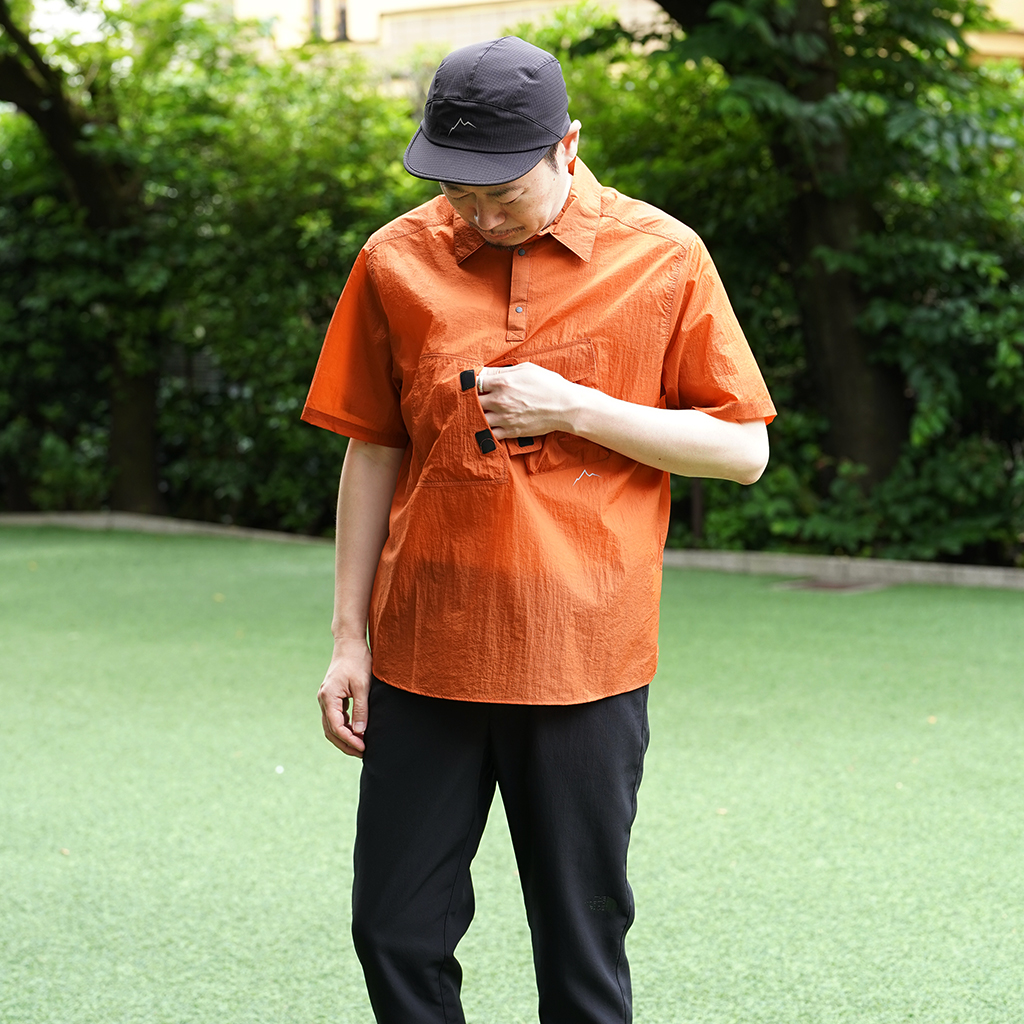 CAYL『Light Pullover Shirts』は、15Dナイロンと薄手ながら撥水コーティングが施されたスナップボタンタイプのプルオーバー半袖シャツ。 ワッシャー加工による自然なシワが柔らかな風合いを生み出しています。 バックパックを背負っても干渉しづらい位置に、フラップ付きポケットを備えます。 適度な防風性と通気性を持ち、軽量でコンパクトになるので荷物の負担にならず、幅広いシーンで活躍します。暑い時期のハイキングはもちろん、自転車や旅にも◎ モデル:182cm / Lサイズ