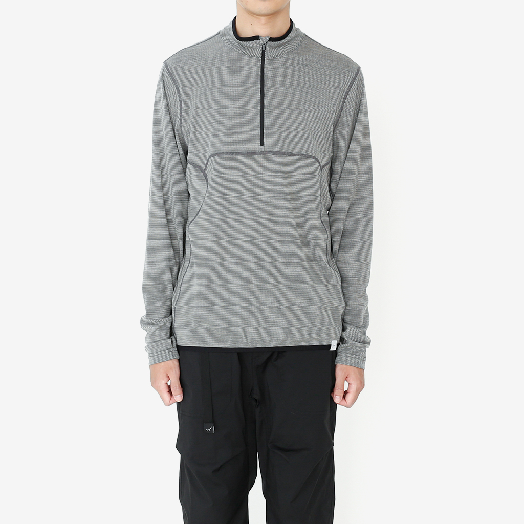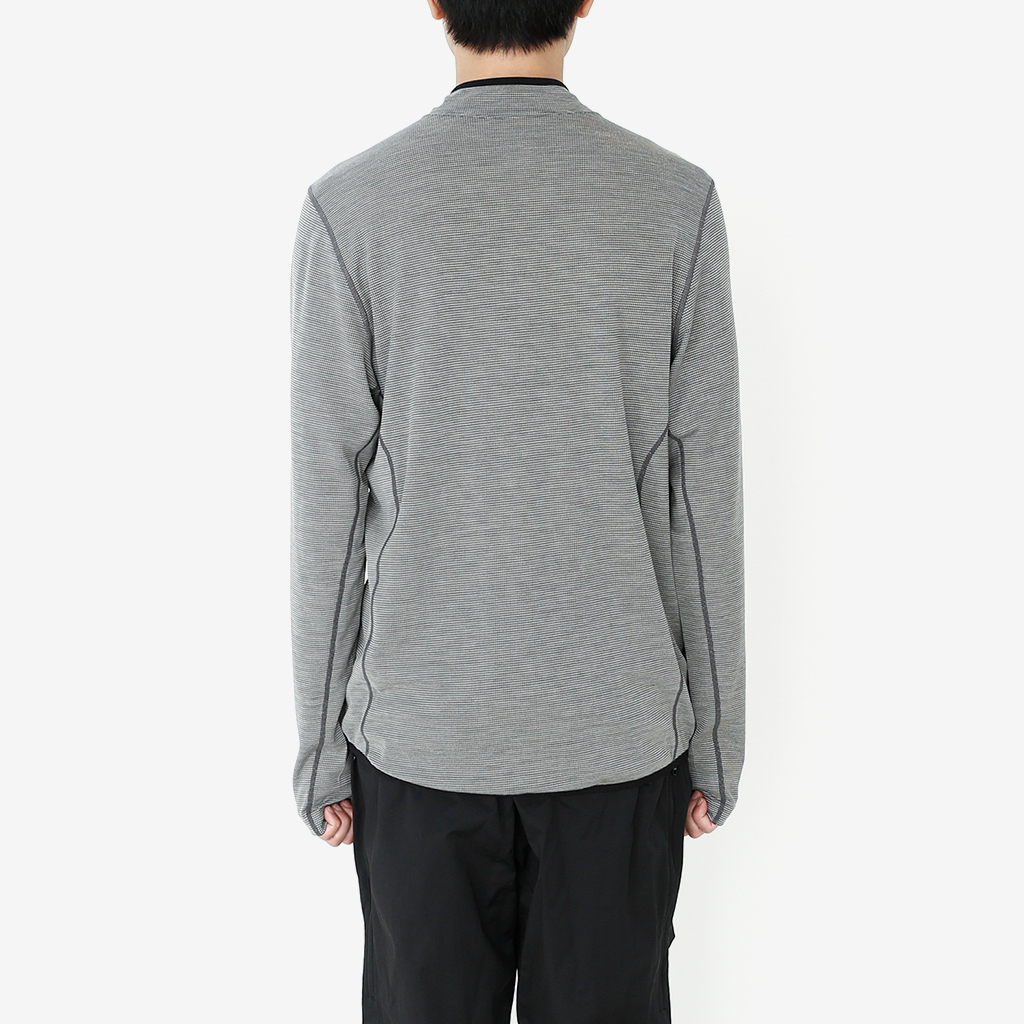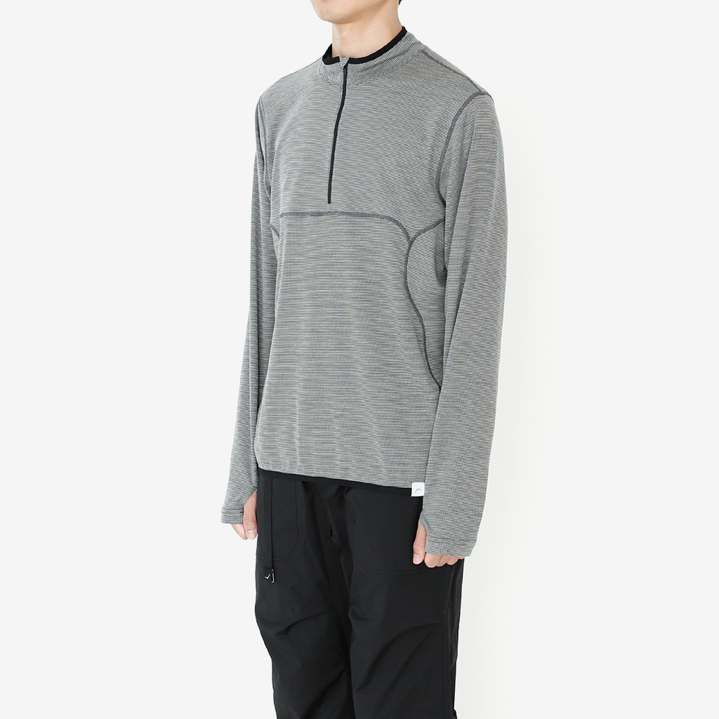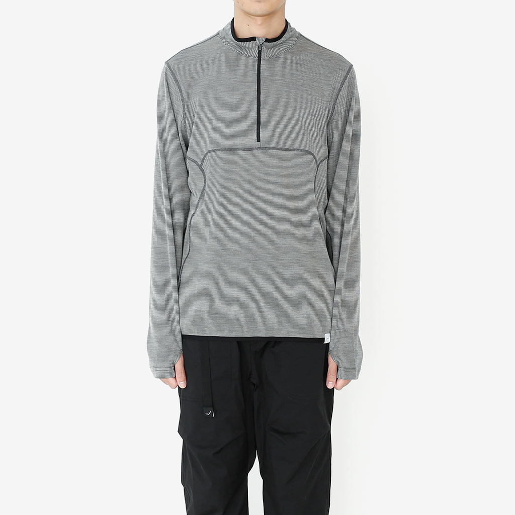 CAYL『Live Wool Mix Half Zip』は、メリノウールとクールマックスをメインに織られた韓国GRUBIG社のLive Wool素材を使ったロングスリーブ。 メリノウールの持つ抗菌、消臭、保温機能に加え、クールマックスの吸湿速乾性も併せ持ちます。 生地の耐久性も高く、イージーケアなところも特徴。気軽にメリノウールの良さを味わえます。表面は凹凸があるので、1枚でサラッと着ても。 首元のスタンドカラーと袖口のサムホールが防寒性を高め、暑くなったらジップを開けて換気できます。 薄すぎず厚すぎない絶妙な生地厚で、1年を通して出番の多い万能ハーフジップロングスリーブです。 袖口はサムホール仕様。 モデル:184cm/Lサイズ