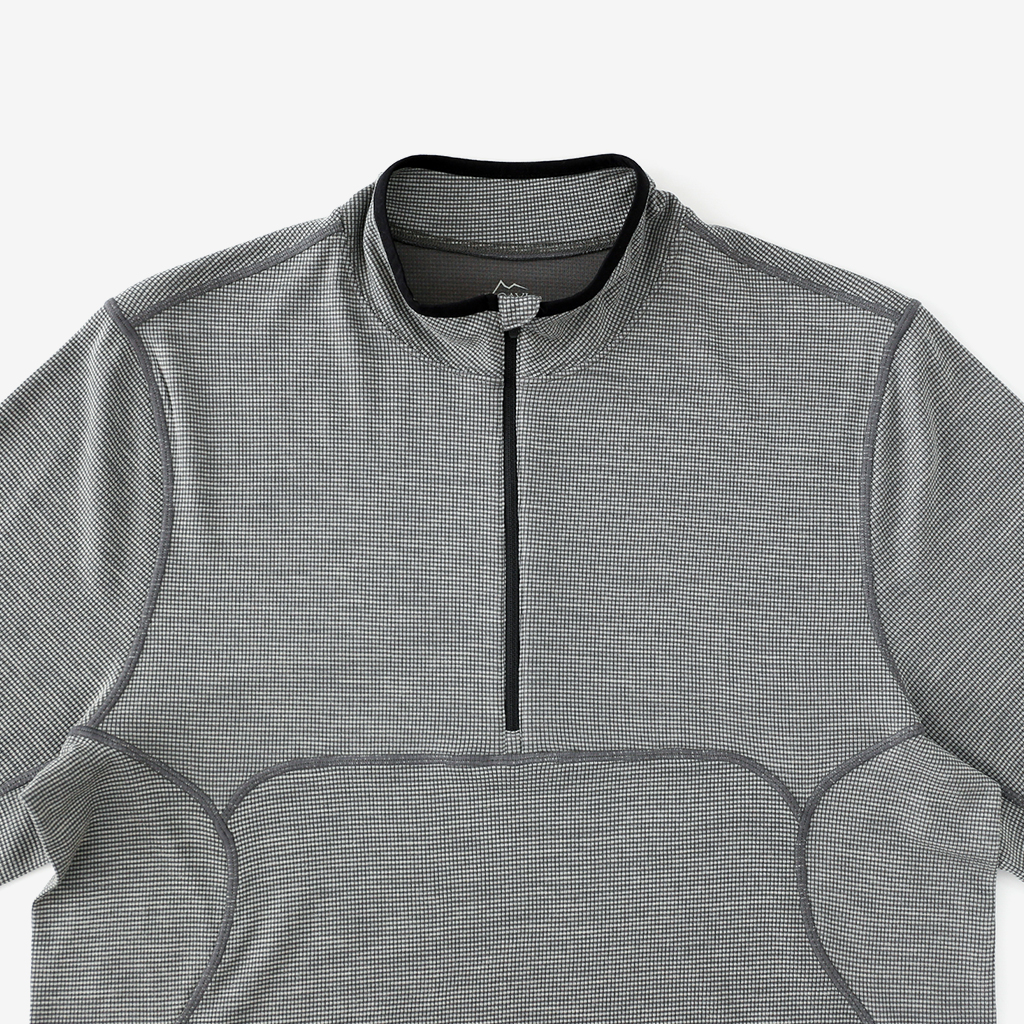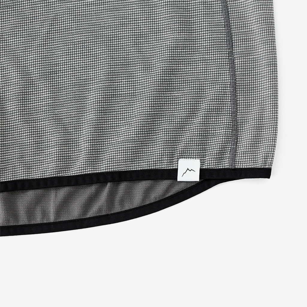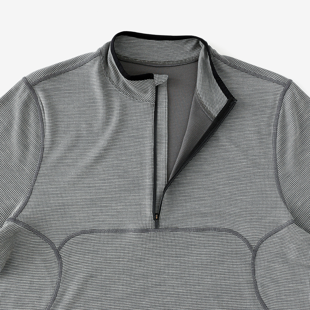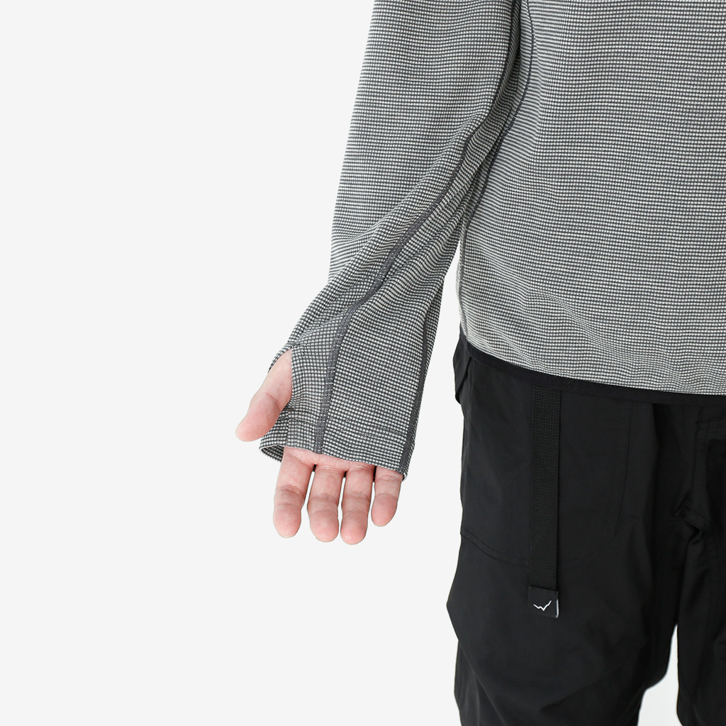 CAYL『Live Wool Mix Half Zip』は、メリノウールとクールマックスをメインに織られた韓国GRUBIG社のLive Wool素材を使ったロングスリーブ。 メリノウールの持つ抗菌、消臭、保温機能に加え、クールマックスの吸湿速乾性も併せ持ちます。 生地の耐久性も高く、イージーケアなところも特徴。気軽にメリノウールの良さを味わえます。表面は凹凸があるので、1枚でサラッと着ても。 首元のスタンドカラーと袖口のサムホールが防寒性を高め、暑くなったらジップを開けて換気できます。 薄すぎず厚すぎない絶妙な生地厚で、1年を通して出番の多い万能ハーフジップロングスリーブです。 袖口はサムホール仕様。 モデル:184cm/Lサイズ