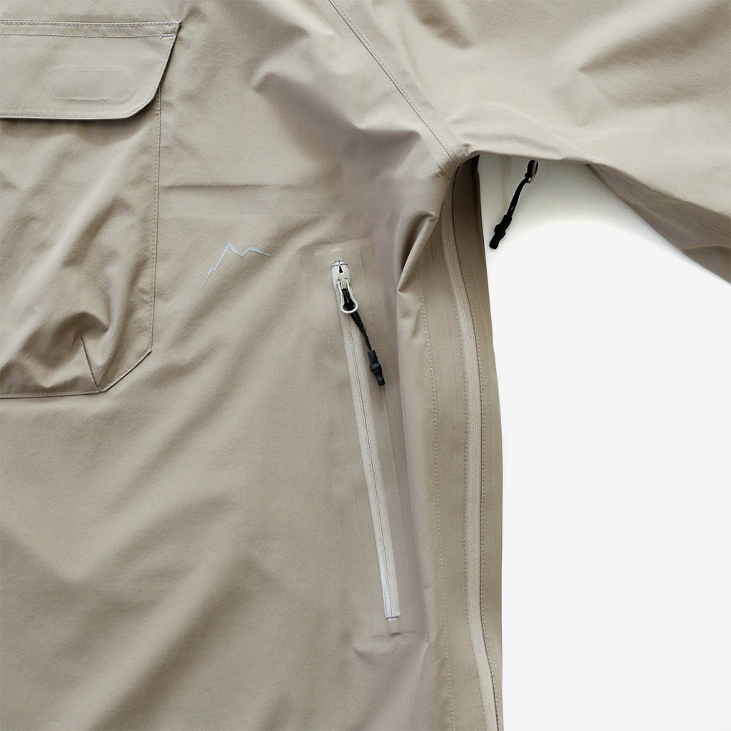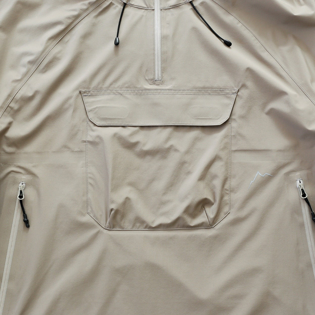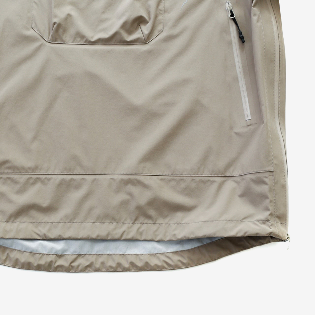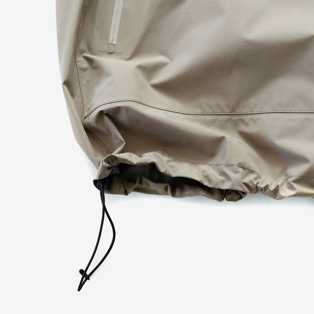 CAYL『Light Shield Anorak 2』は、Pertex Shield Nylon 3Layerを生地に採用したレインジャケット。 肌に触れる面は、7Dトリコート接着で肌触りが非常に柔らかく、3Layerのコーティングを薄くすることができるので、とてもしなやかでストレスフリーな着心地です。 20,000 mmの耐水圧、20,000 g/m2/24hの透湿性を誇り、大雨でも安心のスペック。 フロント両サイドにはジッパーポケット、正面にはフラップ式の大型ポケットを配置。 両脇の下にはダブルジッパー式のベンチレーションがあり、行動中に素早く換気できます。また左脇側は下までオープンジッパーで大きく開けられるので、プルオーバーながら脱ぎ着はスムーズ。 フード部とウエスト部はストリングで絞れるようになっていて、手首はベルクロで調整できます。 アクティビティに適した十分なスペック、使い勝手を追求しながらも、タウンユースにも馴染むデザイン性に優れた、幅広いシチュエーションに適した汎用性の高いレインジャケットです。 フード部もストリングで簡単に調整できます。 フロントの大型フラップポケット。グローブをしたままでも簡単に開け閉めできます。 右脇下のダブルジッパー式のベンチレーション。 左脇側は下までオープンジッパーで大きく開けられるので、プルオーバーながら脱ぎ着は簡単。クイックに換気もできます。 裾もストリングで簡単に調整できます。 袖の調整はベルクロタイプ。 モデル:184cm / Lサイズ