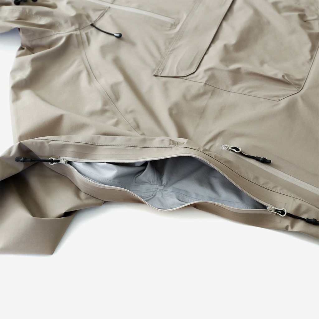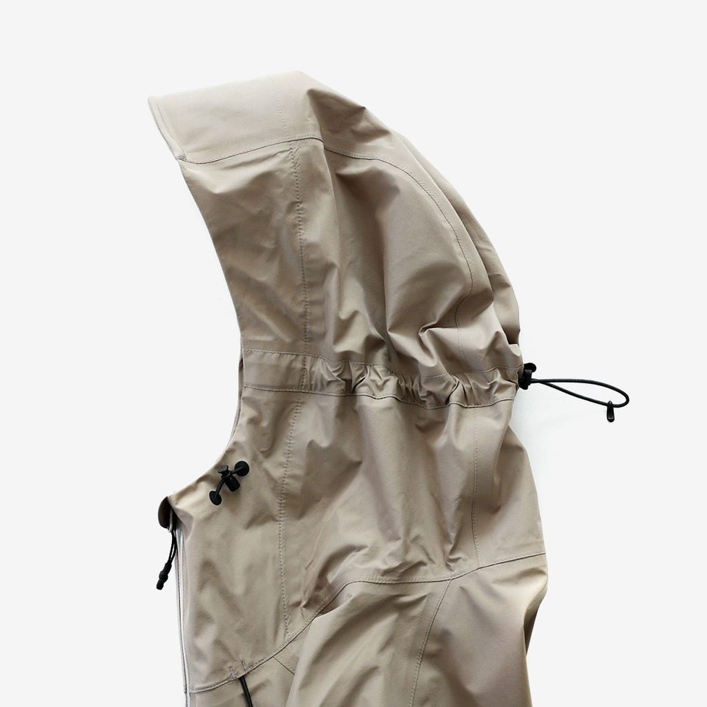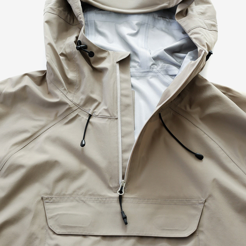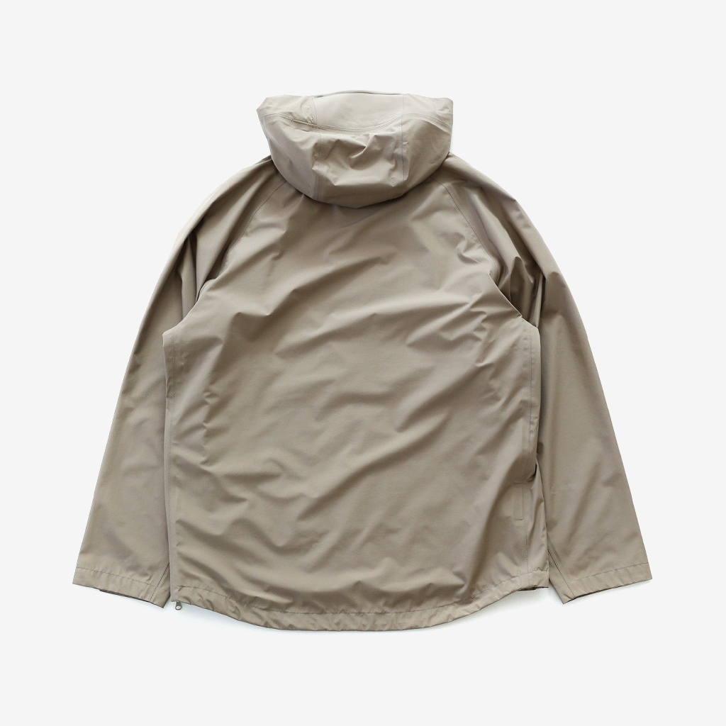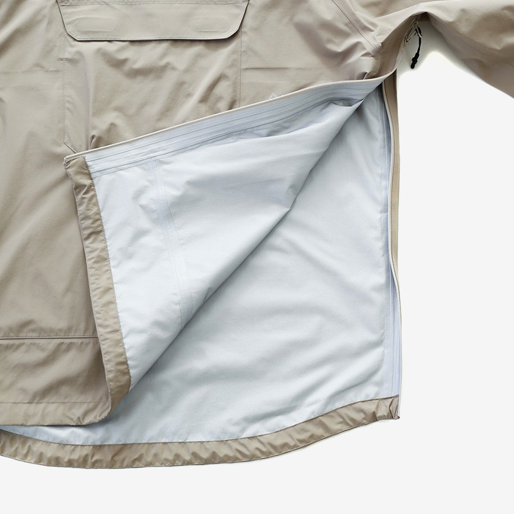 CAYL『Light Shield Anorak 2』は、Pertex Shield Nylon 3Layerを生地に採用したレインジャケット。 肌に触れる面は、7Dトリコート接着で肌触りが非常に柔らかく、3Layerのコーティングを薄くすることができるので、とてもしなやかでストレスフリーな着心地です。 20,000 mmの耐水圧、20,000 g/m2/24hの透湿性を誇り、大雨でも安心のスペック。 フロント両サイドにはジッパーポケット、正面にはフラップ式の大型ポケットを配置。 両脇の下にはダブルジッパー式のベンチレーションがあり、行動中に素早く換気できます。また左脇側は下までオープンジッパーで大きく開けられるので、プルオーバーながら脱ぎ着はスムーズ。 フード部とウエスト部はストリングで絞れるようになっていて、手首はベルクロで調整できます。 アクティビティに適した十分なスペック、使い勝手を追求しながらも、タウンユースにも馴染むデザイン性に優れた、幅広いシチュエーションに適した汎用性の高いレインジャケットです。 フード部もストリングで簡単に調整できます。 フロントの大型フラップポケット。グローブをしたままでも簡単に開け閉めできます。 右脇下のダブルジッパー式のベンチレーション。 左脇側は下までオープンジッパーで大きく開けられるので、プルオーバーながら脱ぎ着は簡単。クイックに換気もできます。 裾もストリングで簡単に調整できます。 袖の調整はベルクロタイプ。 モデル:184cm / Lサイズ