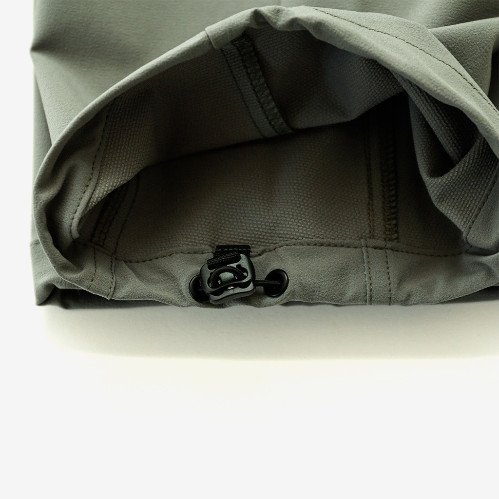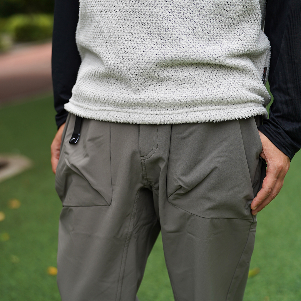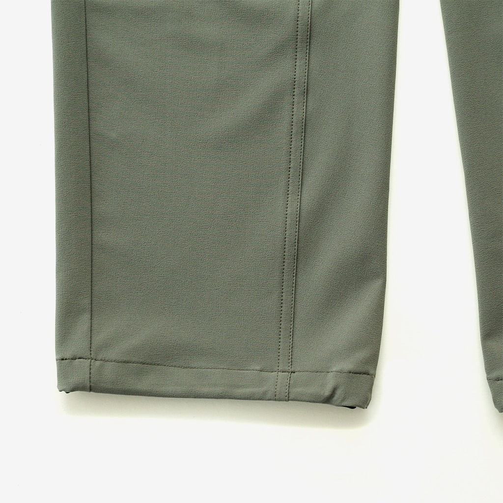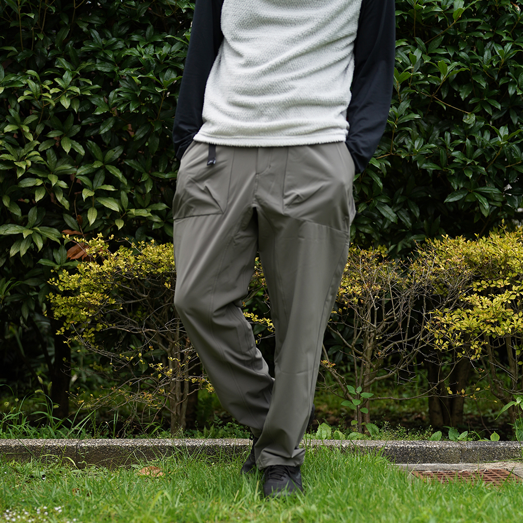 CAYL『Bulky Pocket Pants』は、前後4箇所に備わるふんわりと膨らんだジッパーポケットが特徴的なロングパンツ。 ヒップまわり、太ももまわりはややゆったりと仕上げ、裾にかけてテーパードしたシルエットは、リラックス感のある快適な履き心地。 メイン素材には、ストレッチ性、通気性、速乾性に富んだAero-Cool素材を採用し、撥水コーティングも施されています。 ウエストには弾性バンドとウェビング、裾もストリングコードで絞ることができます。 街でも山でもスタイリングしやすい、CAYLらしいリラックスシルエットのロングパンツです。 背面。 サイド。 裾はストリングコードで調整できます。 モデル:182cm/Lサイズ