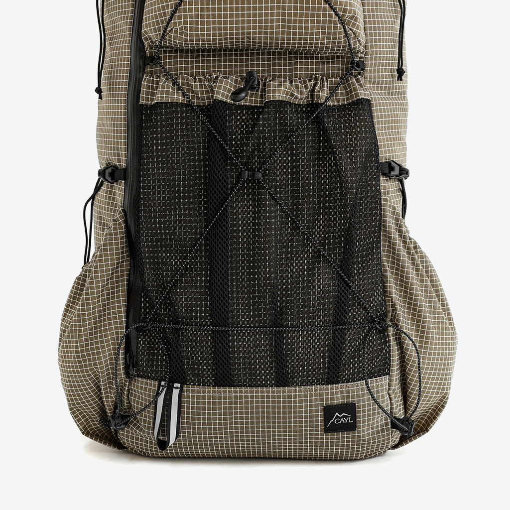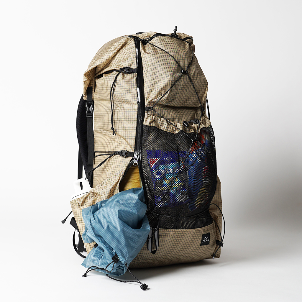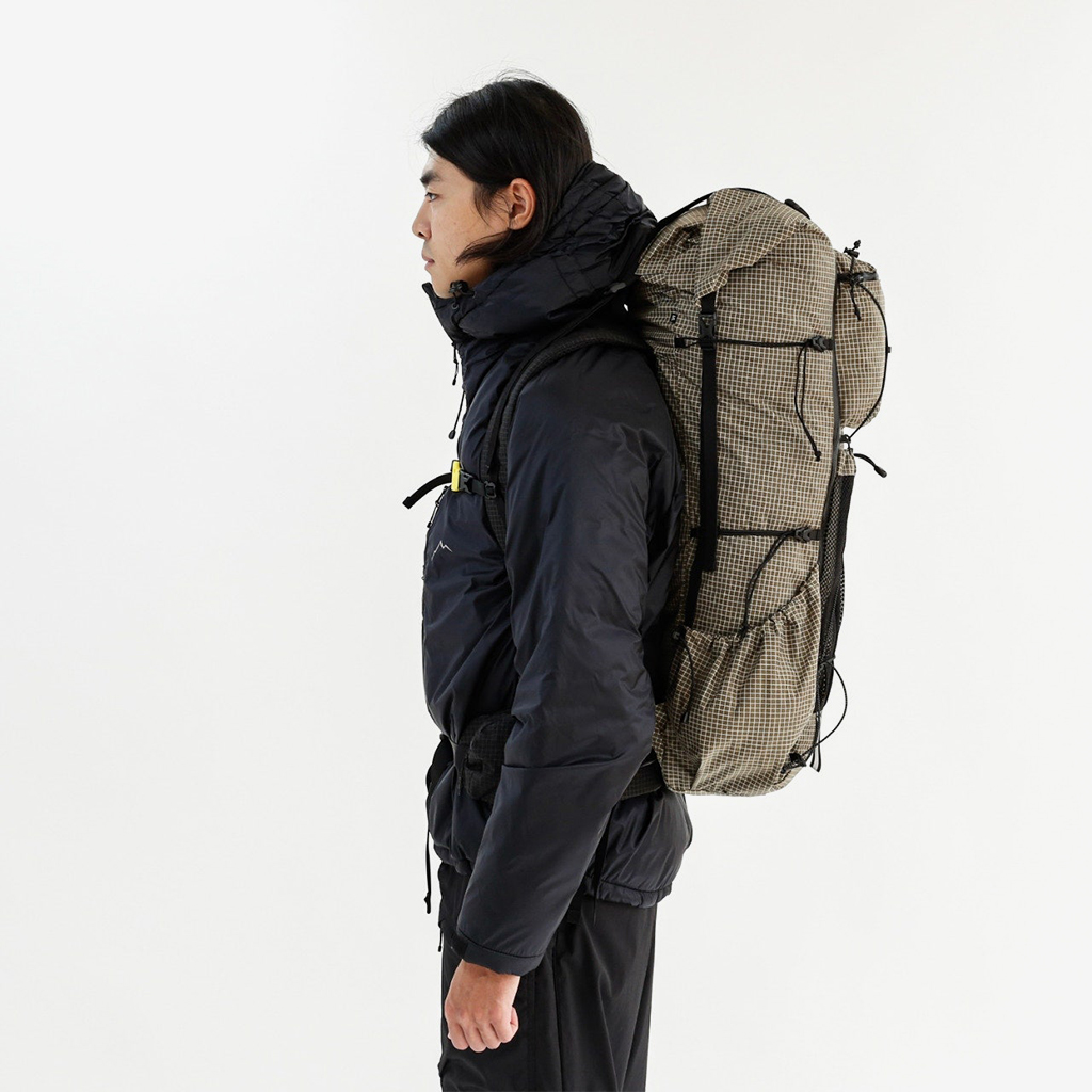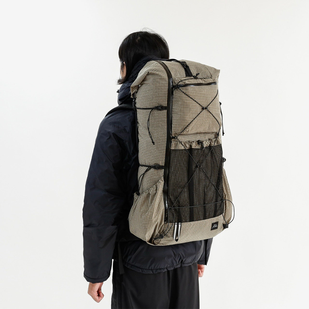 韓国のULハイキングシーンを牽引する、ソウル発のアウトドアブランドCAYL。 ユーザーからの要望も多かった荷物をスムーズに取り出せる大型バックパックが2024FWから遂にリリース! 新作『Unmun』(ウンムン)は、背面に内蔵されたシングルアルミフレームと、体の動きに合わせて寄り添う柔軟性のあるプレート、そして安心感のあるヒップベルトを備え、軽量ながらしっかりと腰に荷重を分散し、食料が多くなる長期間のハイキングでも安定して背負うことができます。 背面のフレームとヒップベルトは取り外せるので、スタイルに合わせてより軽量化することもできます。 ショルダーハーネスと背面には、しなやかで適度な厚みのある3Dエアメッシュを採用し、快適なクッション性に加え、蒸れも軽減しています。 ショルダースタビライザーを活用して、バックを身体側に引き寄せたり、逆に離して負荷のかかる場所を分散することもできます。 特徴的なフロントのダブルジッパーは、ロールトップ式の懸念点のひとつであるメイン部へのアクセスのしにくさを、デザインに落とし込みながら解決。 下方に収納した荷物も下から開けてすぐに出し入れできるので、上から順番に荷物を取り出す必要はありません。 荷造り時や山小屋、テント場では、上からジッパーを開ければどこに何があるかも一目瞭然。荷物が出し入れしやすく、パッキングも楽にしてくれます。 約45L(メイン40L、ポケット5L)という容量は、オールシーズンの小屋泊、テント泊から、ULスタイルなら長期のロングハイクにも使いやすい絶妙なサイズ。 メインスペースはロールトップ構造で、バックルを上、もしくはサイドに落として留めることができます。 またロールトップ入口はスナップボタン式なので、出し入れの時にフリースなどのウェアと干渉することもありません。 フロントにはジッパーポケットとメッシュポケット、両サイドにもポケットがあり、収納力はもちろん、整理もしやすい設計になっています。 使われているCAYL GRID生地は、210Dナイロンをベースに、超高分子量ポリエチレン(UHMWPE)を格子状に組み合わせた軽量で強靭な生地。 耐摩耗性、UV耐性に優れ、長期間の使用に適した耐久性があり、強度に加え撥水性も備えています。 ※完全防水ではありませんので、必要に応じてパックライナーやザックカバーなどで防水対策をおこなってください。 ※付属するビニール製の梱包袋がパックライナーとしてご使用いただけます。 フロントダブルジッパーによるアクセスしやすさに加え、取り外しもできるアルミフレーム、しっかりサポートしてくれるヒップベルトなど大型パックに欲しい機能を備えながらも、SMサイズで約870g(本体710g、ヒップベルト160g)と軽量に仕上がっています。 背面長に合わせて、SM、MLの2サイズ展開になります。 下方に収納した荷物も下からジッパーを開けてスムーズに出し入れできます。 ロールトップ上部のバックルは、上で留める、もしくはこのようにサイドに落として留めることができます。 サイドで留めた方がより荷物が固定され安定します。 サイドポケットは十分な容量があり、背負ったままでも取り出しやすいよう手前側が低くなっています。 ショルダーハーネスと背面、ヒップベルトには、クッション性と通気性を持つ3Dエアメッシュを採用。 チェストストラップはテンションバンドになっていて、動いている最中も柔らかにフィットします。 バックルの黄色部分はホイッスルになっています。ホイッスル部分だけ取り外しもできます。 ショルダースタビライザーを活用して、バックを身体側に引き寄せたり、逆に離して負荷のかかる場所を分散することもできます。 フロント上部のジッパーポケットと、下部のメッシュポケット。用途に応じて使い分けできます。 バンジーコードでコンプレッションすることで荷物の揺れを軽減します。 サイドのコンプレッションストリングを引くことで必要に応じてパックの容量を減らし、また荷物が背中側へ引き寄せられることでより安定して背負えます。 コンプレッションストリングは、上側はコンプレッション効果が高い伸縮しないタイプ、下側は収納性も重視した伸縮するタイプになっています。 ヒップベルトのポケットもマチがあり十分な容量。ヒップベルトは簡単に取り外しも可能です。 スマホや行動食も余裕をもって収まります。 ロールトップなので、荷物の量に応じて容量を可変できます。 モデル:184cm / MLサイズ ロールトップ入口はスナップボタン式なので、出し入れの時にフリースなどのウェアと干渉することもありません。 荷造り時や山小屋、テント場では、上からジッパーを開ければどこに何があるかも一目瞭然。荷物が出し入れしやすく、パッキングも楽にしてくれます。 フロント上部のジッパーポケットと、下部のメッシュポケット。用途に応じて使い分けできます。 バンジーコードでコンプレッションすることで荷物の揺れを軽減しま