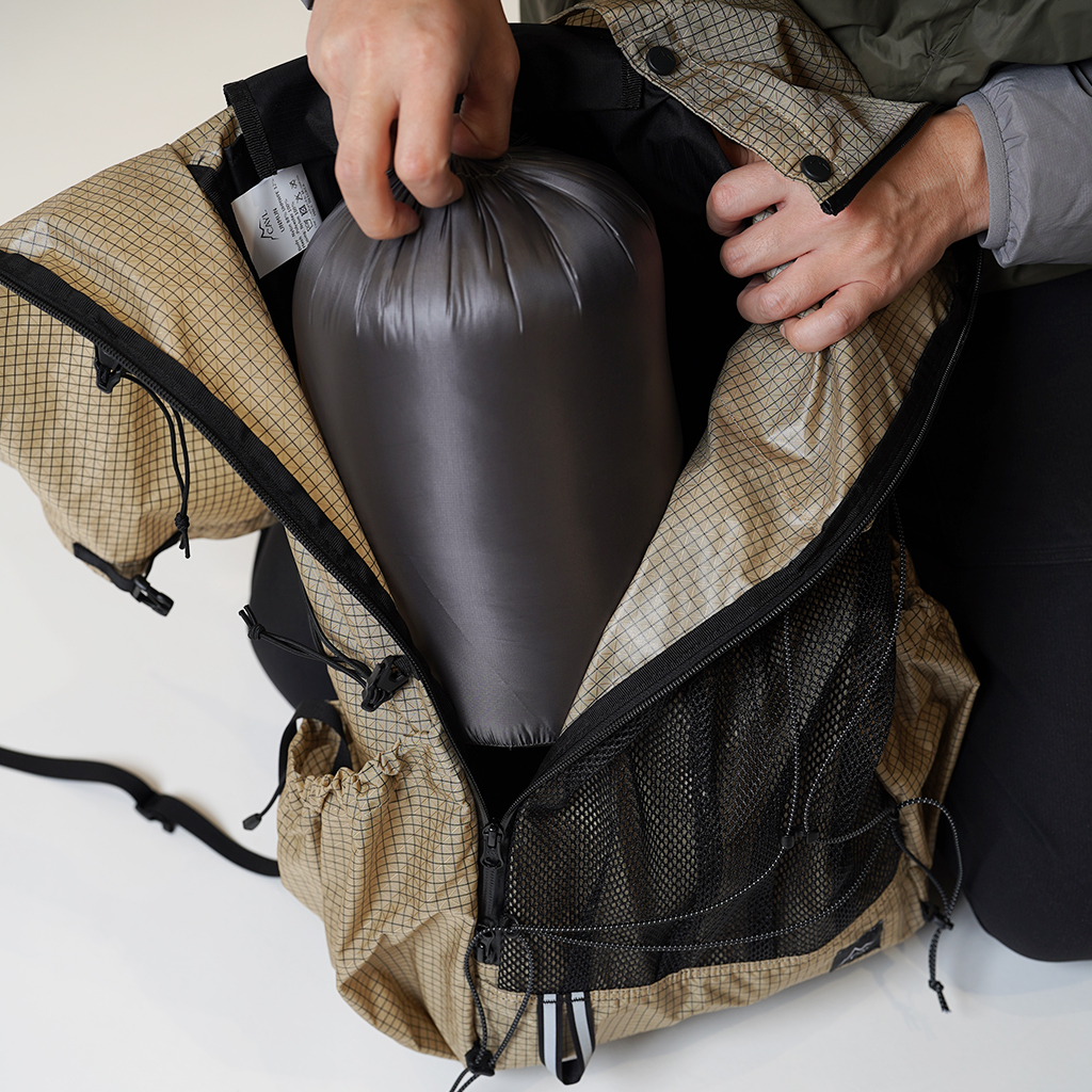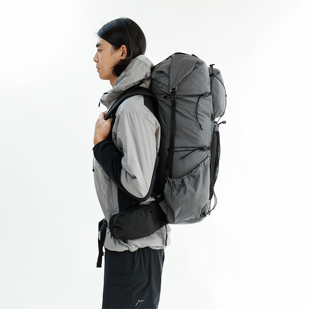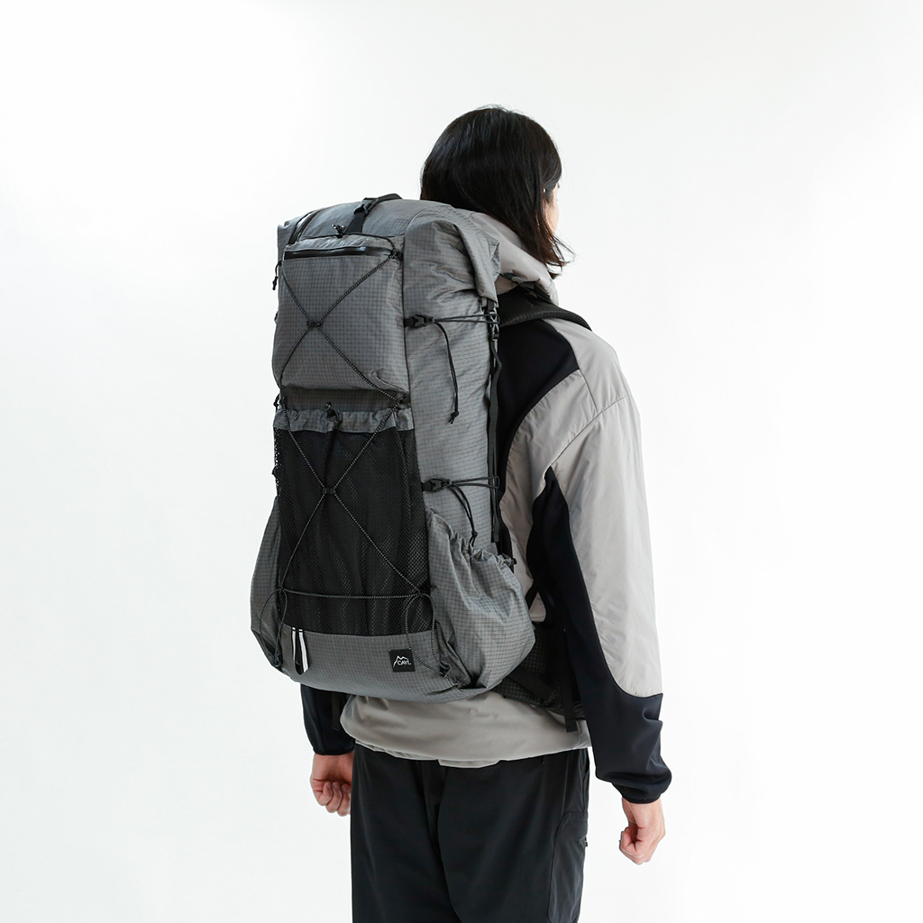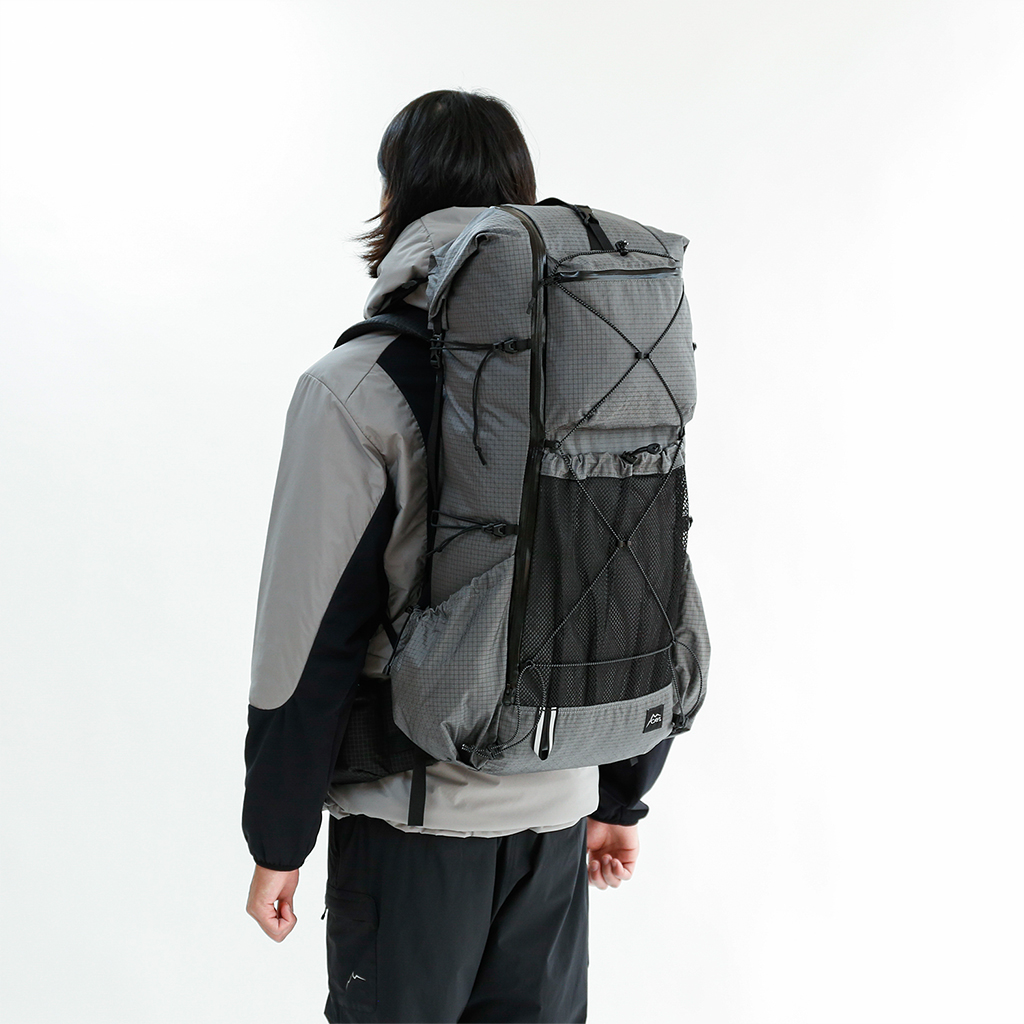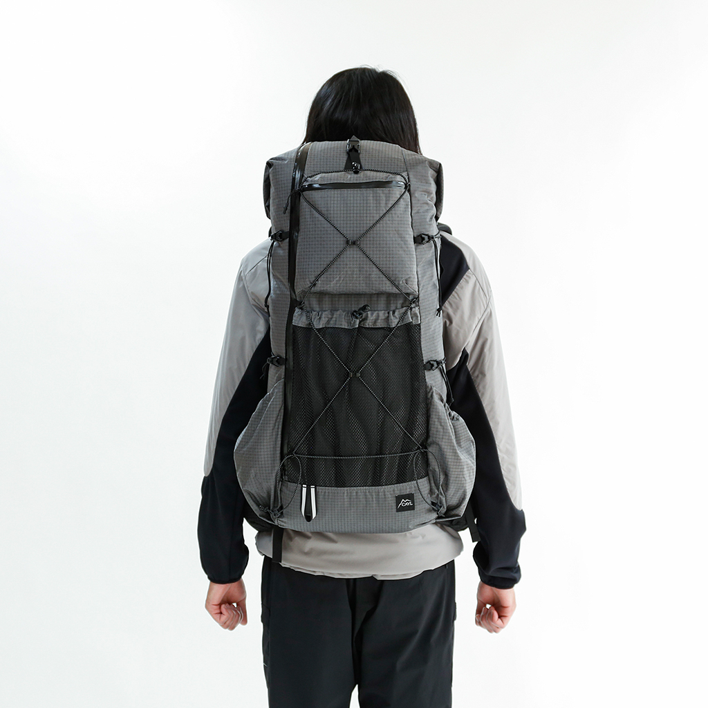 韓国のULハイキングシーンを牽引する、ソウル発のアウトドアブランドCAYL。 ユーザーからの要望も多かった荷物をスムーズに取り出せる大型バックパックが2024FWから遂にリリース! 新作『Unmun』(ウンムン)は、背面に内蔵されたシングルアルミフレームと、体の動きに合わせて寄り添う柔軟性のあるプレート、そして安心感のあるヒップベルトを備え、軽量ながらしっかりと腰に荷重を分散し、食料が多くなる長期間のハイキングでも安定して背負うことができます。 背面のフレームとヒップベルトは取り外せるので、スタイルに合わせてより軽量化することもできます。 ショルダーハーネスと背面には、しなやかで適度な厚みのある3Dエアメッシュを採用し、快適なクッション性に加え、蒸れも軽減しています。 ショルダースタビライザーを活用して、バックを身体側に引き寄せたり、逆に離して負荷のかかる場所を分散することもできます。 特徴的なフロントのダブルジッパーは、ロールトップ式の懸念点のひとつであるメイン部へのアクセスのしにくさを、デザインに落とし込みながら解決。 下方に収納した荷物も下から開けてすぐに出し入れできるので、上から順番に荷物を取り出す必要はありません。 荷造り時や山小屋、テント場では、上からジッパーを開ければどこに何があるかも一目瞭然。荷物が出し入れしやすく、パッキングも楽にしてくれます。 約45L(メイン40L、ポケット5L)という容量は、オールシーズンの小屋泊、テント泊から、ULスタイルなら長期のロングハイクにも使いやすい絶妙なサイズ。 メインスペースはロールトップ構造で、バックルを上、もしくはサイドに落として留めることができます。 またロールトップ入口はスナップボタン式なので、出し入れの時にフリースなどのウェアと干渉することもありません。 フロントにはジッパーポケットとメッシュポケット、両サイドにもポケットがあり、収納力はもちろん、整理もしやすい設計になっています。 使われているCAYL GRID生地は、210Dナイロンをベースに、超高分子量ポリエチレン(UHMWPE)を格子状に組み合わせた軽量で強靭な生地。 耐摩耗性、UV耐性に優れ、長期間の使用に適した耐久性があり、強度に加え撥水性も備えています。 ※完全防水ではありませんので、必要に応じてパックライナーやザックカバーなどで防水対策をおこなってください。 ※付属するビニール製の梱包袋がパックライナーとしてご使用いただけます。 フロントダブルジッパーによるアクセスしやすさに加え、取り外しもできるアルミフレーム、しっかりサポートしてくれるヒップベルトなど大型パックに欲しい機能を備えながらも、SMサイズで約870g(本体710g、ヒップベルト160g)と軽量に仕上がっています。 背面長に合わせて、SM、MLの2サイズ展開になります。 サイドのコンプレッションストリングを引くことで必要に応じてパックの容量を減らし、また荷物が背中側へ引き寄せられることでより安定して背負えます。 コンプレッションストリングは、上側はコンプレッション効果が高い伸縮しないタイプ、下側は収納性も重視した伸縮するタイプになっています。 ショルダーハーネスと背面、ヒップベルトには、クッション性と通気性を持つ3Dエアメッシュを採用。 チェストストラップはテンションバンドになっていて、動いている最中も柔らかにフィットします。 バックルの黄色部分はホイッスルになっています。ホイッスル部分だけ取り外しもできます。 ショルダースタビライザーを活用して、バックを身体側に引き寄せたり、逆に離して負荷のかかる場所を分散することもできます。 ヒップベルトのポケットもマチがあり十分な容量。ヒップベルトは簡単に取り外しも可能です。 スマホや行動食も余裕をもって収まります。 ロールトップなので、荷物の量に応じて容量を可変できます。 モデル:184cm / MLサイズ ロールトップ入口はスナップボタン式なので、出し入れの時にフリースなどのウェアと干渉することもありません。 荷造り時や山小屋、テント場では、上からジッパーを開ければどこに何があるかも一目瞭然。荷物が出し入れしやすく、パッキングも楽にしてくれます。 フロント上部のジッパーポケットと、下部のメッシュポケット。用途に応じて使い分けできます。 バンジーコードでコンプレッションすることで荷物の揺れを軽減します。 ロールトップ上部のバックルは、上で留める、もしくはこのようにサイドに落として留めることができます。 サイドで留めた方がより荷物が固定され安定します。 下方に収納した荷物も下からジッパーを開けてスムーズに出し入れできます。 ダブルウォールテント、冬用シュラフ、マット、インナーシュラフ、エマージェンシービビィ、レインウェア上下、ダウン上下、メリノベースレイヤー上下、グローブ、チェーンスパイク、保温ボトルなど、秋冬テント泊を想定したパッキング例。 モデル:182cm / MLサイズ