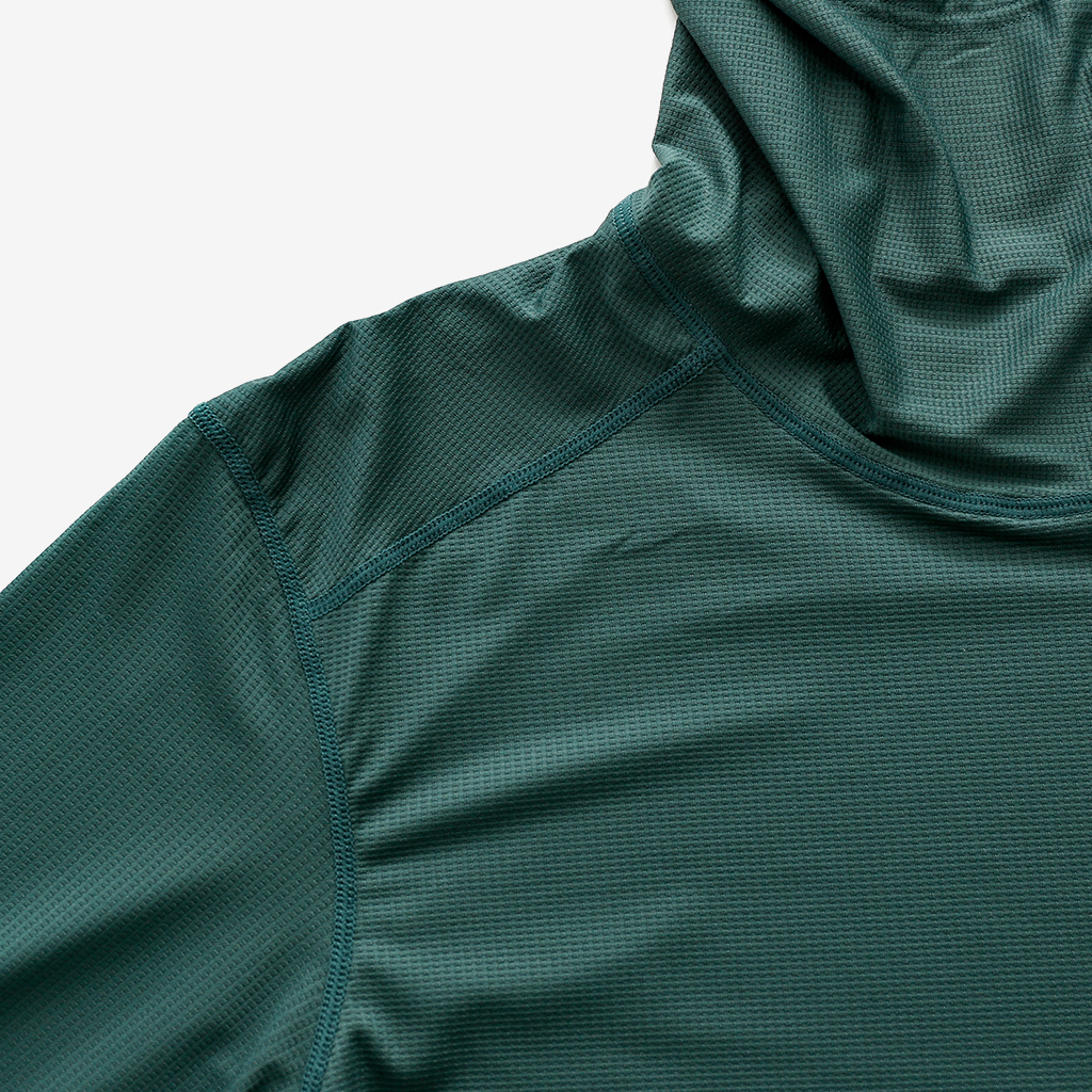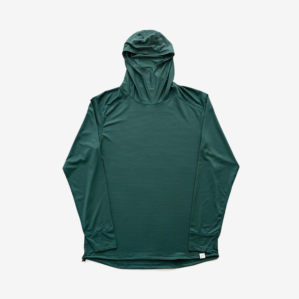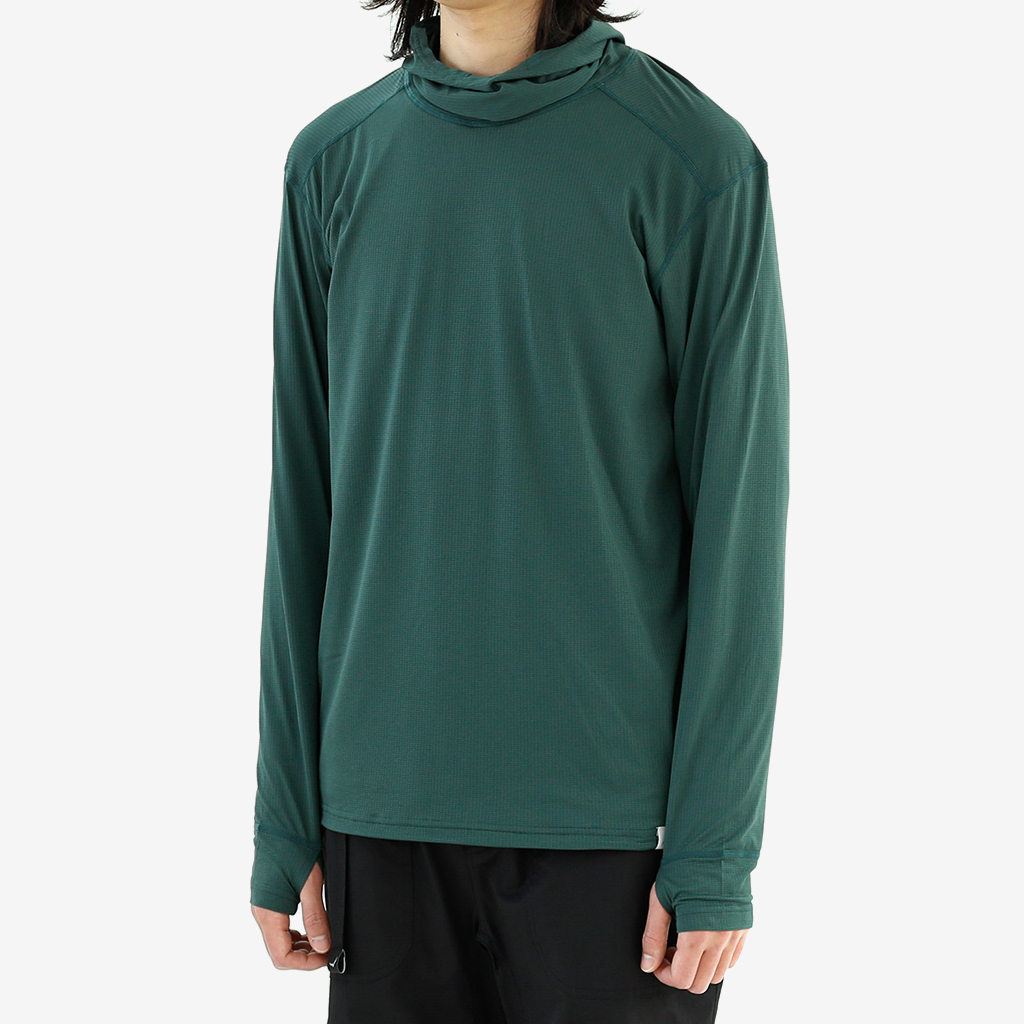 CAYL『Air Hoody』は、CAYLオリジナル生地で作られた速乾ロングスリーブフーディー。 軽量で通気性が高く、吸汗速乾機能があり、さらにHeiq社の抗菌加工が施され、防臭効果もあります。 袖口はサムホール仕様で、裾はコードで絞れます。 多くの汗をかく夏山やランニングのベースレイヤーとしても最適な万能フーディーです。 モデル:184cm/Lサイズ