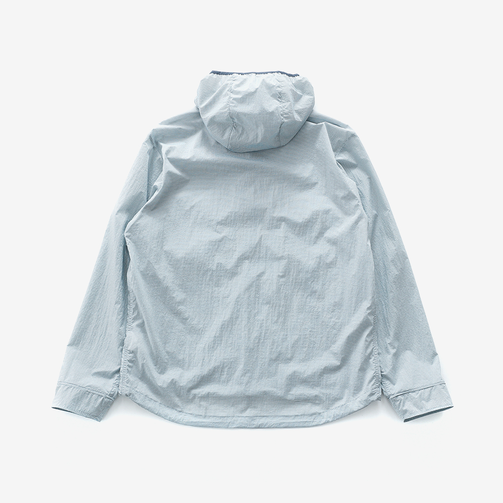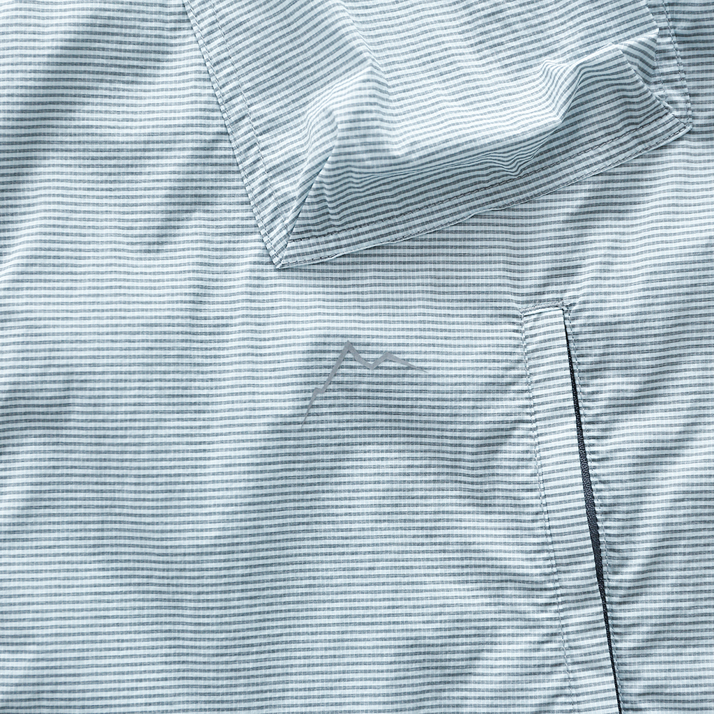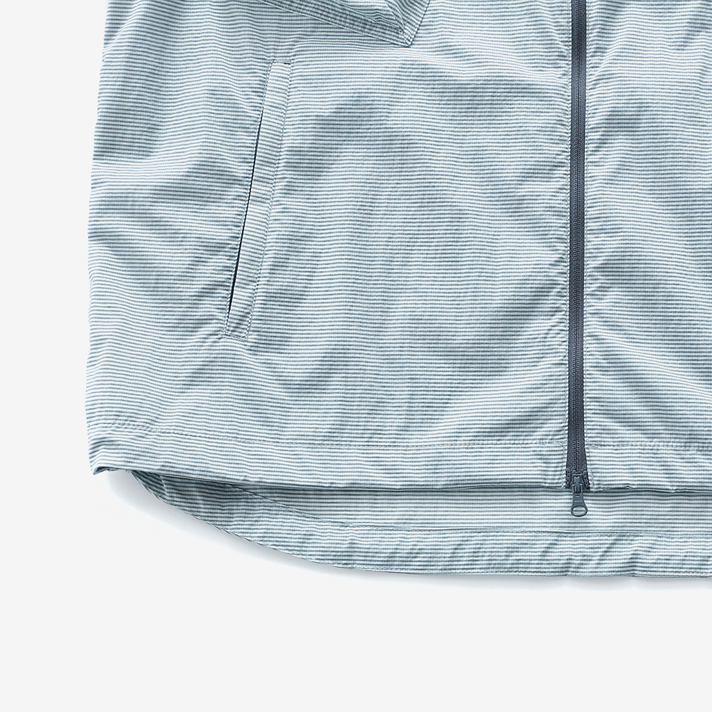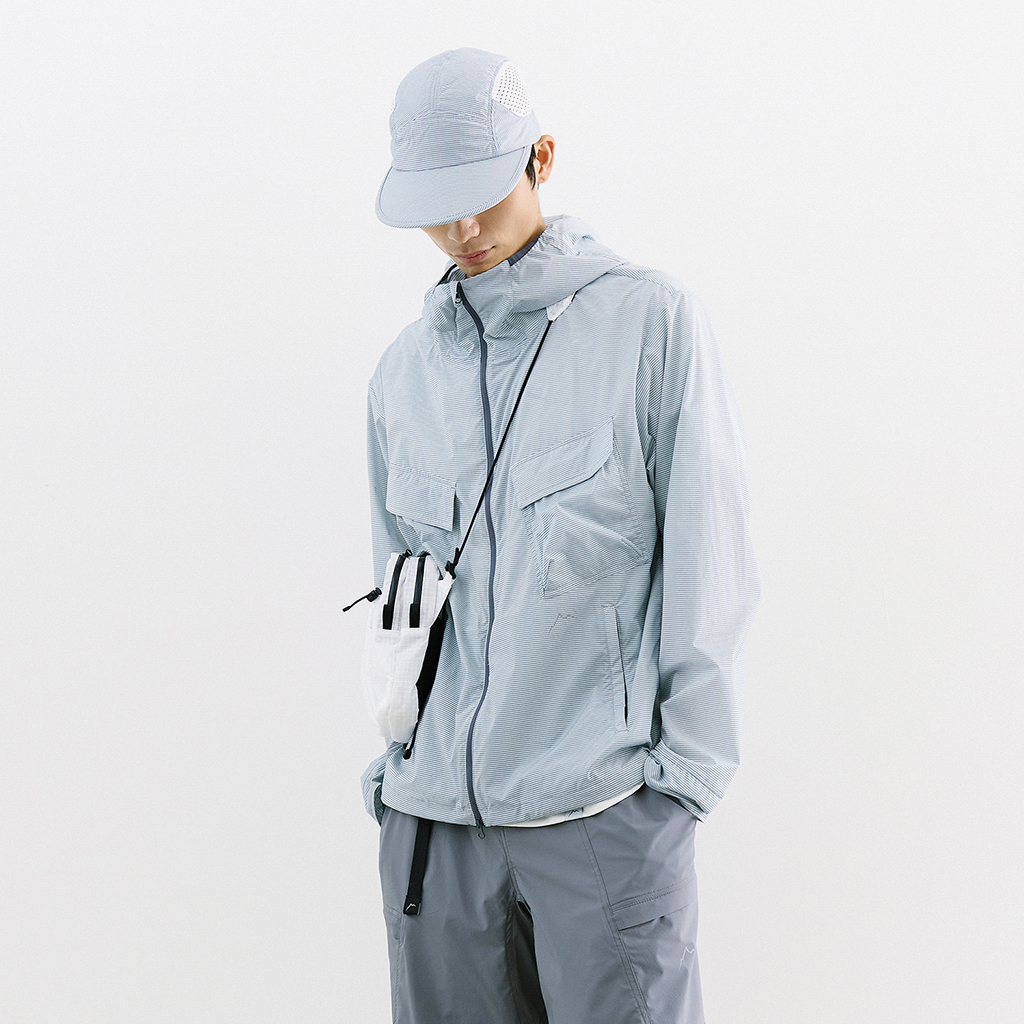 CAYL『Flap Pocket CHK Jacket』は、薄手ながら撥水コーティングと防風コーティングが施された軽量なウインドジャケット。 ストライプにも見える細かなチェック柄が、軽やかでユニークな印象を生み出しています。 胸にはベルクロタイプのフラップポケット、ハンドポケットはジッパータイプになっています。 フロントはダブルジッパーで細かなベンチレーション調整ができ、裾とフードはコードで調整できます。 軽量でコンパクトになるので荷物の負担にならず、幅広いシーンで活躍します。薄くてもしっかり防風してくれるので、アクティビティはもちろん、夏場の冷房対策や旅行、デイリーユースにも、1枚あるととても重宝するウインドジャケットです。 カラーはLight Grey、Dark Greyの2カラー展開になります。 背面。 フロントはダブルジッパーで細かなベンチレーション調整ができます。 裾はストリングコードで絞れるので、丈感やシルエットも変えられます。 モデル:184cm/Lサイズ モデル:182cm / Lサイズ