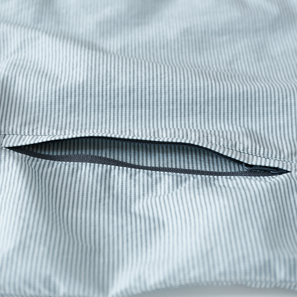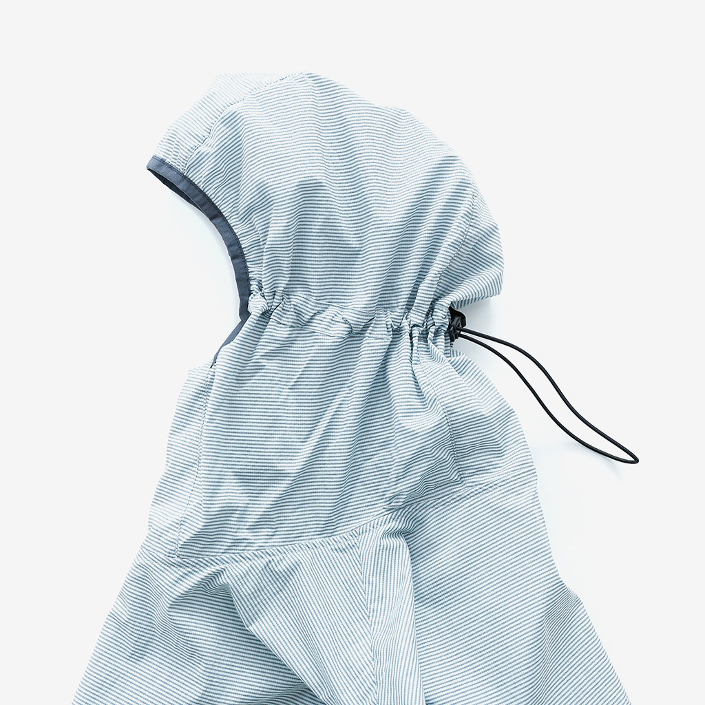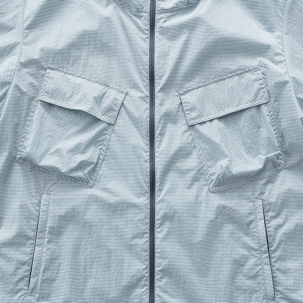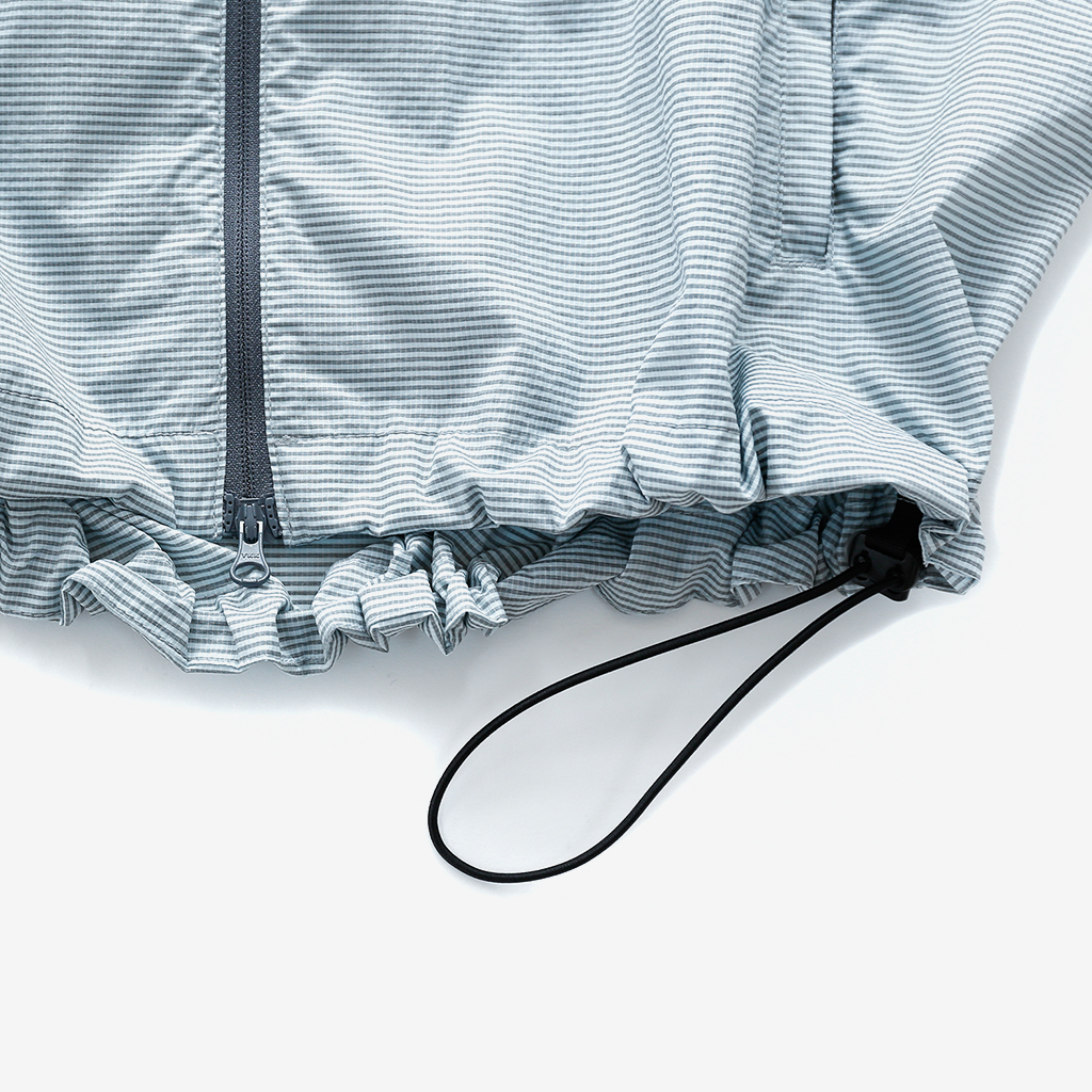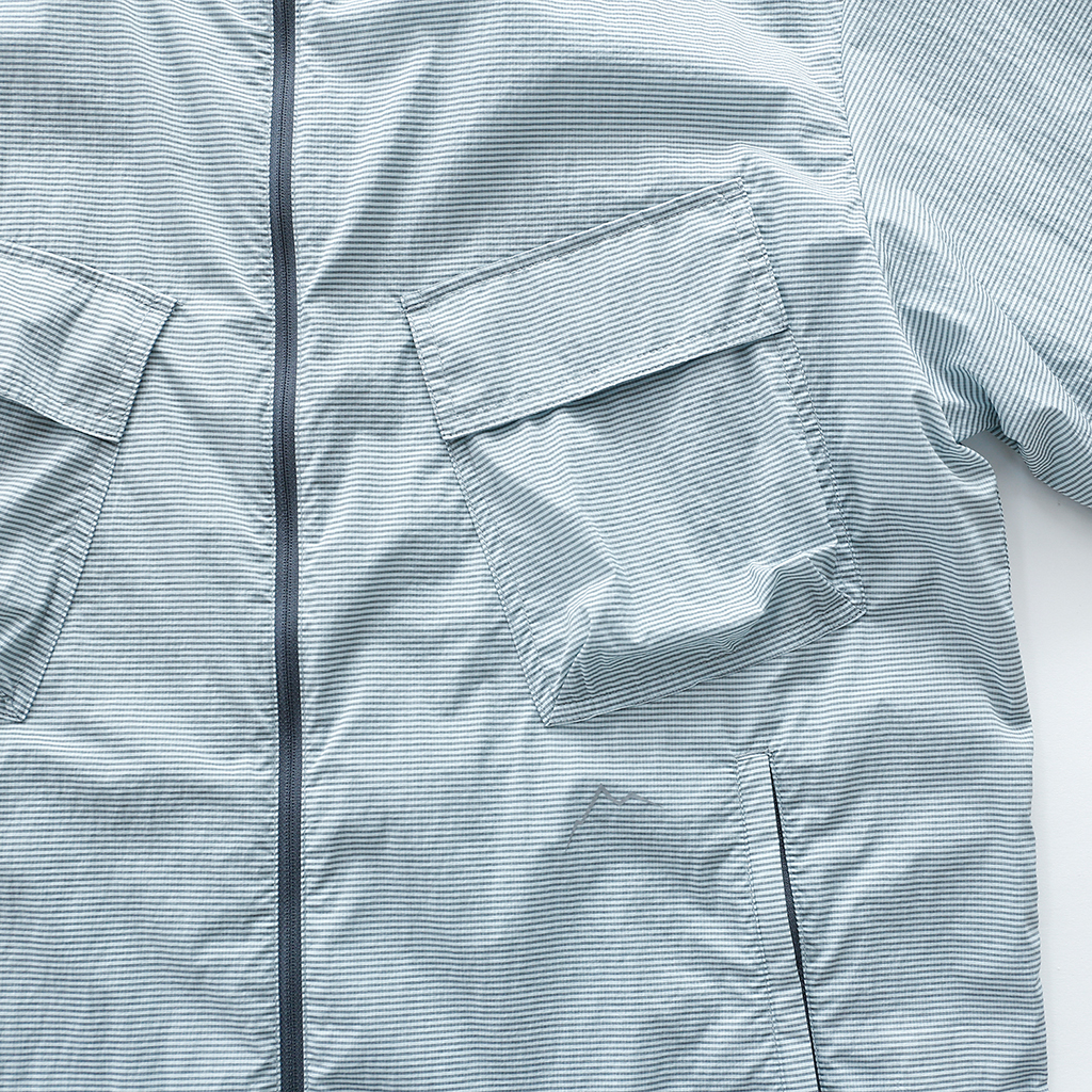 CAYL『Flap Pocket CHK Jacket』は、薄手ながら撥水コーティングと防風コーティングが施された軽量なウインドジャケット。 ストライプにも見える細かなチェック柄が、軽やかでユニークな印象を生み出しています。 胸にはベルクロタイプのフラップポケット、ハンドポケットはジッパータイプになっています。 フロントはダブルジッパーで細かなベンチレーション調整ができ、裾とフードはコードで調整できます。 軽量でコンパクトになるので荷物の負担にならず、幅広いシーンで活躍します。薄くてもしっかり防風してくれるので、アクティビティはもちろん、夏場の冷房対策や旅行、デイリーユースにも、1枚あるととても重宝するウインドジャケットです。 カラーはLight Grey、Dark Greyの2カラー展開になります。 背面。 フロントはダブルジッパーで細かなベンチレーション調整ができます。 裾はストリングコードで絞れるので、丈感やシルエットも変えられます。 モデル:184cm/Lサイズ モデル:182cm / Lサイズ