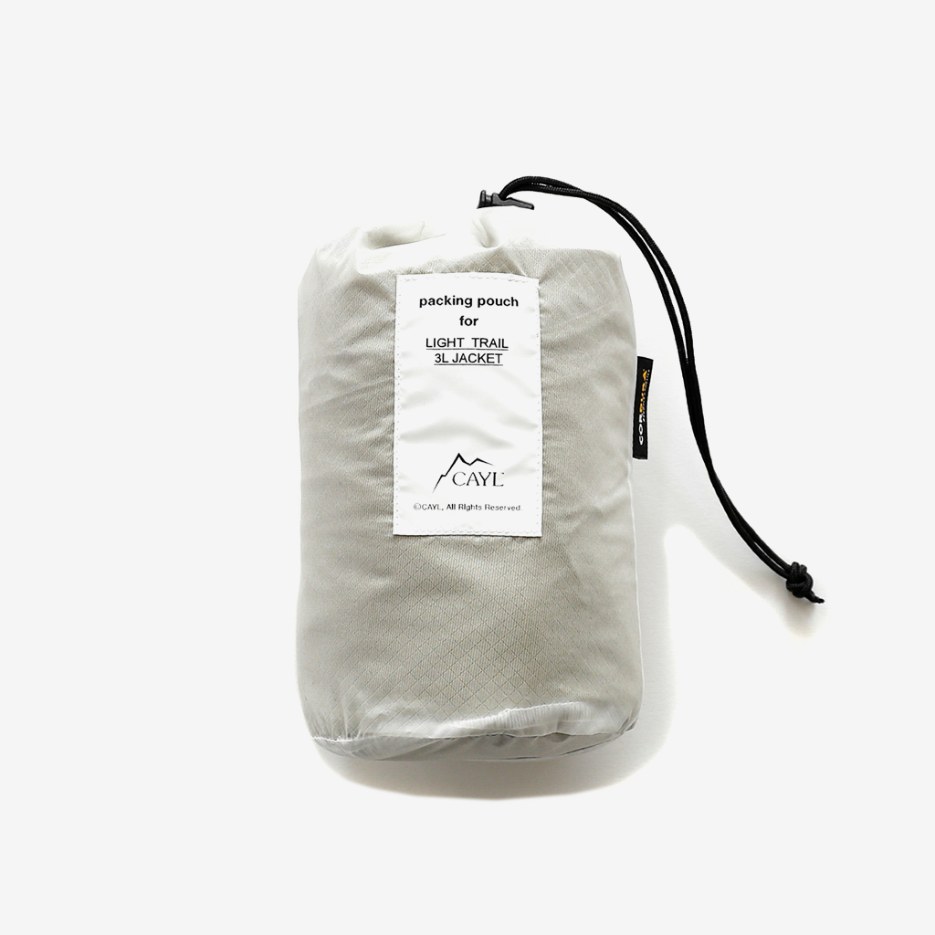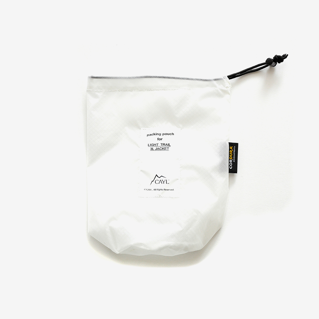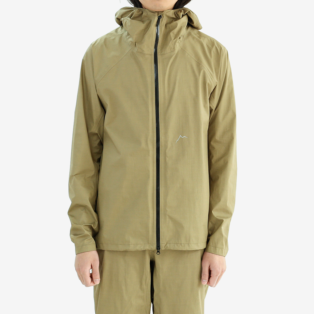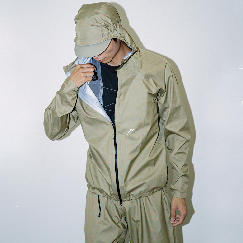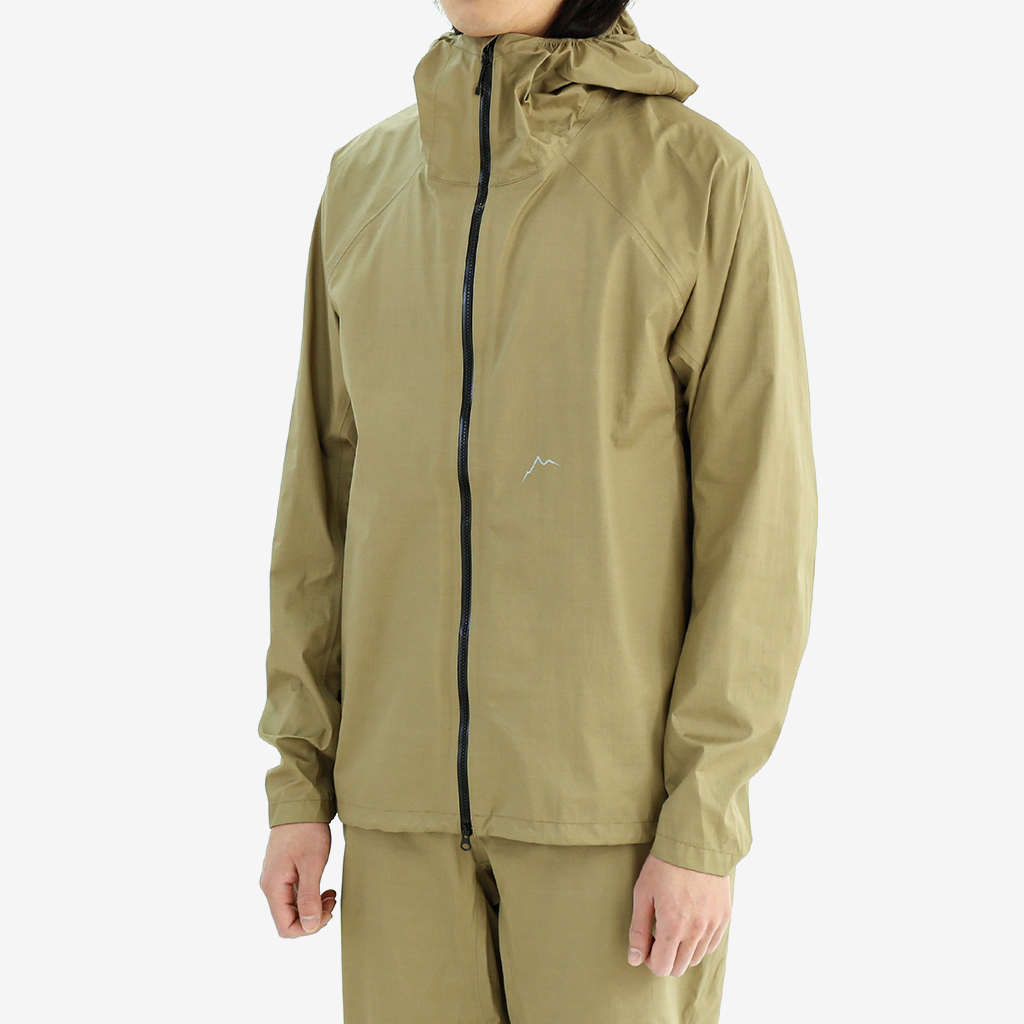 CAYL『Light Trail 3L Jacket』は、抜群の透湿性で快適に行動できる軽量レインジャケット。 CAYLが新たに開発したナノフィルムを用いた3レイヤー生地は、防水性や耐風性、耐久性はしっかり備えながら、65,000 g/m2/24hものハイレベルな透湿性を実現しています。 フロントはダブルジッパー、脇はベンチレーション構造になっていて、状況に応じてベンチレーションレベルを調整できます。 フードと裾はストリングコードでフィッティング調整が可能。 背中部分は少しゆとりを持たせたパターンになっていて、トレランパックなどコンパクトなものであれば上から羽織ることもできます。 高温多湿な日本の気候にもマッチした素材は、優れた透湿性により衣服内がドライな状態に保たれ、着心地はしなやかで軽く。まるでウインドシェルのように着れるレインジャケット。 そしてCAYLらしい使い勝手を追求しながらも、タウンユースにも馴染むデザイン性で、多彩なシーンで重宝します。 専用の収納ポーチも付属します。 背面。 脇下のベンチレーション。 専用の収納ポーチにコンパクトに収まります。 背中部分は少しゆとりを持たせたパターンになっていて、トレランパックなどコンパクトなものであれば上から羽織ることもできます。 モデル:184cm/Lサイズ