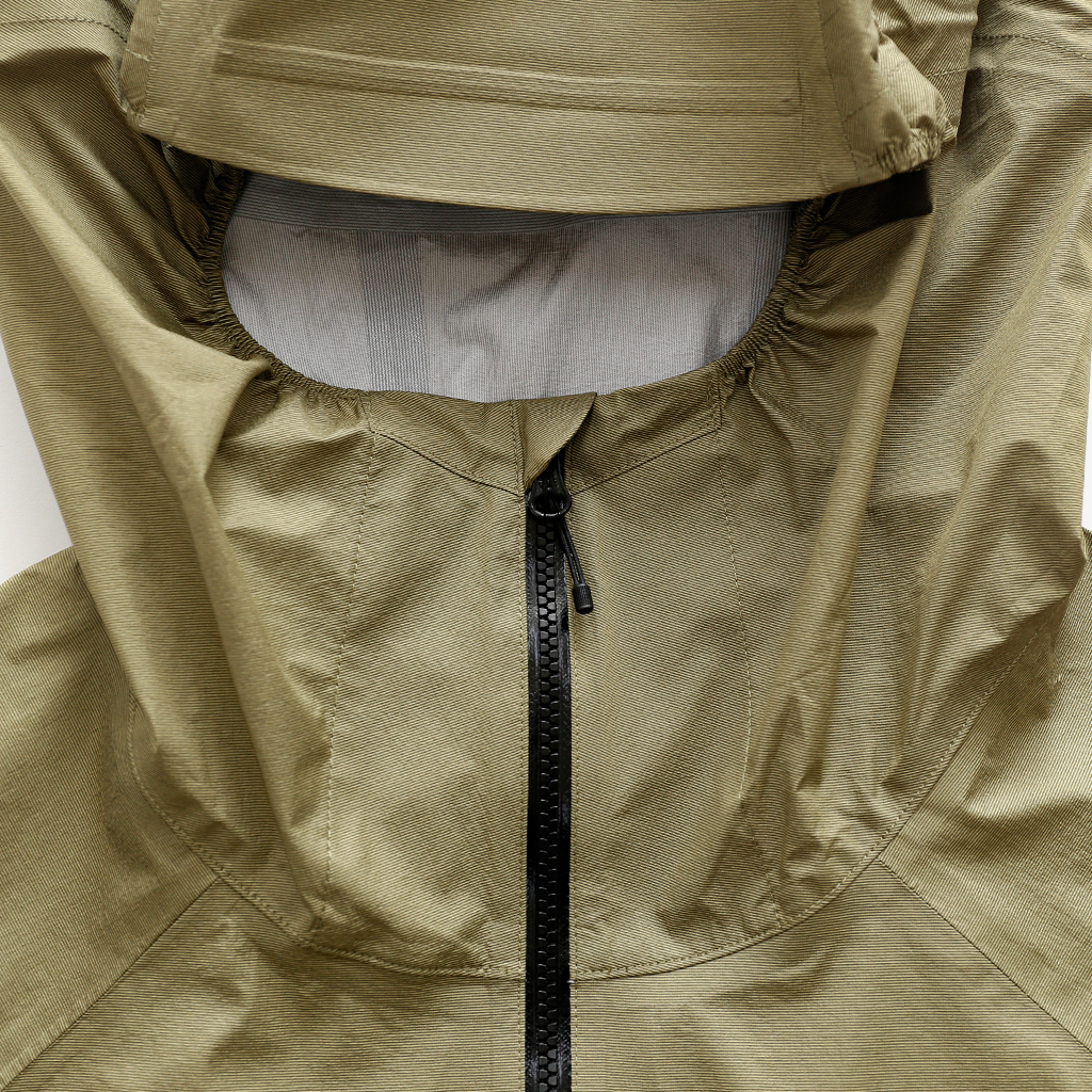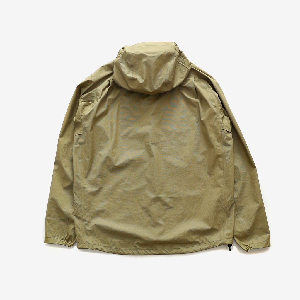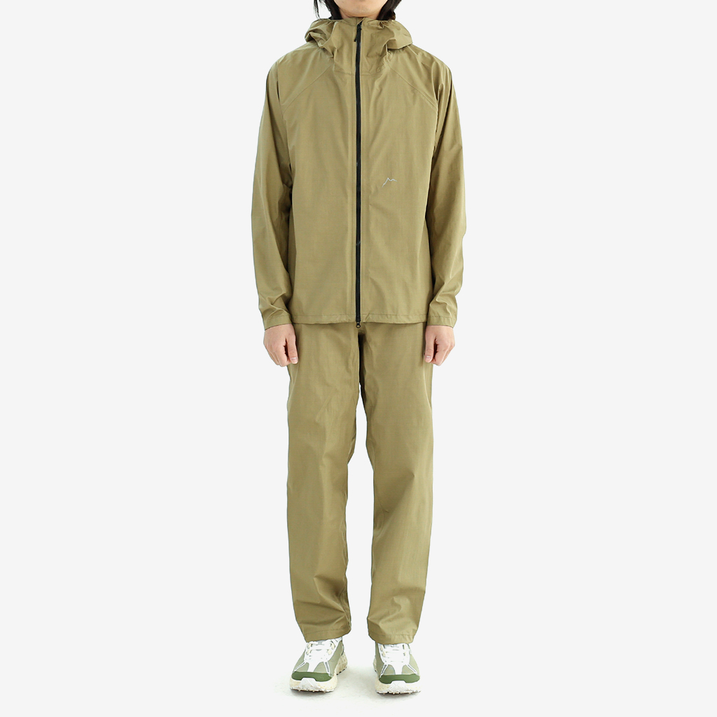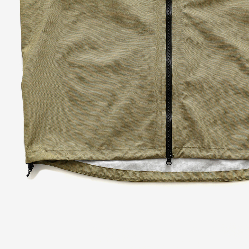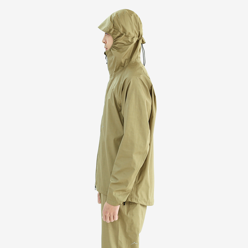 CAYL『Light Trail 3L Jacket』は、抜群の透湿性で快適に行動できる軽量レインジャケット。 CAYLが新たに開発したナノフィルムを用いた3レイヤー生地は、防水性や耐風性、耐久性はしっかり備えながら、65,000 g/m2/24hものハイレベルな透湿性を実現しています。 フロントはダブルジッパー、脇はベンチレーション構造になっていて、状況に応じてベンチレーションレベルを調整できます。 フードと裾はストリングコードでフィッティング調整が可能。 背中部分は少しゆとりを持たせたパターンになっていて、トレランパックなどコンパクトなものであれば上から羽織ることもできます。 高温多湿な日本の気候にもマッチした素材は、優れた透湿性により衣服内がドライな状態に保たれ、着心地はしなやかで軽く。まるでウインドシェルのように着れるレインジャケット。 そしてCAYLらしい使い勝手を追求しながらも、タウンユースにも馴染むデザイン性で、多彩なシーンで重宝します。 専用の収納ポーチも付属します。 背面。 脇下のベンチレーション。 専用の収納ポーチにコンパクトに収まります。 背中部分は少しゆとりを持たせたパターンになっていて、トレランパックなどコンパクトなものであれば上から羽織ることもできます。 モデル:184cm/Lサイズ