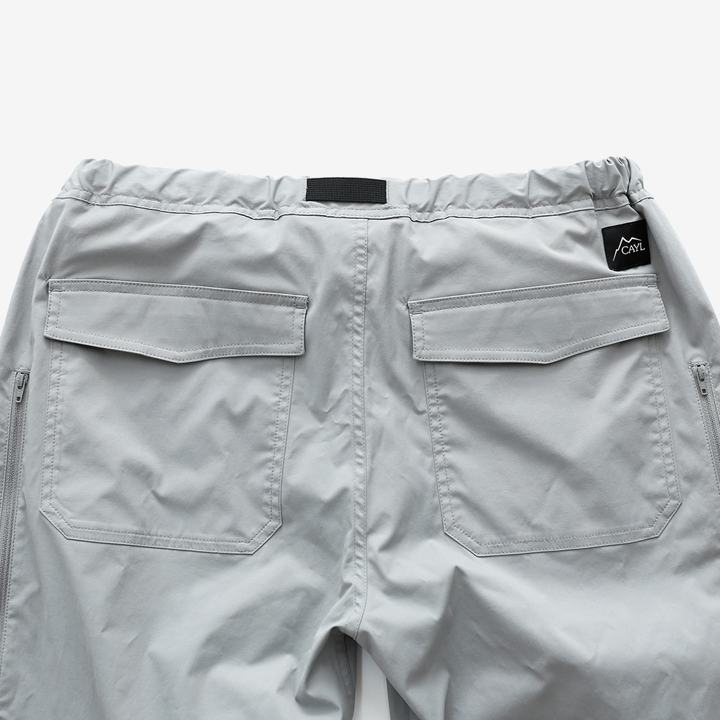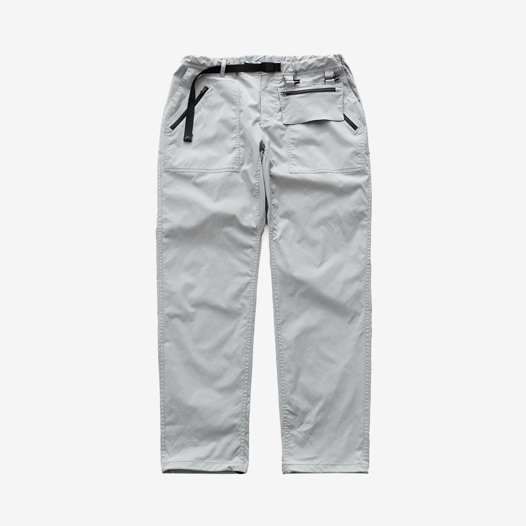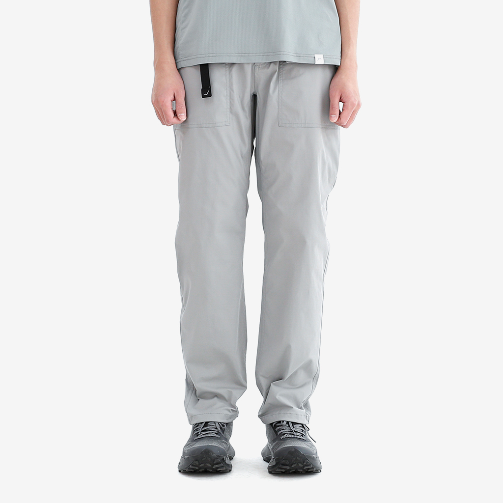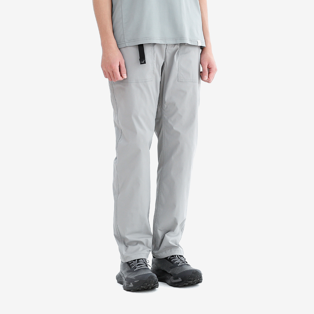CAYL『Light Mountain Pants』は、ロングセラーモデルの『Mountain Pants』をより軽量にアップデートした新作パンツ。 CAYLのパンツシリーズの中では珍しく、少し細めのスッキリしたストレートシルエットで、年齢性別を問わず幅広いユーザーに支持されています。 ナイロン、コットン、ポリウレタンを組み合わせた生地は、タフで速乾性、ストレッチ性もあり、撥水加工も施されています。 合計7つのポケットを備え、1つはクリップパーツで取り外しもできます。フロントは二重ポケット構造で、鍵や財布などの貴重品を安心して収納できるジッパーポケットが付いています。 また、両脇にはベンチレーションジッパーがあり、細かな温度調整に対応します。 ウエストはゴムとウェビングベルトで直感的に絞り具合を調整可能。腰上で留めてアクティブに動いたり、食事などリラックスしたい時は緩めたり。 裾もストリングコードで絞れるので、シューズやサンダルなどによって、丈感やシルエットも変えられます。 街でも山でも、長いシーズンで使いやすい万能ロングパンツです。 背面。 両脇にはベンチレーションジッパーがあり、細かな温度調整に対応します。 裾はストリングコードで絞れるので、シューズやサンダルなどによって、丈感やシルエットも変えられます。 モデル:184cm/Lサイズ モデル:182cm / Lサイズ