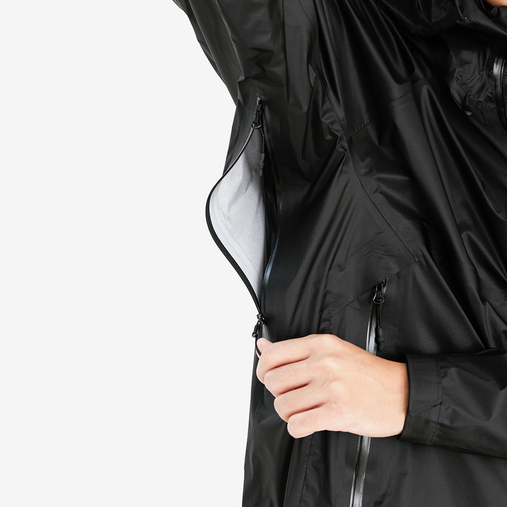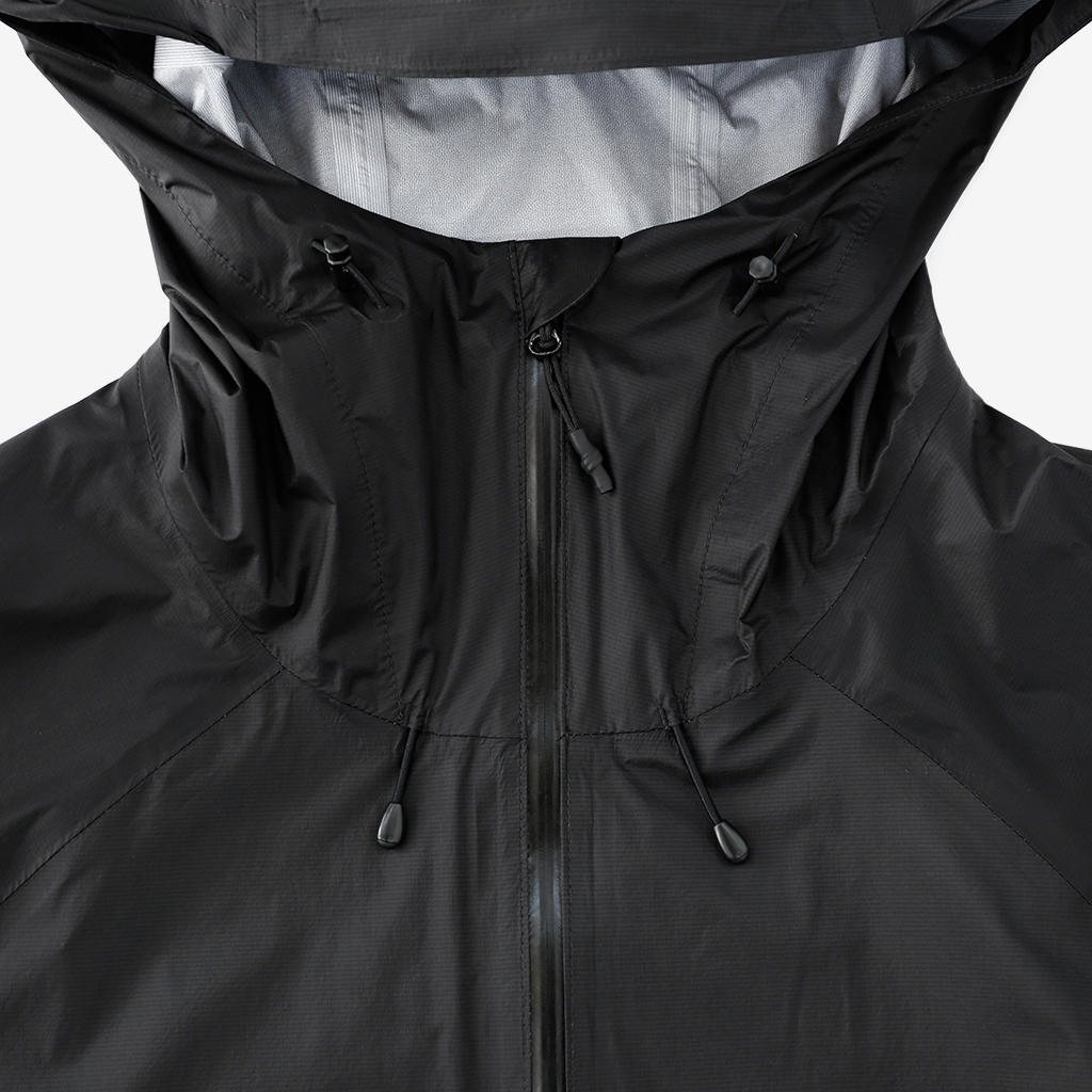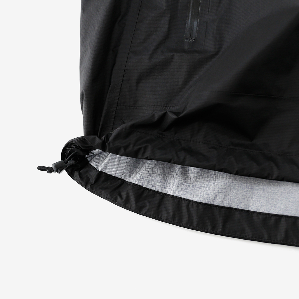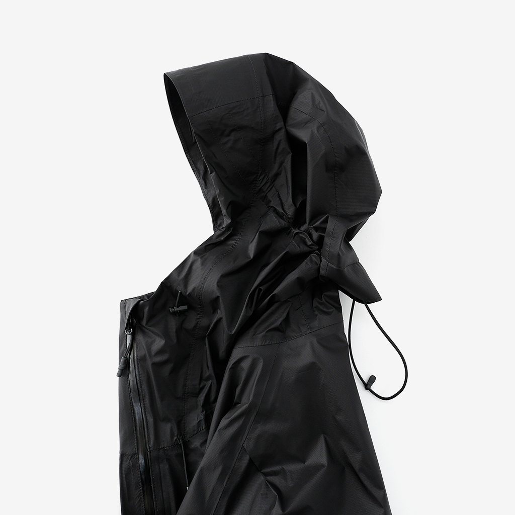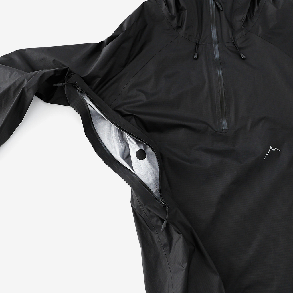 CAYL『Feather 3L Anorak』は、薄手の12Dナイロンと、高レベルの防水性、透湿性、低結露性を実現した防水透湿素材である東レ『Dermizax(ダーミザクス)』を使用して作られた3レイヤーの軽量レインジャケット。軽やかでウインドシェルのような着心地です。 両脇の下にはダブルジッパー式のベンチレーションがあり、行動中に素早く換気できます。また左脇側は下までオープンジッパーで大きく開けられるので、プルオーバーながら脱ぎ着はスムーズ。 フード部とウエスト部はストリングで絞れるようになっていて、手首はベルクロで調整できます。 フロントに配された大容量のカンガルーポケットがデザインのアクセントにもなっています。 収納時もコンパクトで、持ち運びも苦になりません。 NMGでは、Black、Khakiの2カラー展開。 フードはコードでしっかりフィッティング調整できます。 左脇側は下までオープンジッパーで大きく開けられるので、プルオーバーながら脱ぎ着は簡単。クイックに換気もできます。 右脇にもベンチレーション。 裾はコードで絞れ、シルエットや丈感も調整できます。 モデル:184cm/Lサイズ