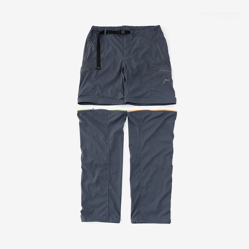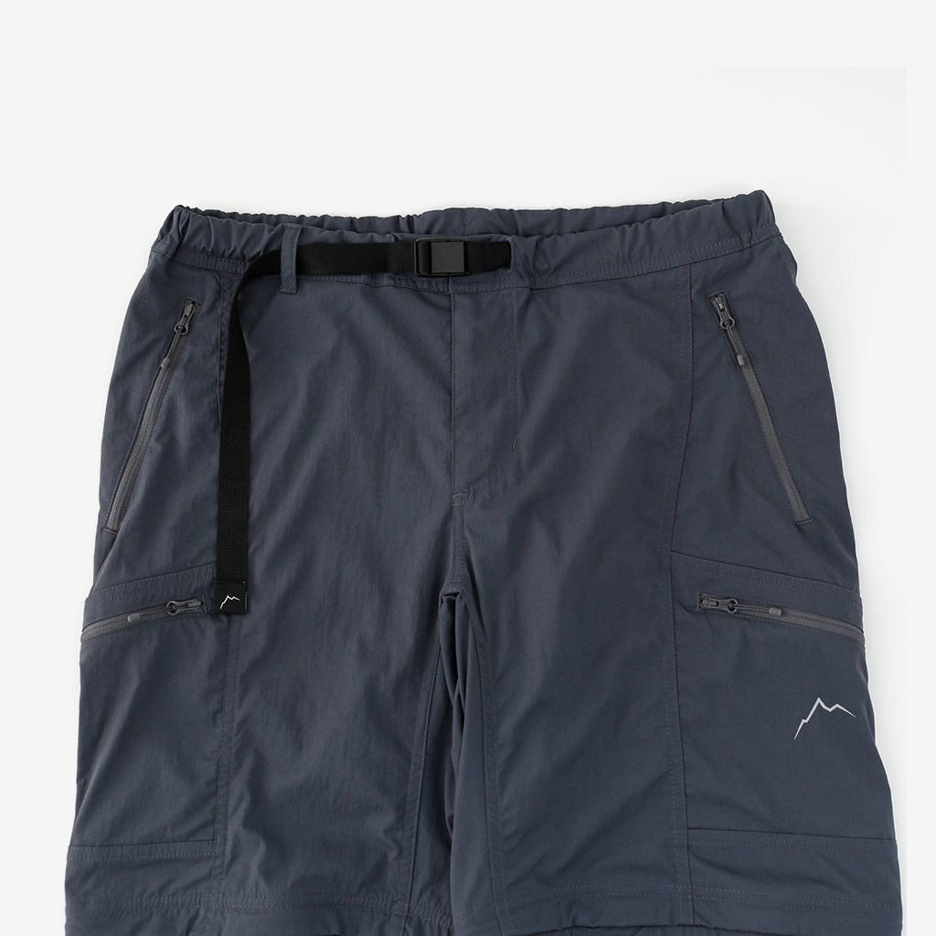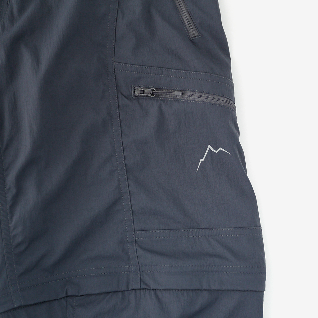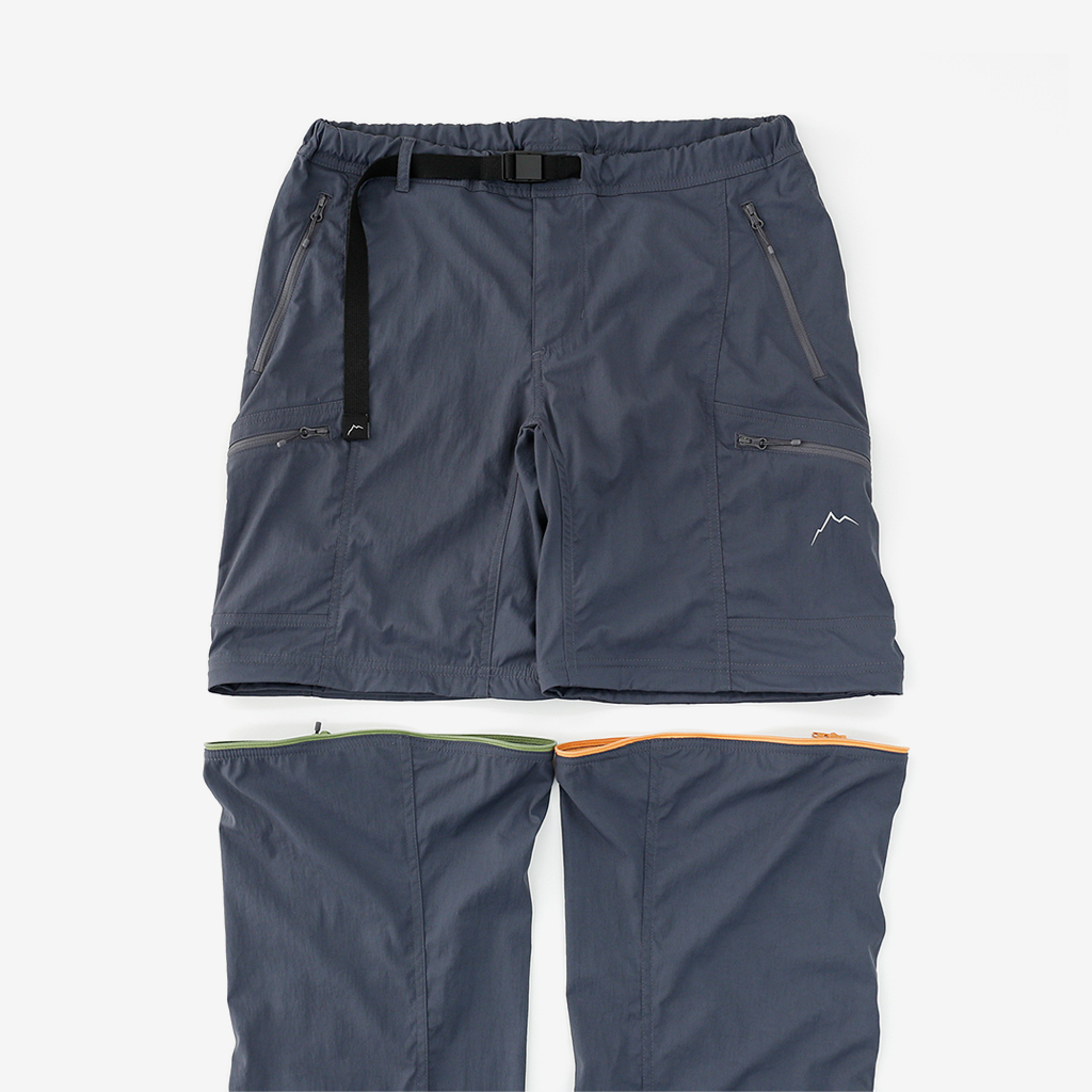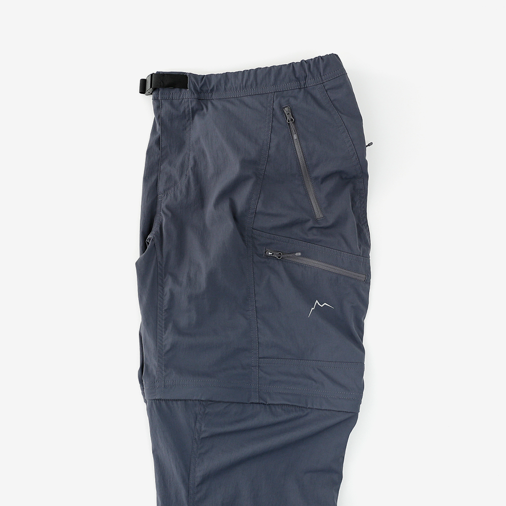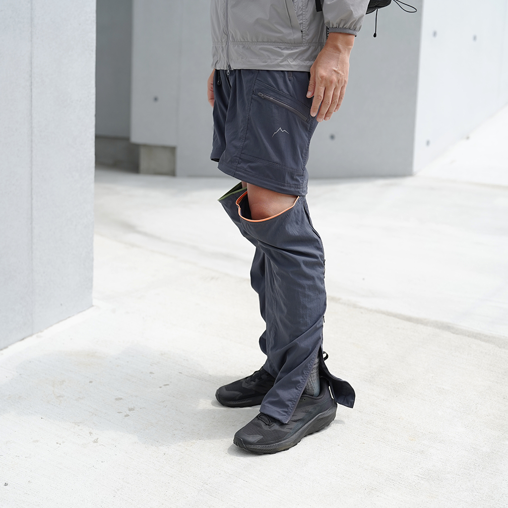 CAYL『Cargo 2way Pants 2』は、ストレッチ性、速乾性に優れるナイロンを採用した2wayで履けるハイキングパンツ。 コンバーチブルジッパーで切り離せば、ショートパンツとしても使えます。 また、サイドジッパーと組み合わせて、多彩なベンチレーションが可能で、ロングパンツのまま換気をしてオーバーヒートを防いだり、さまざまなシルエット、スタイリングも楽しめます。 サイドジッパーを開放してもはだけないよう、膝の外側付近にスナップボタンも備えています。 絶妙な生地厚のナイロンは、汗をかいても足に張り付きにくいサラッとしたしなやかな肌触りで、速乾性にも優れています。撥水コーティングのおかげで軽い雨でも安心です。 ウエストはゴムとウェビングベルトで直感的に絞り具合を調整可能。腰上で留めてアクティブに動いたり、食事などリラックスしたい時は緩めたり。 裾もストリングコードで絞れるので、ランや自転車、シューズやサンダルなどによって、丈感やシルエットも変えられます。 コンバーチブルジッパーは左右でカラーが異なり、デザインのアクセントだけでなく、ショートパンツからロングパンツにする際に左右がわかるようになっているところも気が利いています。 ハイク、クライミング、ラン、自転車、ファッションなど多彩に楽しむCAYLらしい、マルチなロングパンツです。 ※生地を挟まないようジッパーはゆっくりと動かしてください。 背面。 切り離した時に左右を間違えないよう、異なるジッパーカラーを採用しています。 裾はストリングコードで絞れるので、シューズやサンダルなどによって、丈感やシルエットも変えられます。 モデル:184cm/Lサイズ ショートパンツとしてはもちろん、ロングパンツのままでも多彩なベンチレーションが可能で、換気をしてオーバーヒートを防いだり、さまざまなシルエット、スタイリングも楽しめます。 モデル:182cm / Lサイズ ジップを開ければすぐに涼しくなります。 日焼けや擦り傷から守りつつ、必要な時だけサッと換気できるロングパンツとしても。 自分なりに使いこなすのも楽しい多機能パンツ。