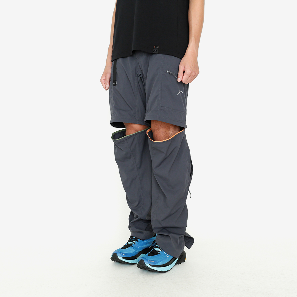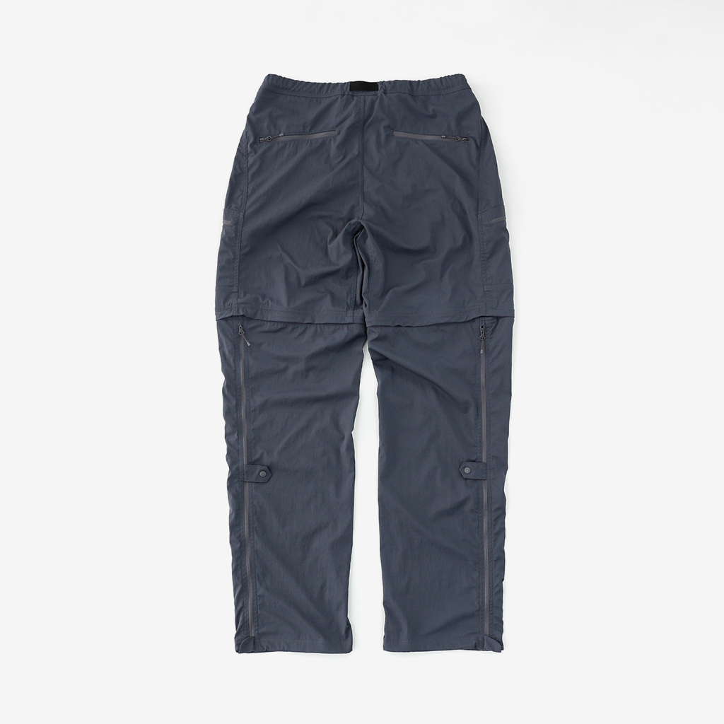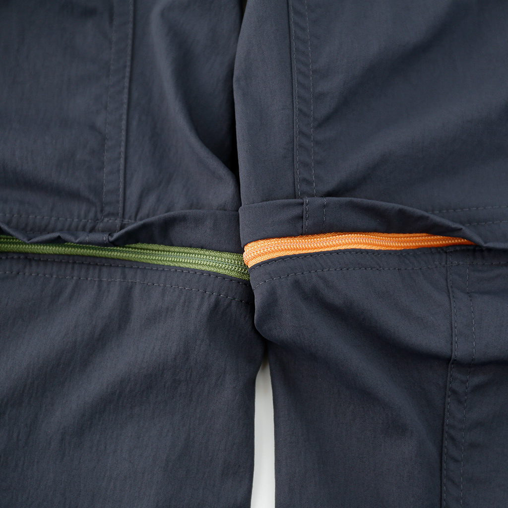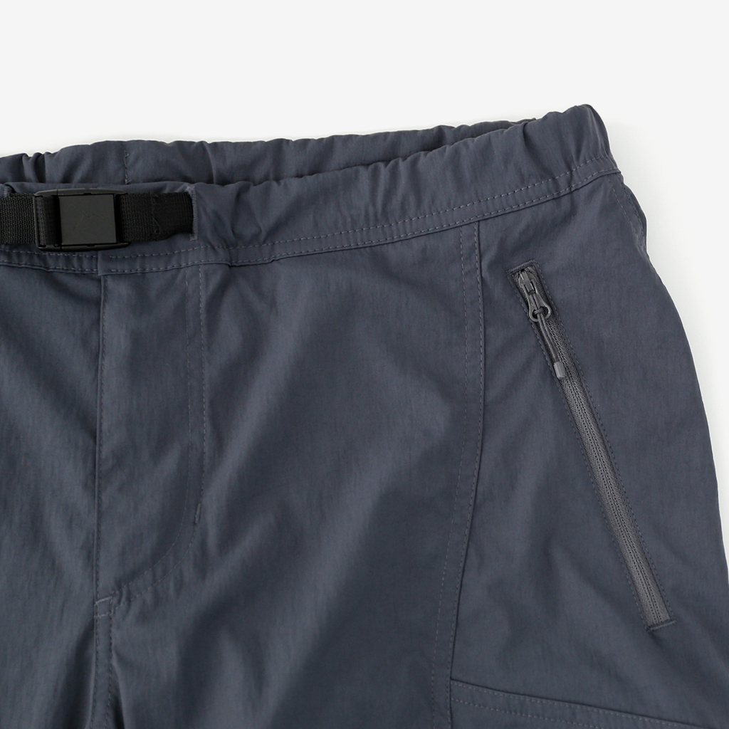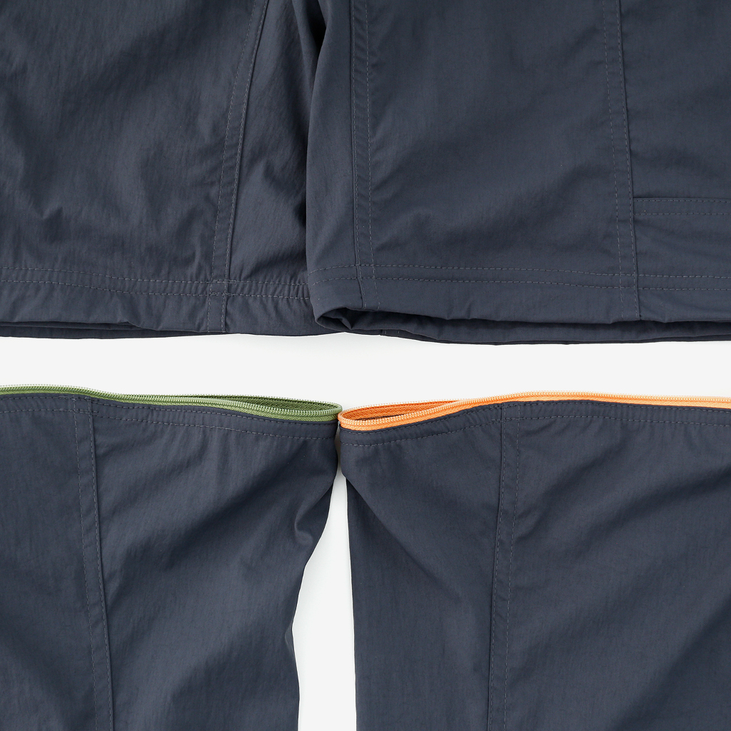 CAYL『Cargo 2way Pants 2』は、ストレッチ性、速乾性に優れるナイロンを採用した2wayで履けるハイキングパンツ。 コンバーチブルジッパーで切り離せば、ショートパンツとしても使えます。 また、サイドジッパーと組み合わせて、多彩なベンチレーションが可能で、ロングパンツのまま換気をしてオーバーヒートを防いだり、さまざまなシルエット、スタイリングも楽しめます。 サイドジッパーを開放してもはだけないよう、膝の外側付近にスナップボタンも備えています。 絶妙な生地厚のナイロンは、汗をかいても足に張り付きにくいサラッとしたしなやかな肌触りで、速乾性にも優れています。撥水コーティングのおかげで軽い雨でも安心です。 ウエストはゴムとウェビングベルトで直感的に絞り具合を調整可能。腰上で留めてアクティブに動いたり、食事などリラックスしたい時は緩めたり。 裾もストリングコードで絞れるので、ランや自転車、シューズやサンダルなどによって、丈感やシルエットも変えられます。 コンバーチブルジッパーは左右でカラーが異なり、デザインのアクセントだけでなく、ショートパンツからロングパンツにする際に左右がわかるようになっているところも気が利いています。 ハイク、クライミング、ラン、自転車、ファッションなど多彩に楽しむCAYLらしい、マルチなロングパンツです。 ※生地を挟まないようジッパーはゆっくりと動かしてください。 背面。 切り離した時に左右を間違えないよう、異なるジッパーカラーを採用しています。 裾はストリングコードで絞れるので、シューズやサンダルなどによって、丈感やシルエットも変えられます。 モデル:184cm/Lサイズ ショートパンツとしてはもちろん、ロングパンツのままでも多彩なベンチレーションが可能で、換気をしてオーバーヒートを防いだり、さまざまなシルエット、スタイリングも楽しめます。 モデル:182cm / Lサイズ ジップを開ければすぐに涼しくなります。 日焼けや擦り傷から守りつつ、必要な時だけサッと換気できるロングパンツとしても。 自分なりに使いこなすのも楽しい多機能パンツ。