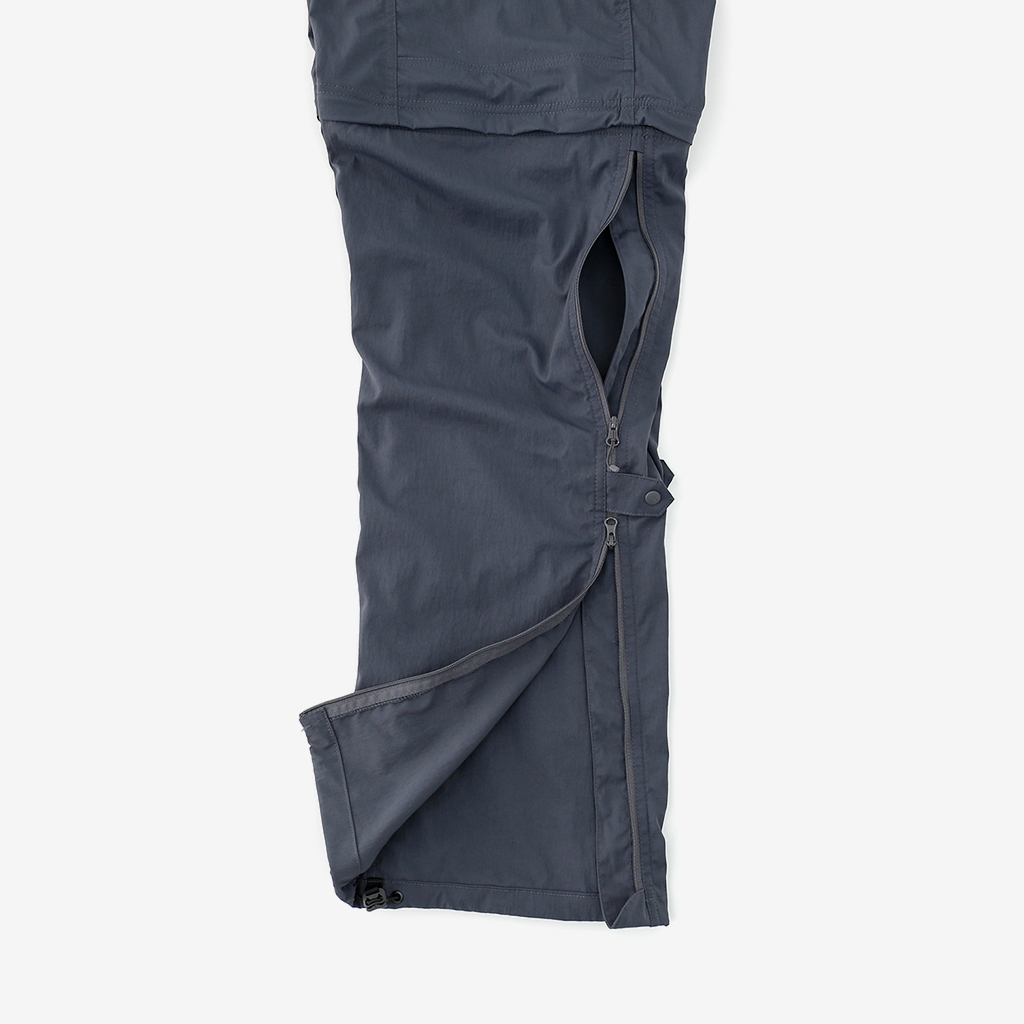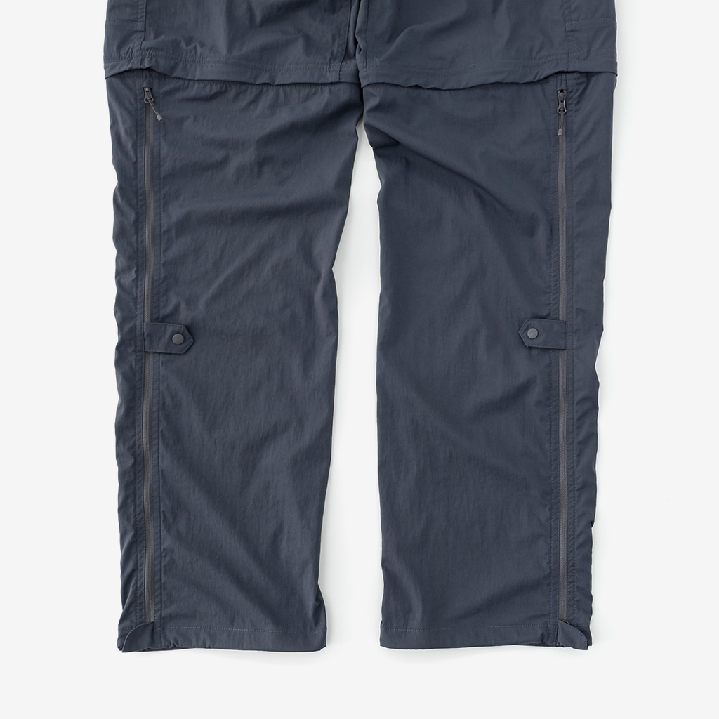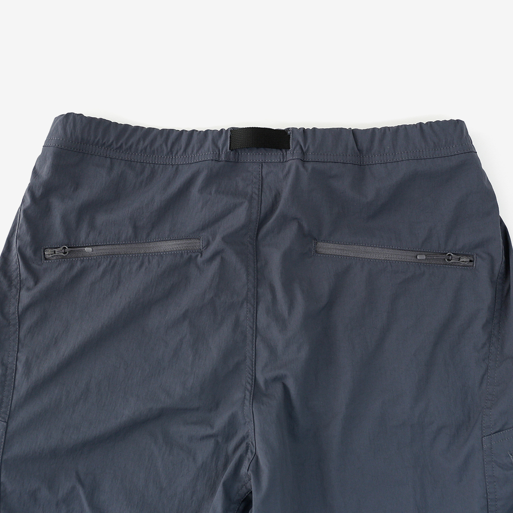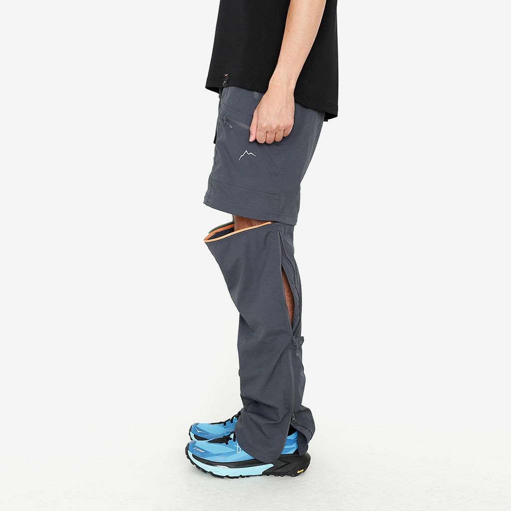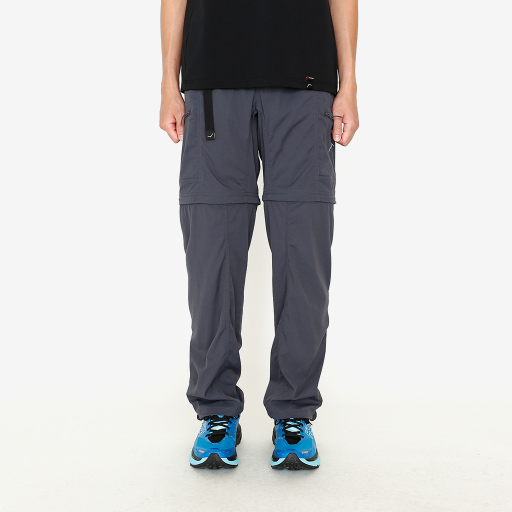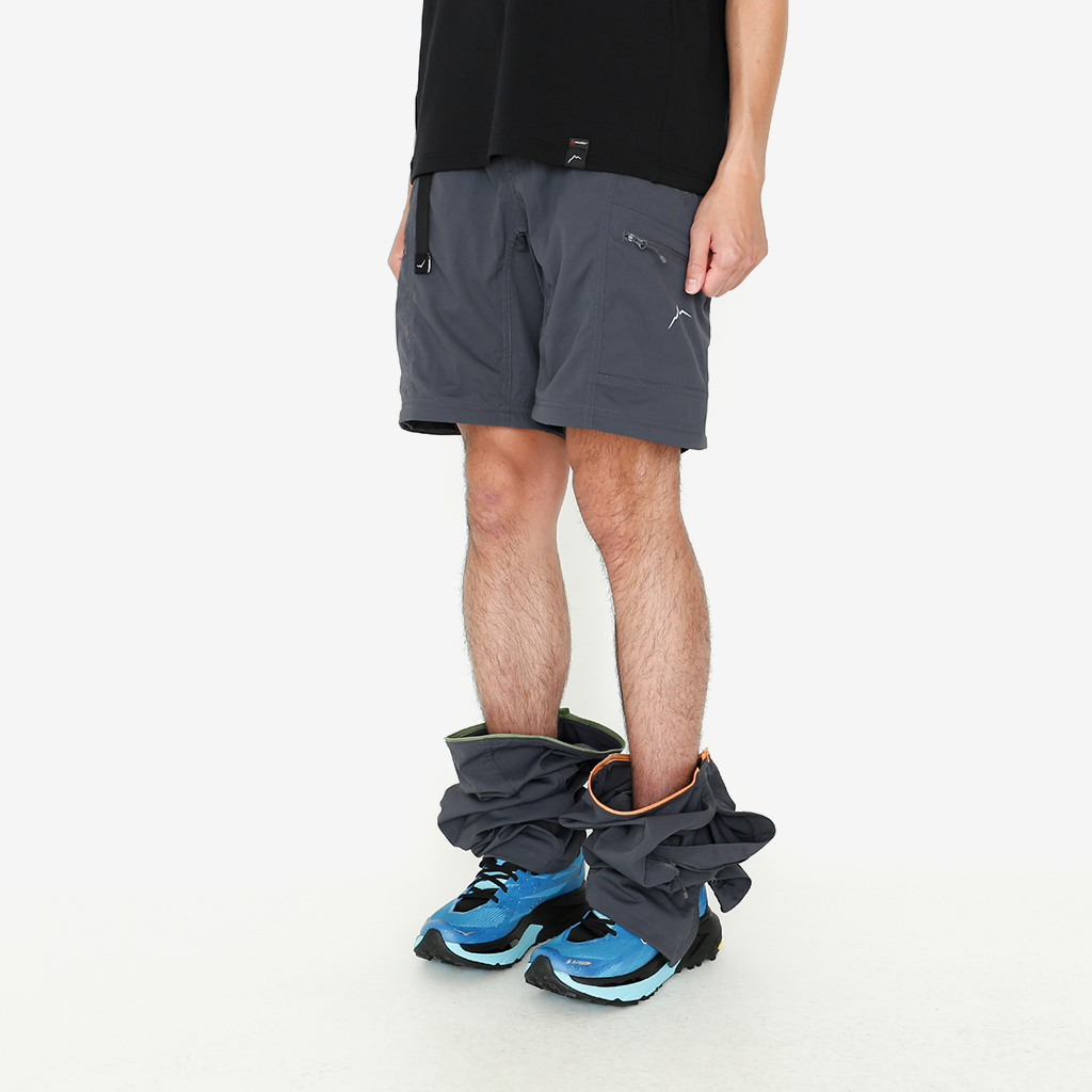 CAYL『Cargo 2way Pants 2』は、ストレッチ性、速乾性に優れるナイロンを採用した2wayで履けるハイキングパンツ。 コンバーチブルジッパーで切り離せば、ショートパンツとしても使えます。 また、サイドジッパーと組み合わせて、多彩なベンチレーションが可能で、ロングパンツのまま換気をしてオーバーヒートを防いだり、さまざまなシルエット、スタイリングも楽しめます。 サイドジッパーを開放してもはだけないよう、膝の外側付近にスナップボタンも備えています。 絶妙な生地厚のナイロンは、汗をかいても足に張り付きにくいサラッとしたしなやかな肌触りで、速乾性にも優れています。撥水コーティングのおかげで軽い雨でも安心です。 ウエストはゴムとウェビングベルトで直感的に絞り具合を調整可能。腰上で留めてアクティブに動いたり、食事などリラックスしたい時は緩めたり。 裾もストリングコードで絞れるので、ランや自転車、シューズやサンダルなどによって、丈感やシルエットも変えられます。 コンバーチブルジッパーは左右でカラーが異なり、デザインのアクセントだけでなく、ショートパンツからロングパンツにする際に左右がわかるようになっているところも気が利いています。 ハイク、クライミング、ラン、自転車、ファッションなど多彩に楽しむCAYLらしい、マルチなロングパンツです。 ※生地を挟まないようジッパーはゆっくりと動かしてください。 背面。 切り離した時に左右を間違えないよう、異なるジッパーカラーを採用しています。 裾はストリングコードで絞れるので、シューズやサンダルなどによって、丈感やシルエットも変えられます。 モデル:184cm/Lサイズ ショートパンツとしてはもちろん、ロングパンツのままでも多彩なベンチレーションが可能で、換気をしてオーバーヒートを防いだり、さまざまなシルエット、スタイリングも楽しめます。 モデル:182cm / Lサイズ ジップを開ければすぐに涼しくなります。 日焼けや擦り傷から守りつつ、必要な時だけサッと換気できるロングパンツとしても。 自分なりに使いこなすのも楽しい多機能パンツ。