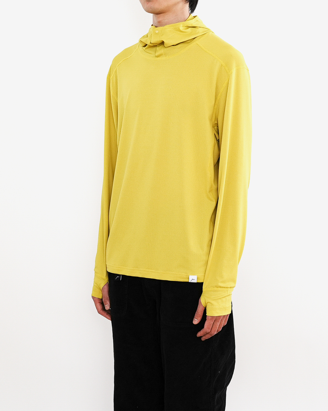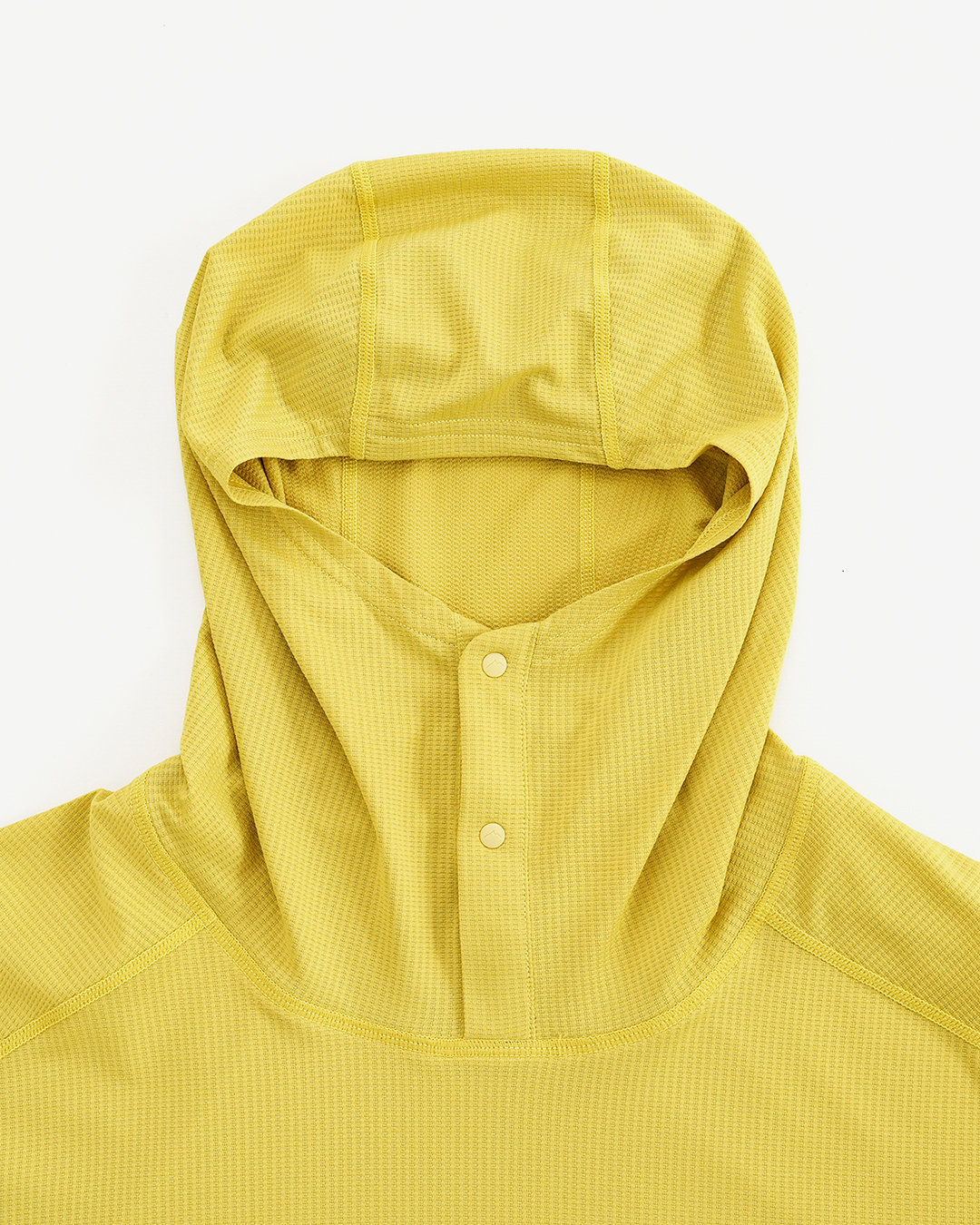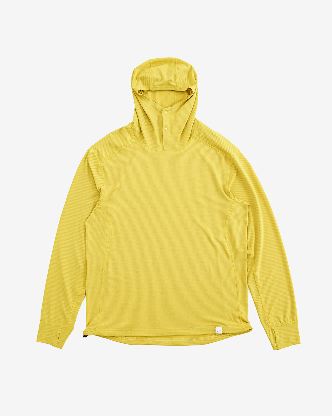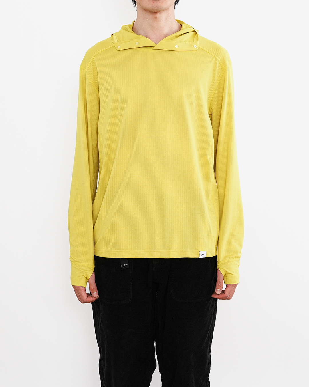 CAYL『Snap Air Hoody』は、CAYLオリジナル生地で作られた速乾ロングスリーブフーディー。 軽量で通気性が高く、吸汗速乾機能があり、さらにHeiq社の抗菌加工が施され、防臭効果もあります。 アルプスの稜線上などで日除けにフードを被っても、通気性が高く快適です。 フードの首元にはスナップボタン、袖口はサムホール仕様で、裾はコードで絞れます。 多くの汗をかくハイクやランニングのベースレイヤーとしても最適な万能フーディーです。