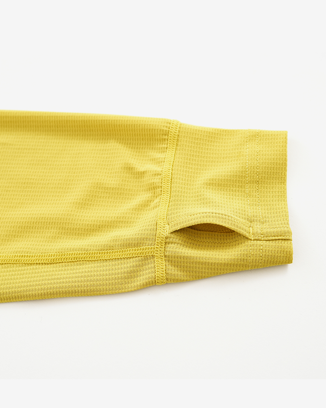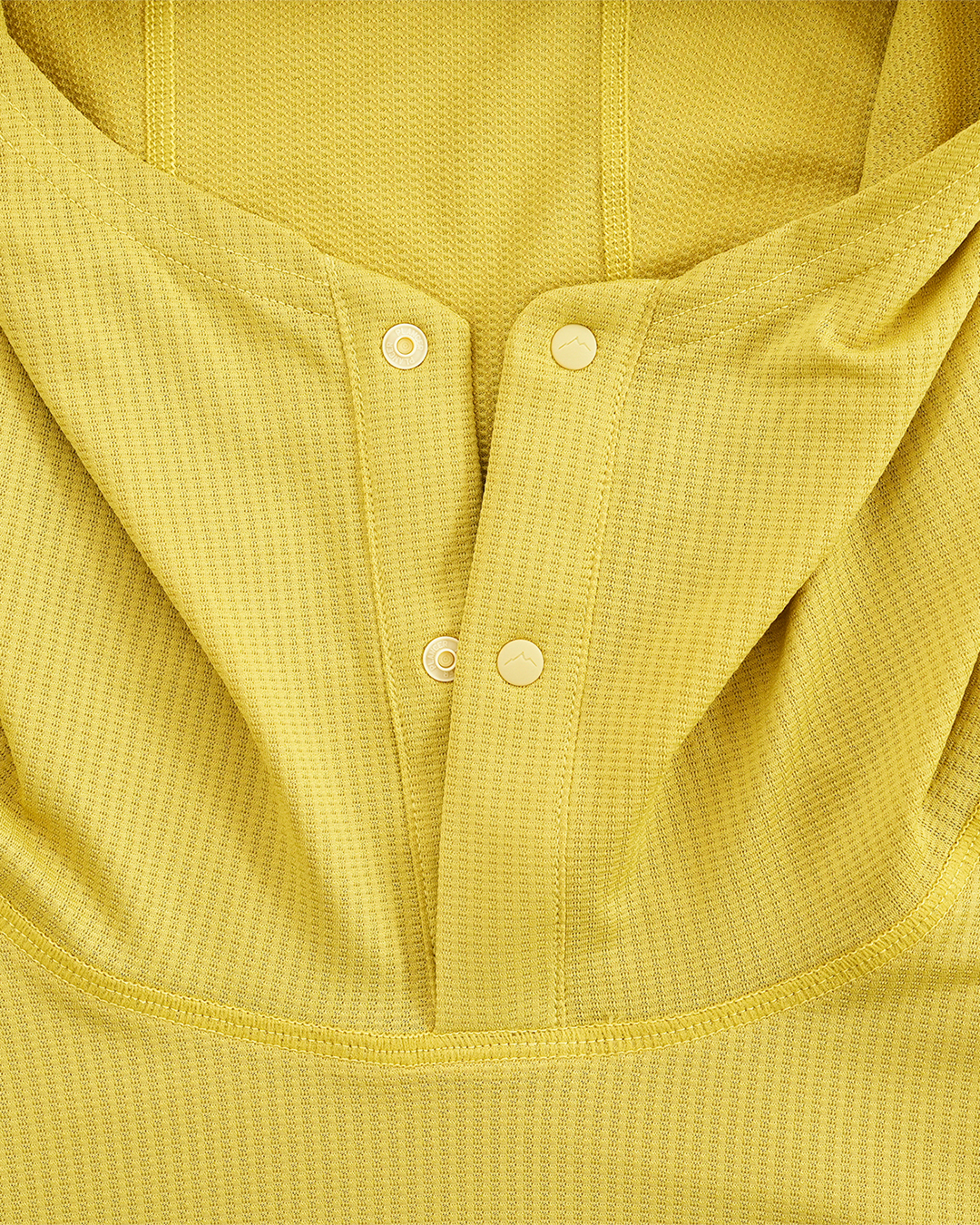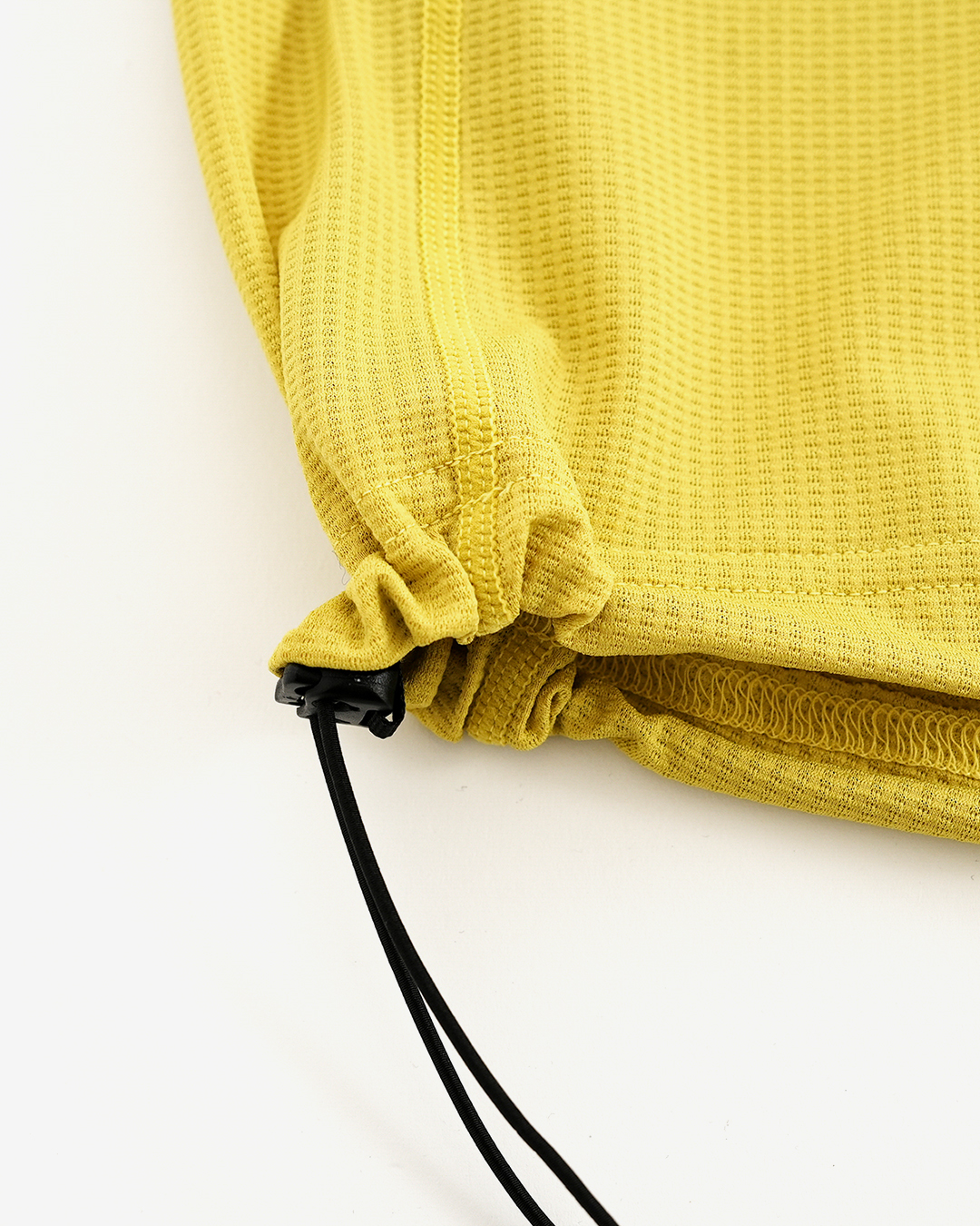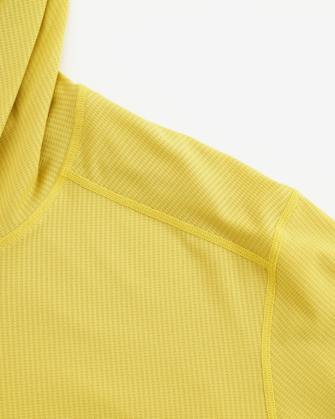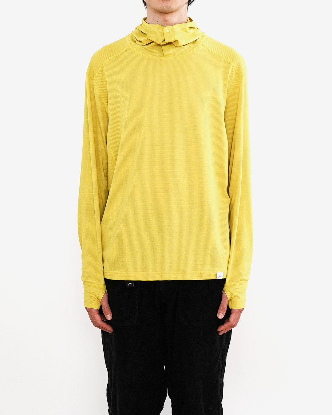 CAYL『Snap Air Hoody』は、CAYLオリジナル生地で作られた速乾ロングスリーブフーディー。 軽量で通気性が高く、吸汗速乾機能があり、さらにHeiq社の抗菌加工が施され、防臭効果もあります。 アルプスの稜線上などで日除けにフードを被っても、通気性が高く快適です。 フードの首元にはスナップボタン、袖口はサムホール仕様で、裾はコードで絞れます。 多くの汗をかくハイクやランニングのベースレイヤーとしても最適な万能フーディーです。