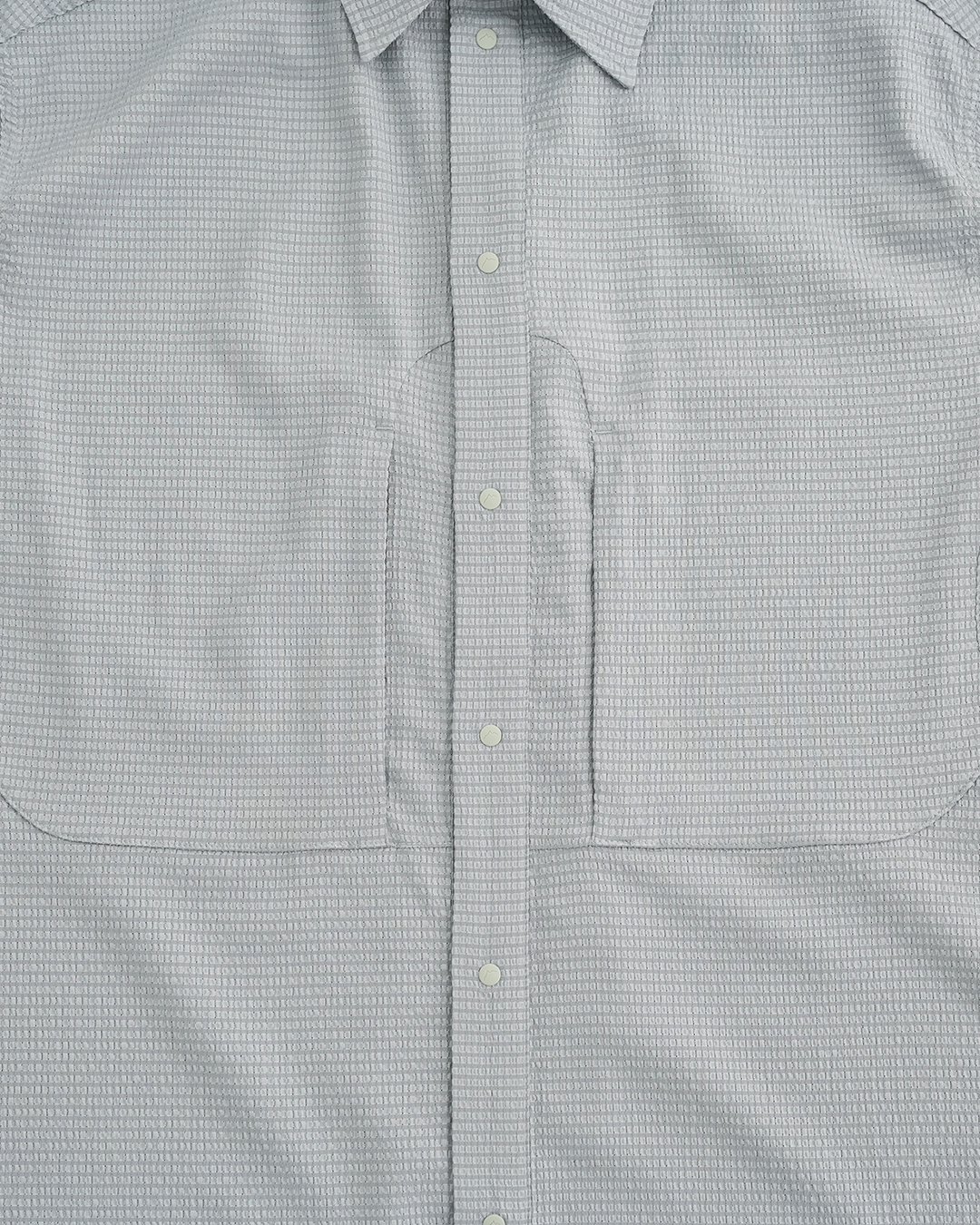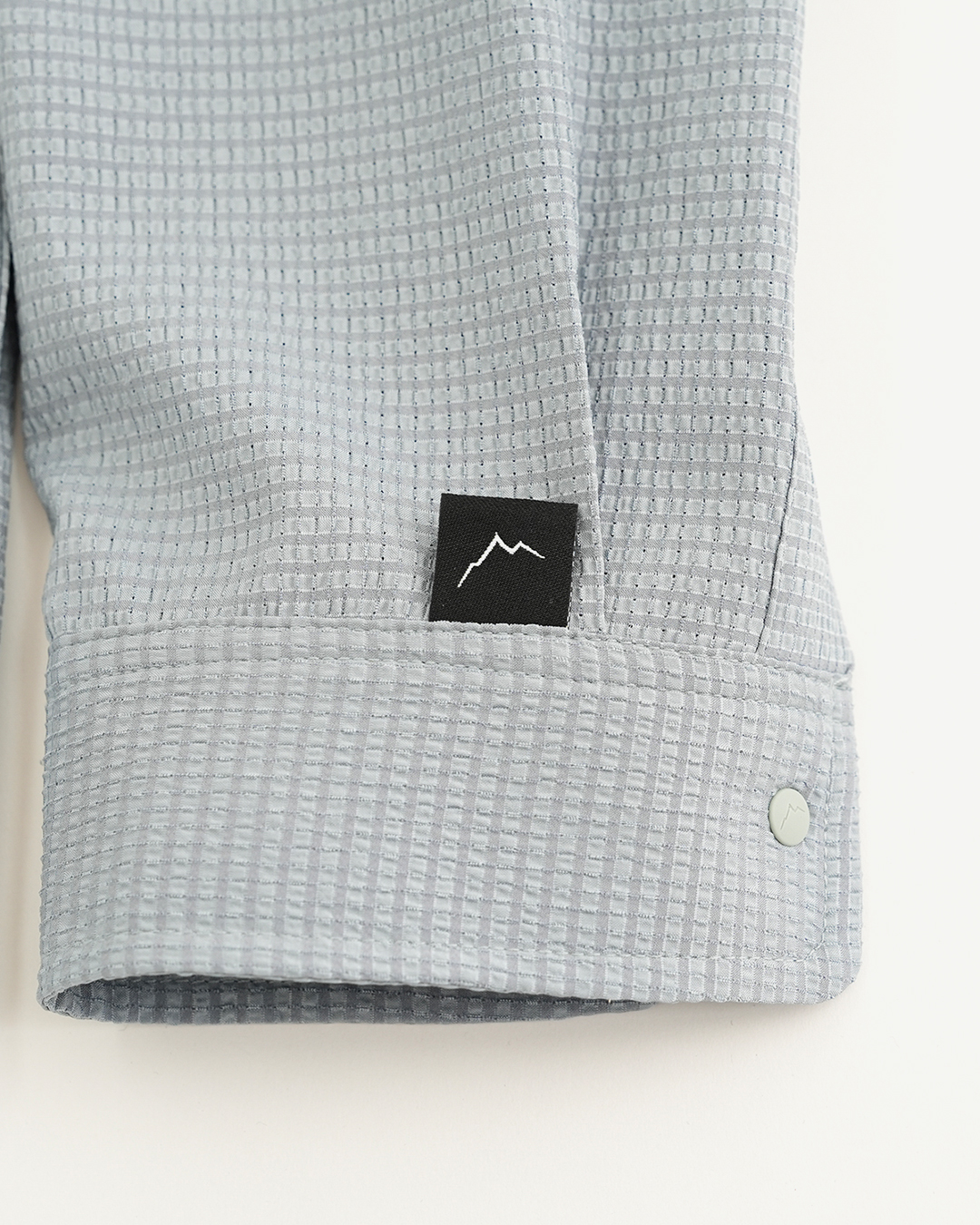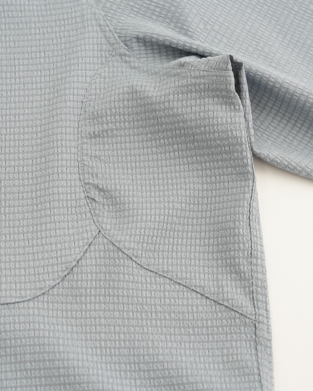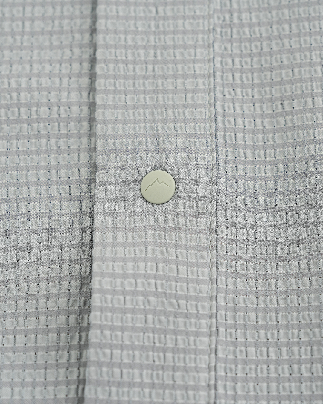凹凸のあるシアサッカー生地で作られた『Flow Seersucker Shirts』 生地全体に細かな穴が設けられていて、抜群の通気性と軽量性。 凹凸のある生地は、肌離れが良く、汗をかいても快適です。 薄手ながら撥水コーティングが施され、バックパックを背負っても干渉しづらい位置にジッパー付きポケットを備えます。 スナップボタンなので糸切れの心配もなく、スムーズに開け閉めできます。 夏の稜線での日焼け対策にも重宝します。 同素材で作られた『Flow Seersucker Hat』との組み合わせも◎