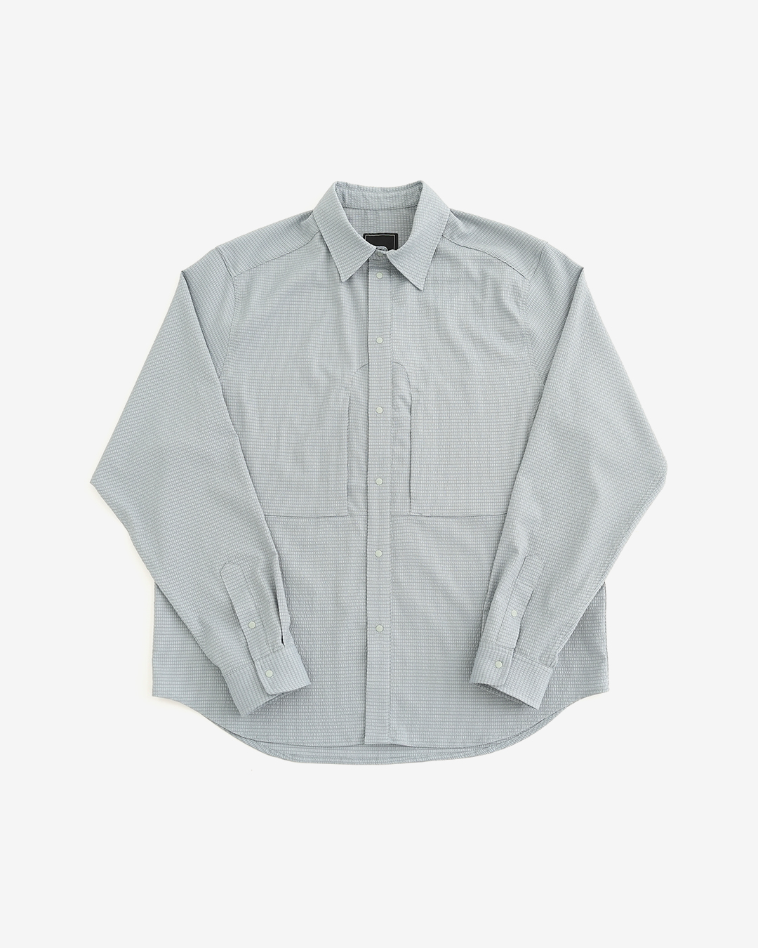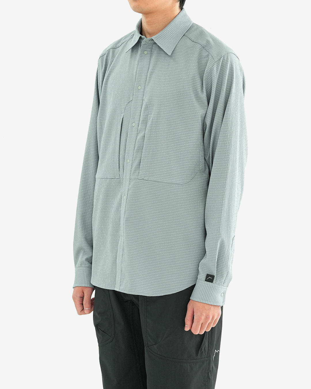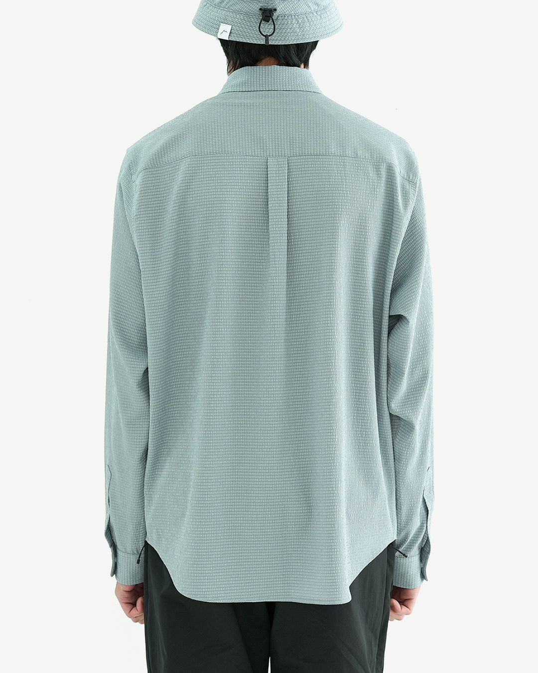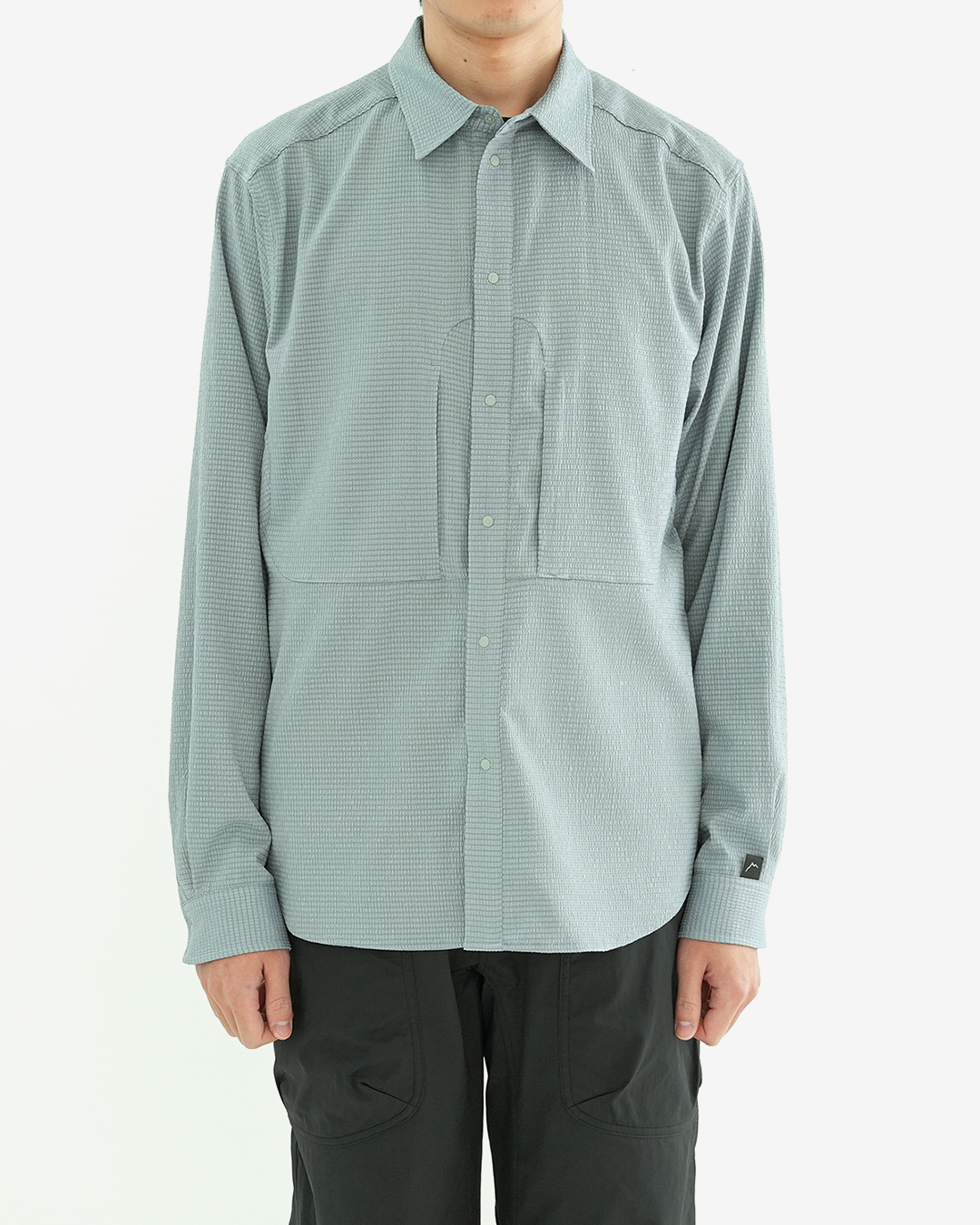 凹凸のあるシアサッカー生地で作られた『Flow Seersucker Shirts』 生地全体に細かな穴が設けられていて、抜群の通気性と軽量性。 凹凸のある生地は、肌離れが良く、汗をかいても快適です。 薄手ながら撥水コーティングが施され、バックパックを背負っても干渉しづらい位置にジッパー付きポケットを備えます。 スナップボタンなので糸切れの心配もなく、スムーズに開け閉めできます。 夏の稜線での日焼け対策にも重宝します。 同素材で作られた『Flow Seersucker Hat』との組み合わせも◎