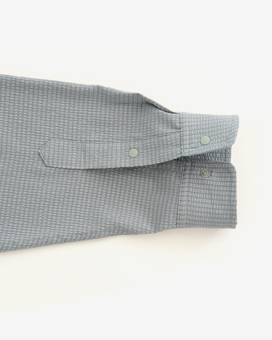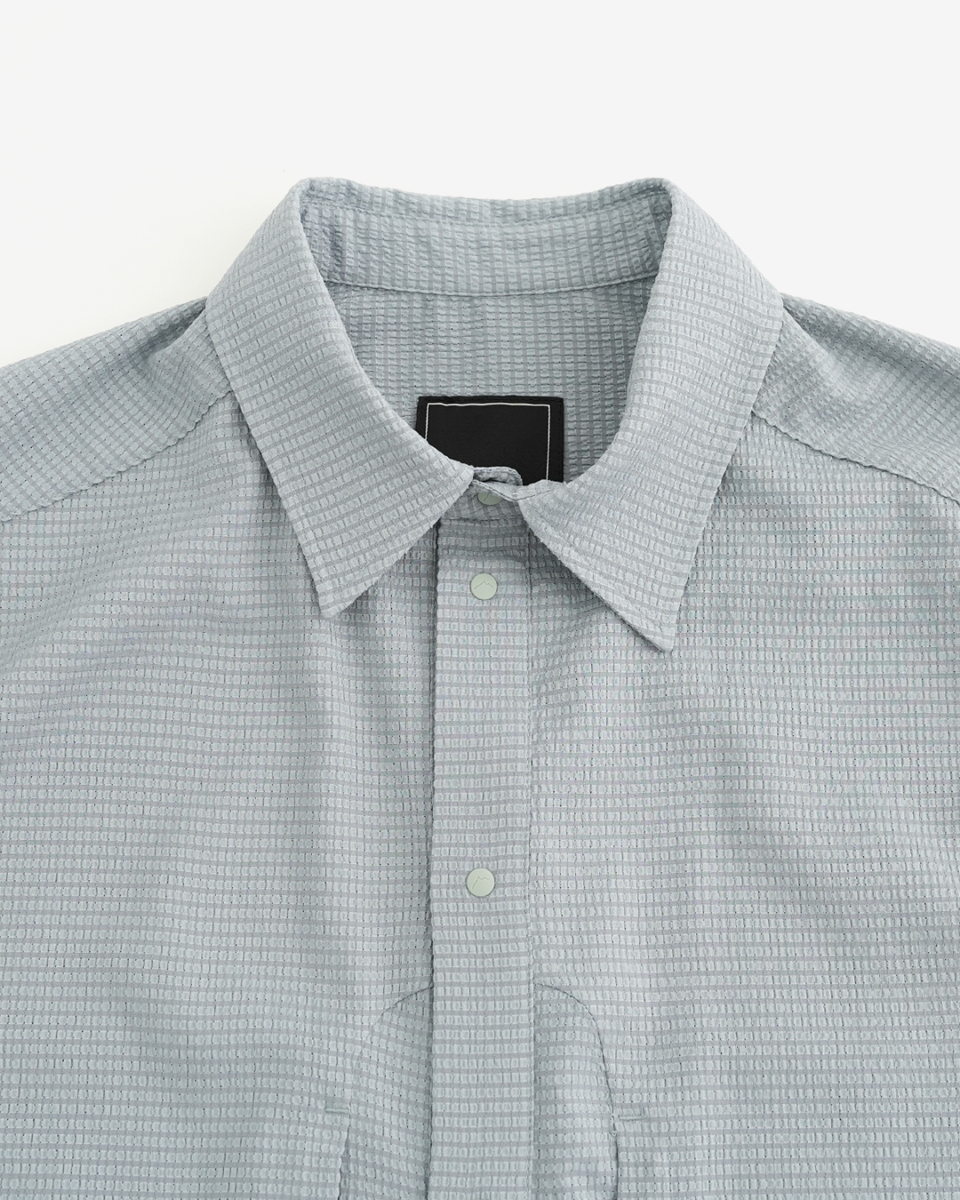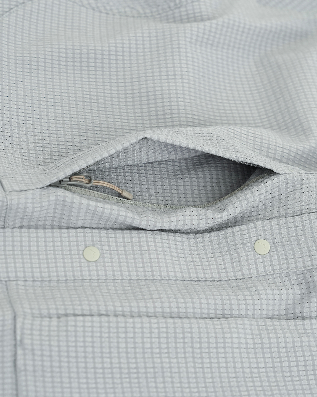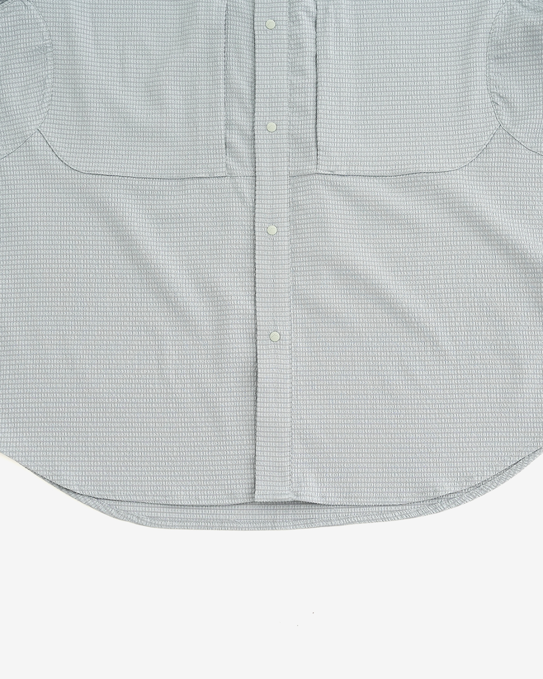 凹凸のあるシアサッカー生地で作られた『Flow Seersucker Shirts』 生地全体に細かな穴が設けられていて、抜群の通気性と軽量性。 凹凸のある生地は、肌離れが良く、汗をかいても快適です。 薄手ながら撥水コーティングが施され、バックパックを背負っても干渉しづらい位置にジッパー付きポケットを備えます。 スナップボタンなので糸切れの心配もなく、スムーズに開け閉めできます。 夏の稜線での日焼け対策にも重宝します。 同素材で作られた『Flow Seersucker Hat』との組み合わせも◎