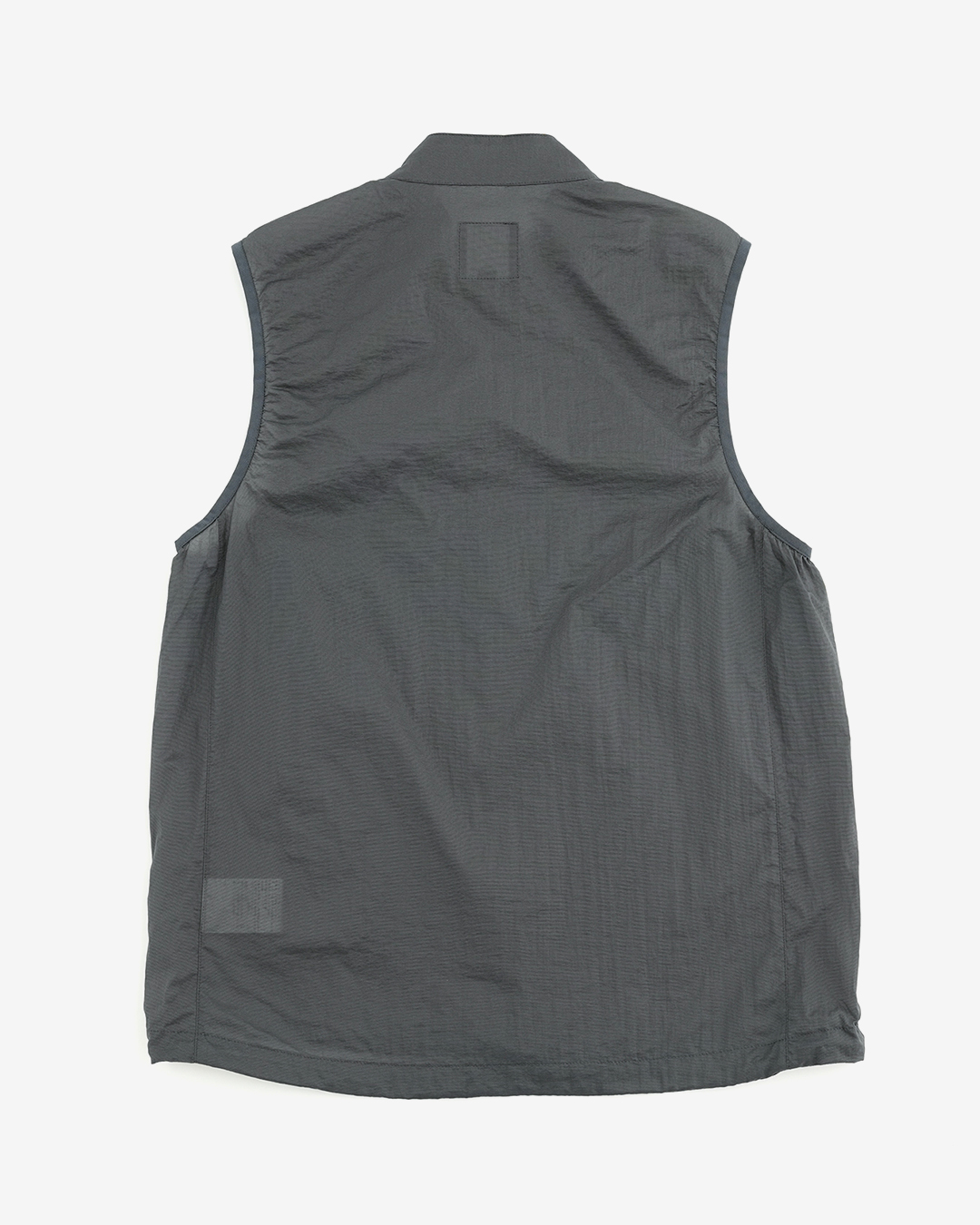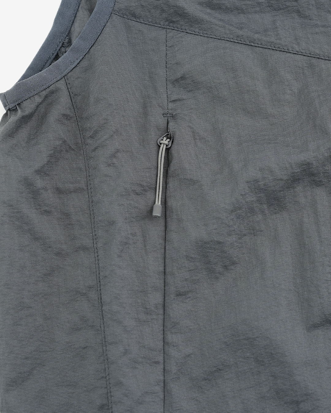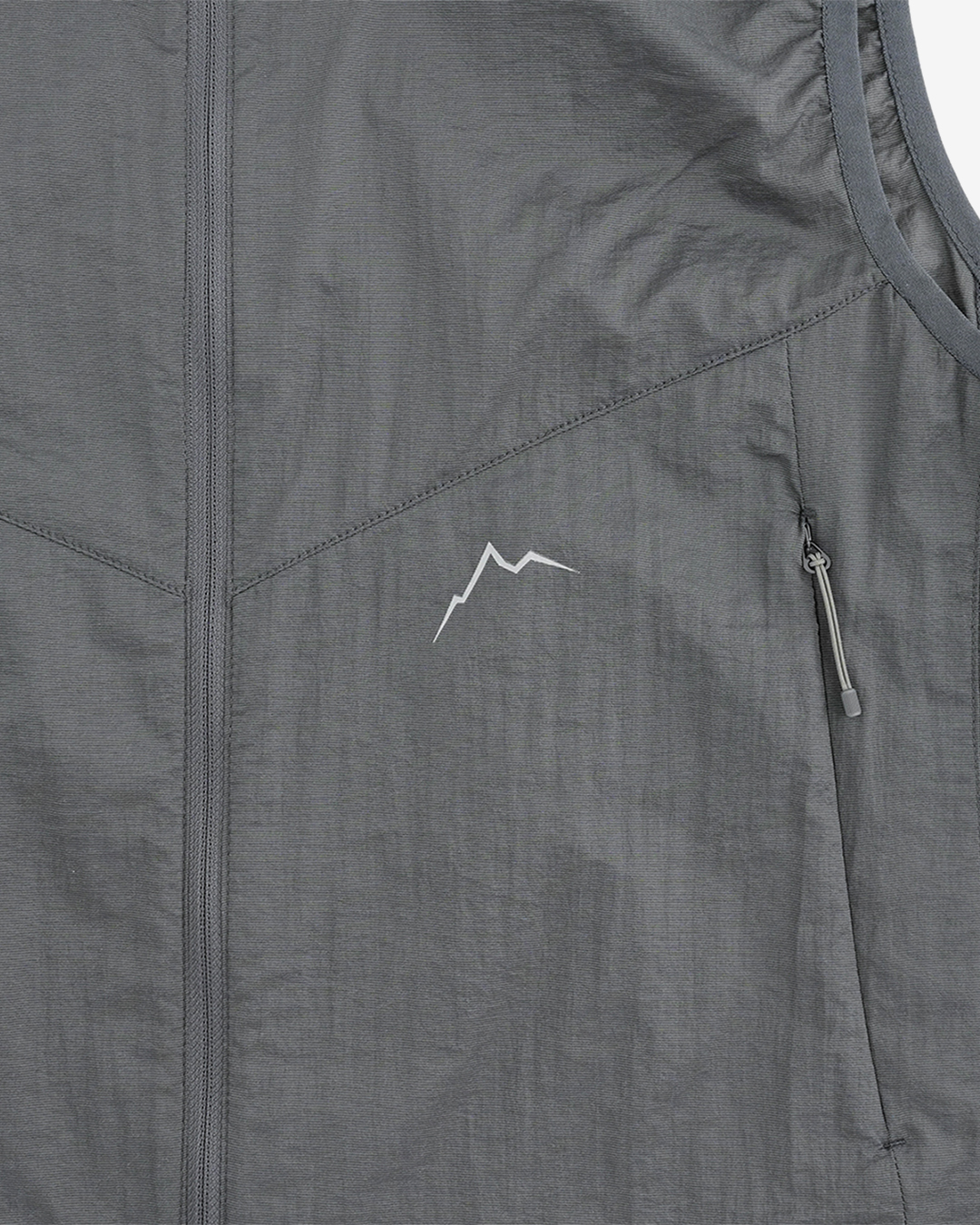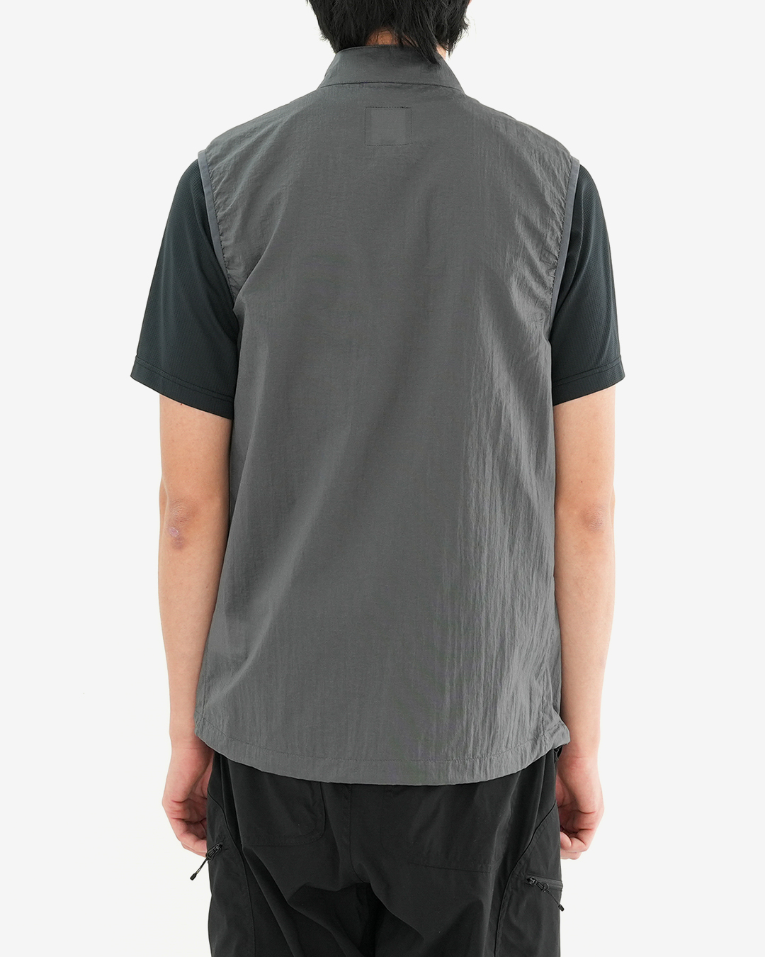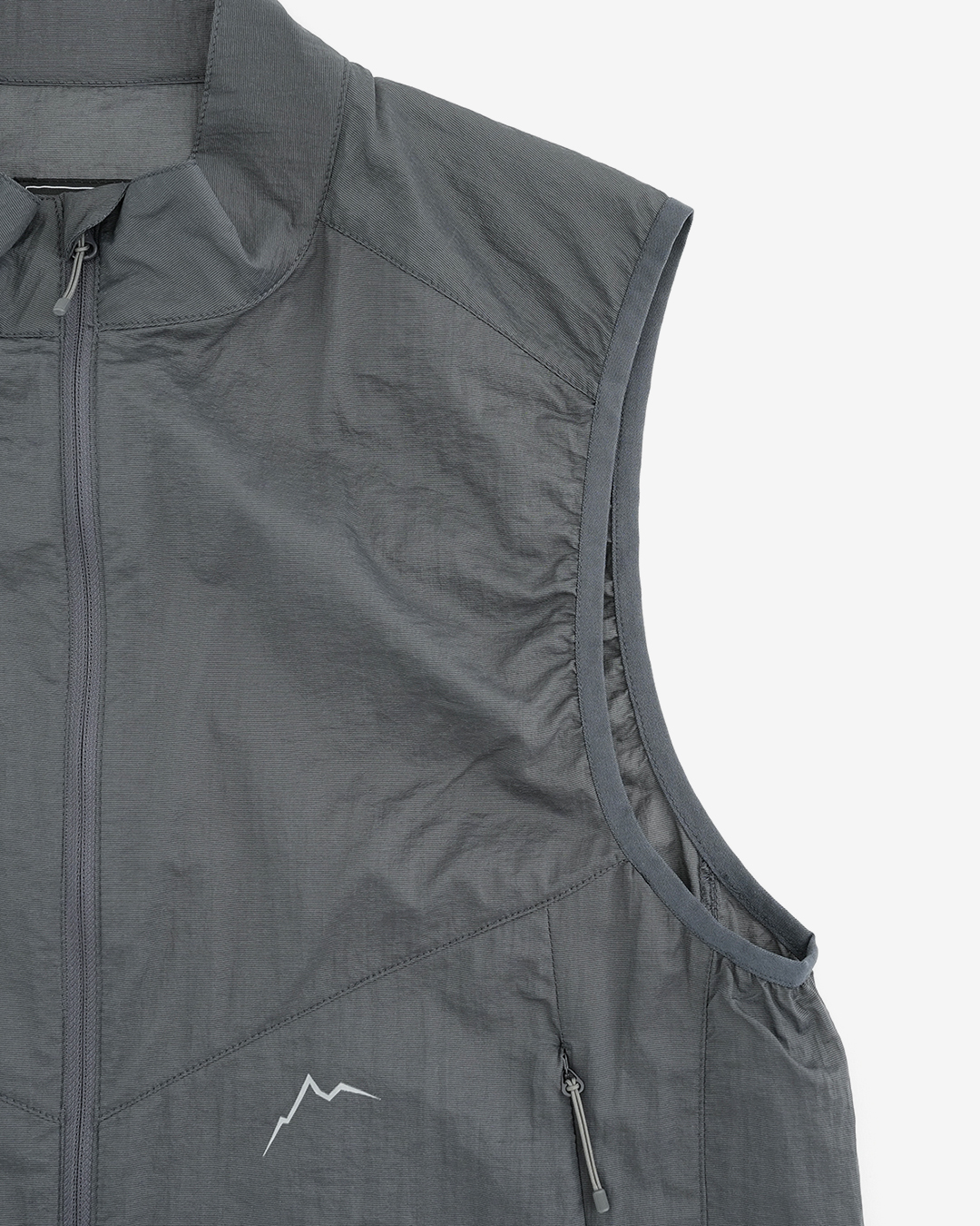 ファンの多いCAYLのReflectシリーズの最新作『Reflect Wind Vest』 軽量で防風性、通気性のバランスに優れたナイロン生地は、全体に反射プリントを施され、夜間の車やヘッドライトの光を反射し、安全に行動できます。 撥水加工もされており、ちょっとした雨なら凌げて、収納もコンパクト。 フロントはダブルジップなので、手軽にベンチレーションを調整でき、裾はコードで絞れます。 薄くてもしっかり防風してくれるので、アクティビティはもちろん、旅行、デイリーユースにも、1枚あるととても重宝するウインドベスト。スタイリングのアクセントにも最適です。 Black、Dark Grey、Dark Blueの3カラー展開になります。 背面。 フロントはダブルジップでベンチレーション調整もスムーズ。 裾はコードで絞れます。 モデル:184cm / Lサイズ 強い光が当たるとリフレクタープリントが浮かび上がります。