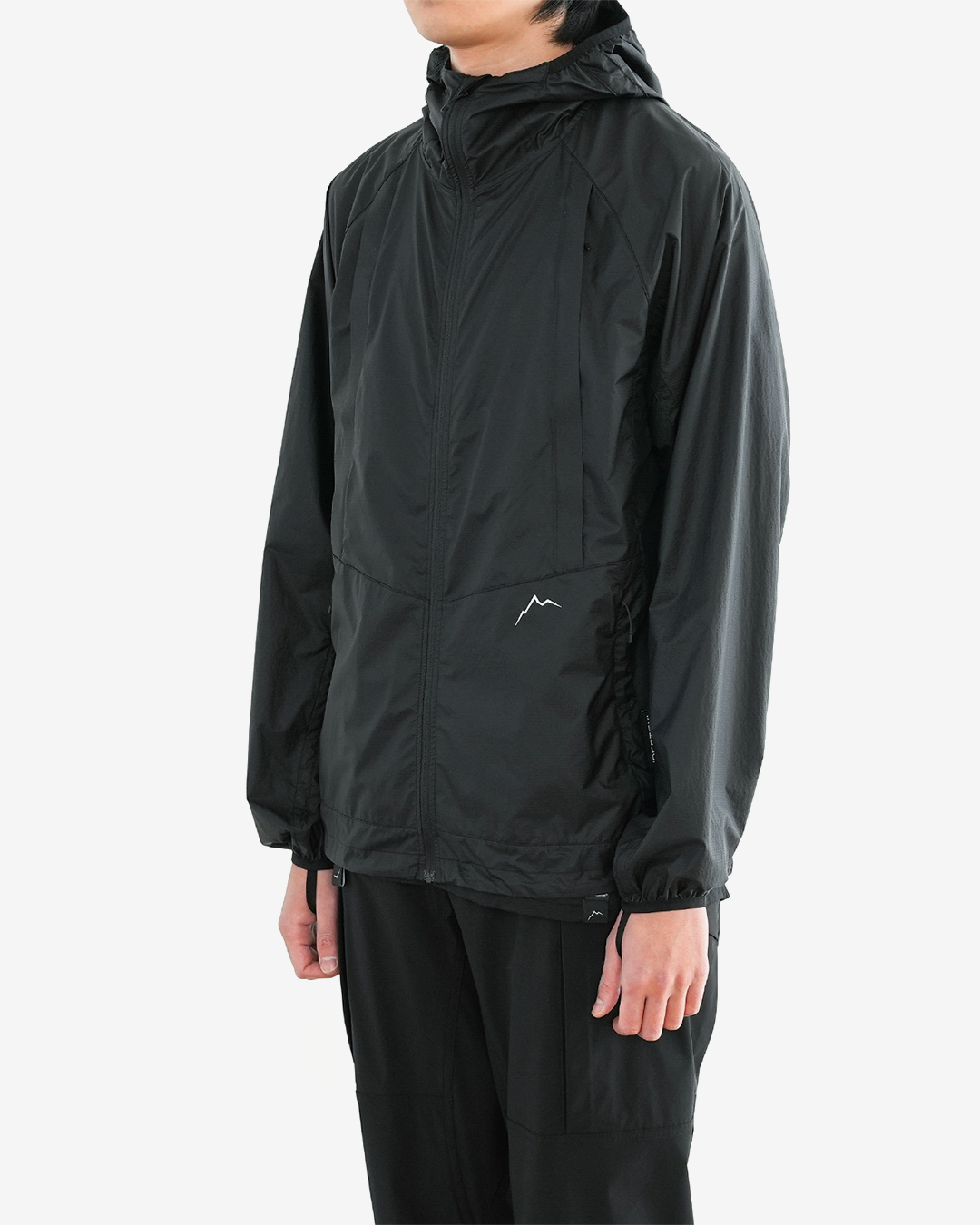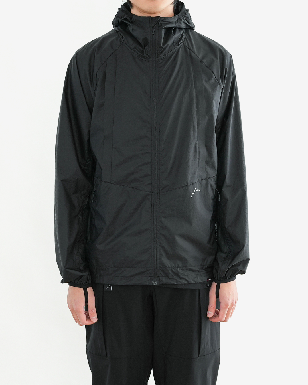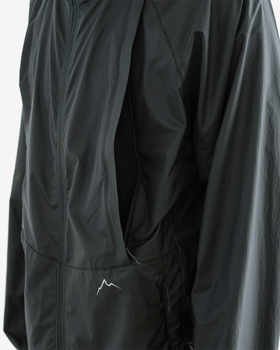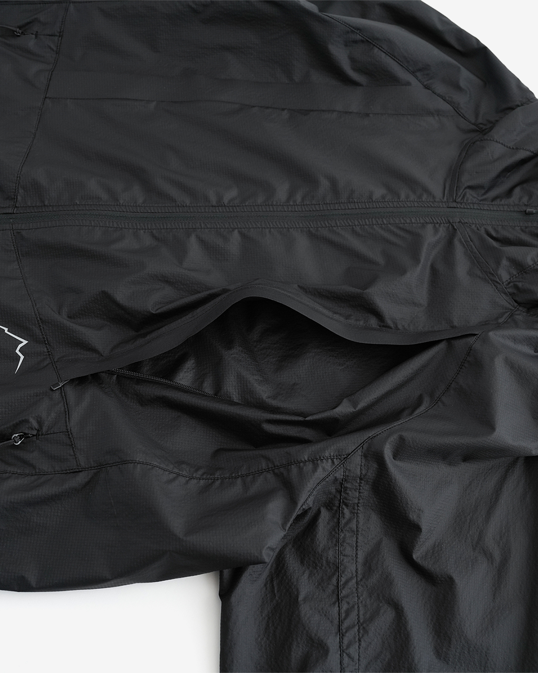 ユニークなベンチレーション構造を取り入れたウインドシェル。 両胸付近に大きく配されたジッパーが、ベンチレーションとともに、ランニングベストなどの上から羽織った時にドリンクボトルやハイドレーションチューブに直接アクセスできるようにしています。 さらに背面の肩部分と、肘の内側付近にもベンチレーションを備え、ランニングやスピードハイクなど負荷の高いアクティビティ中にもスピーディーに熱を逃がし、オーバーヒートしないよう体温コントロールができるようになっています。 採用している「Pertex Quauntum Air」は、軽量ながら耐風性と通気性のバランスを高次元で融合させた高機能素材。 撥水加工も施され、ちょっとした雨なら凌げて、収納もコンパクトに。 フードと裾はバンジーコードで調整可能。袖口はサムホール仕様になっています。 デザインと機能性をミックスさせたCAYLらしいウインドシェルです。 ユニークな両胸の大きなジッパー。ベンチレーションとともに、ランニングベストなどの上から羽織った時にドリンクボトルやハイドレーションチューブに直接アクセスできるようにしています。 裾はコードで絞れ、シルエットや丈感も調整できます。 肘の内側付近のベンチレーション。スナップボタン式になっています。 袖口のサムホール仕様。 背面部分のベンチレーション。 袖の後ろ側にはリフレクターが2か所。夜間のランニングなどで車からの視認性を確保しています。 モデル:184cm / Lサイズ