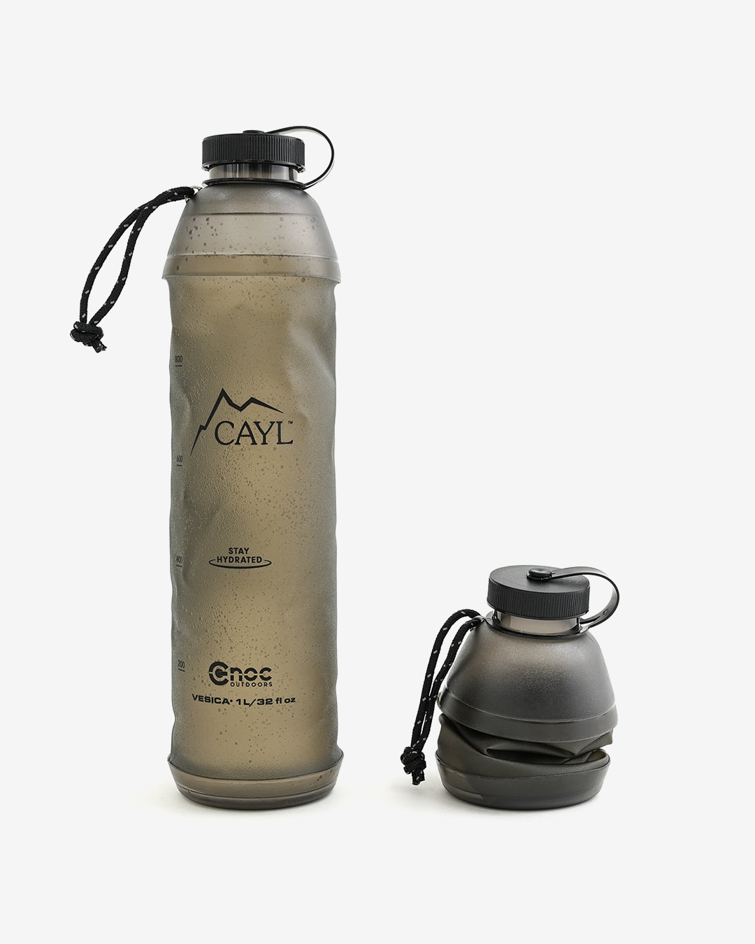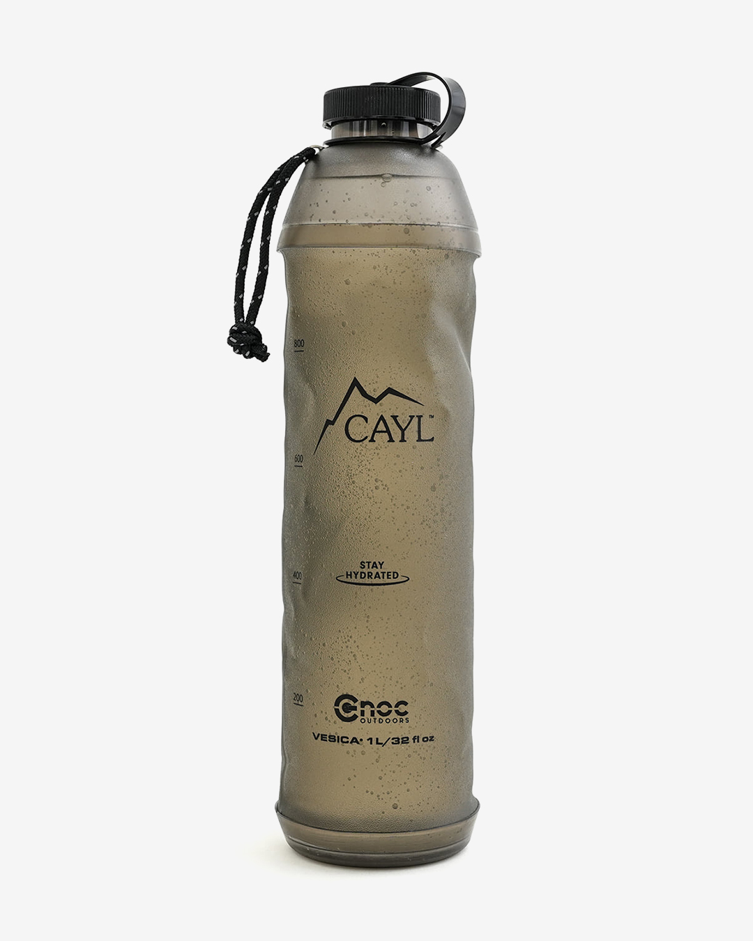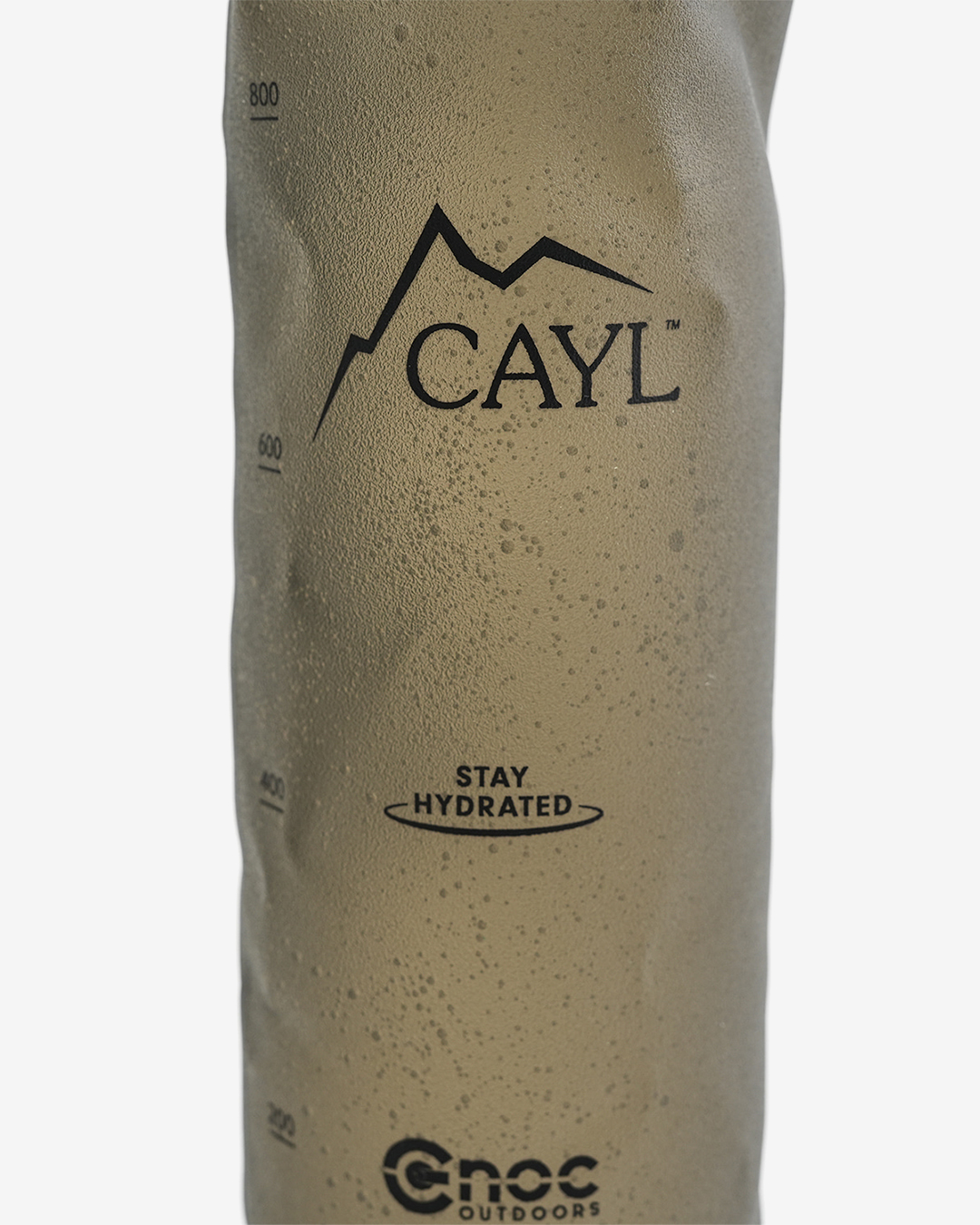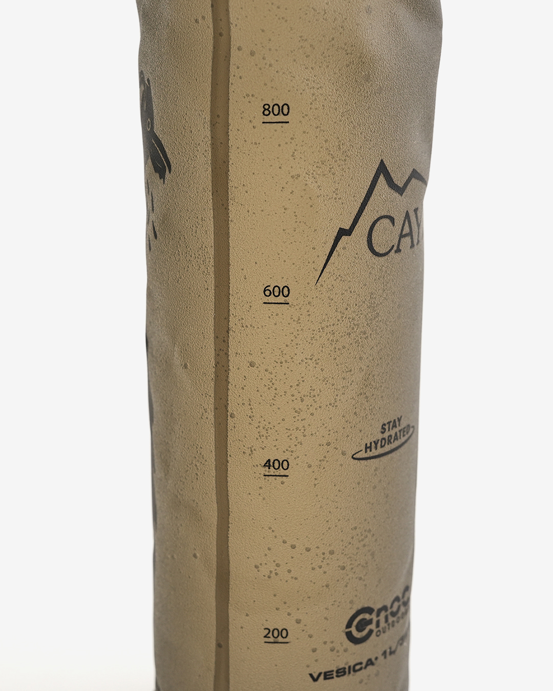 韓国ソウル発のアウトドアブランドCAYLが、CNOCに別注した1000mlサイズのウォーターボトル。 従来のクリアタイプよりも、ソフトフラスク部分を厚めにして、強度を加えています。 容量は1000mlと大型サイズながら軽量で、使わない時はコンパクトに収納できます。一般的なソフトフラスクと異なり底部と入口付近は硬いプラスチックで作られているため、自立するのも大きな魅力。 また、42mmの口径は、KATADYNのBefreeフィルターも取り付け可能。ソフトボトルの利点を活かし、素早く浄水できます。 バッグのサイドポケットに入れた際も潰れず、ガイラインループがついているので指を引っ掛ければスムーズに取り出せます。 また表面も滑りにくいマットな質感で、前屈みになってもポケットから落ちにくいのも使いやすいポイント。 登山、ランニング、旅にも便利なハイブリッドソフトボトルです。 ※TPU素材のソフトフラスクは、正しい洗浄と完全な乾燥が使用期間を延ばします。 1. 基本的な洗浄方法(使用後毎回) 台所用中性洗剤を溶かして振って洗ってください。 ボトルブラシを使うと隅々まで洗えます。 2. 新製品特有のプラスチック臭を除去 レモン汁1/4カップとベーキングソーダ1スプーンを水に混ぜて入れ、数時間置いてから洗い流してください。 レモン汁とベーキングソーダを混ぜた水を入れて一晩凍らせ、解凍して洗うと臭いを取り除くのに効果的です。 3. 保管と乾燥 洗浄後は必ず逆さに吊るして内部の水分を完全に乾かしてください。 完全に乾燥させるのが難しい場合は、きれいに洗った後、水気を切って冷凍庫に保管してください。細菌やカビの繁殖を抑制します。 長期保管する際は、空気が通るように蓋を開けておくことをおすすめします。 ガイラインループがついているので指を引っ掛ければスムーズに取り出せます。 200ml刻みで目盛りも付いています。 収納時は手のひらサイズに。 一般的なソフトフラスクと異なり、底部と入口付近は硬いプラスチックで作られているため、自立します。 CAYLオリジナルのグラフィックデザイン。 42mmの口径は、KATADYNのBefreeフィルターも取り付け可能。