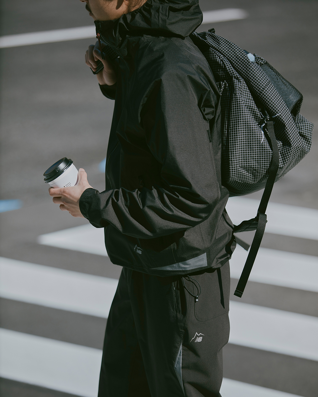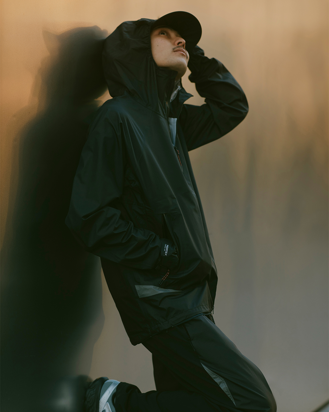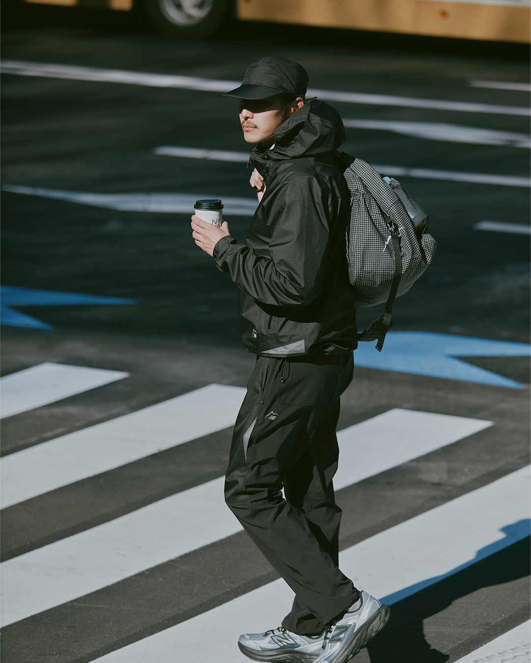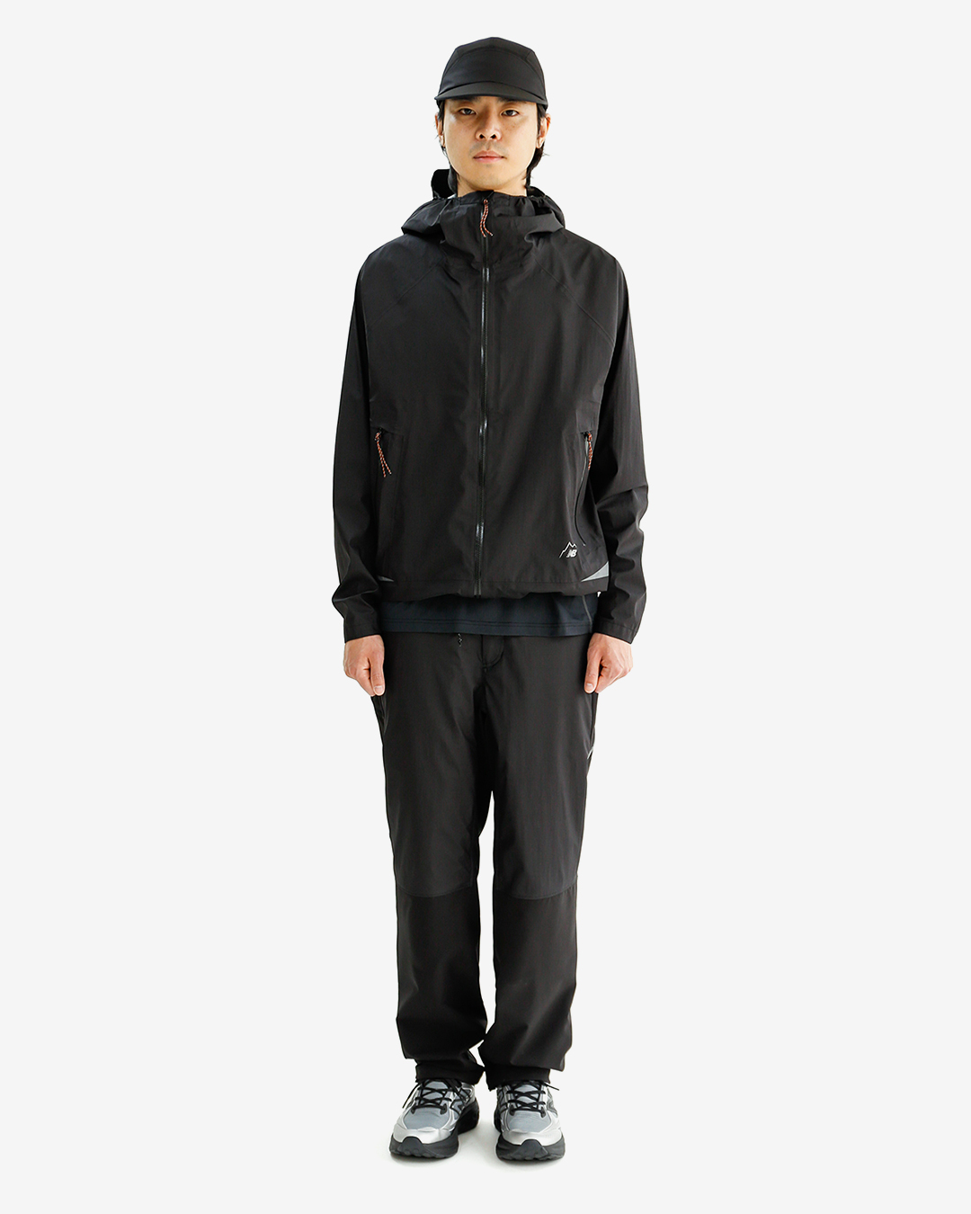 韓国・ソウルのアウトドアブランド【CAYL】と【New Balance】がコラボレーション! 「Own your own rhythm, from the city to the trail.」をテーマに、シューズとウェアのカプセルコレクションをリリース。 抜群の透湿性で快適に行動できる軽量レインジャケット。 ナノフィルムを用いた3レイヤー生地は、防水性や耐風性、耐久性はしっかり備えながら、65,000 g/m2/24hものハイレベルな透湿性を実現しています。 フロントはダブルジッパー、脇はベンチレーション構造になっていて、状況に応じてベンチレーションレベルを調整できます。 フードと裾はストリングコードでフィッティング調整が可能。 高温多湿な日本の気候にもマッチした素材は、優れた透湿性により衣服内がドライな状態に保たれ、着心地はしなやかで軽く。まるでウインドシェルのように着れるマルチなレインジャケットです。 【CAYL】 ハイキング、トレイルランニング、クライミングを楽しむデザイナー自身のフィールドワークでの豊富な経験を活かした、機能美と高いデザイン性を兼ね備えたアイテムが、ヨーロッパや日本など海外での存在感も急速に高まっているソウル発のアウトドアブランド。 高機能素材を用いて、対候性、軽量性、収納性、速乾性、フィット感、使い心地など、フィールドでのさまざまなシチュエーションに柔軟に対応する多彩な機能性に加え、そのスタイリッシュなデザインは、都市とフィールドを自由に行き来するユーザーたちに支持されています。 背面。 脇下のベンチレーションホール。 裾はコードで絞れ、シルエットや丈感も調整できます。 モデル:179cm 『NB CAYL 3L Softshell Cap』 『NB CAYL 3L Jacket』Lサイズ 『NB CAYL 3L SoftShell Pants』Lサイズ モデル:184cm / Lサイズ