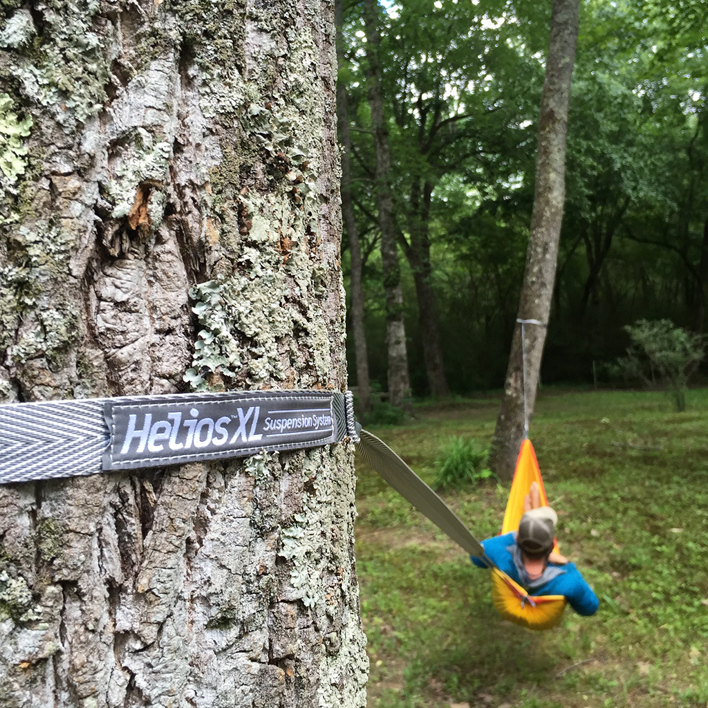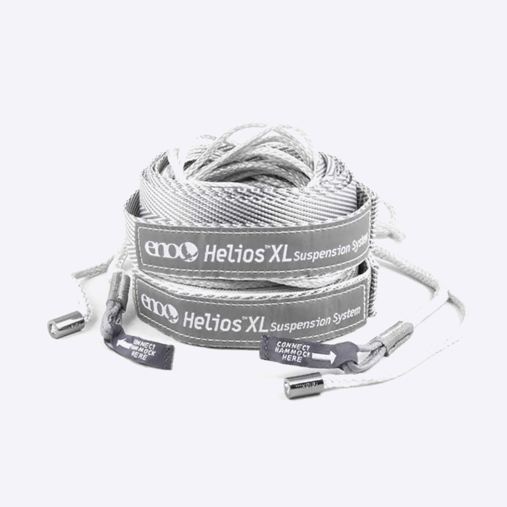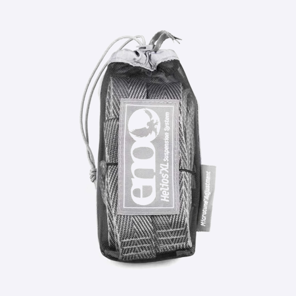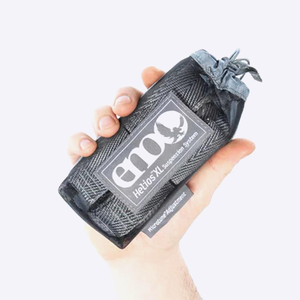 1999年にスタートし、現代のアメリカハンモックシーンを牽引するハンモックギアメーカー ENO(Eagle's Nest Outfitters) 一人でも多くの人をアウトドアフィールドへと誘い、自然と触れ合いながら遊ぶことの素晴らしさを知ってもらうために、ハンモックとそれにまつわる製品を開発しています。 何気なく通り過ぎている場所やいつも行く公園の中に、いままで気づかなかった場所を発見し、座ったり寝転んだりした時の特別感。 ハンモックを張る場所を想像し工夫することで、いつもの場所や景色がまた違ったものになります。 『Helios XL』は、ウーピースリングタイプの超軽量ハンモックサスペンション。ノーマルの長さが246cmなのに対し、こちらのXLは長さが410cm。2本の支柱の距離間が長くて、ノーマル長では足りないシチュエーションに対応できます。 ロープ部分は超強力なダイニーマ素材から出来ており、耐荷重も約136kgと強力です。樹木などに掛ける部分は、柔らかく幅もあり、ツリーフレンドリーな設定。 ENO最軽量コンパクトハンモック『Sub6』と組み合わせることで、350gを切る軽さで、快適なハンモックシステムを気軽に携帯できます。 支柱間が5-8mくらいあるようなシチュエーションにも対応します。