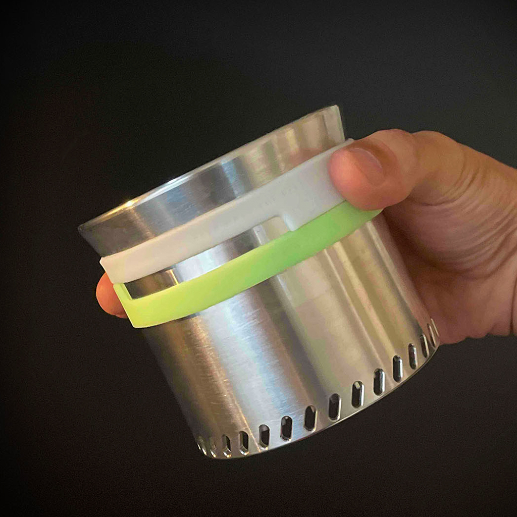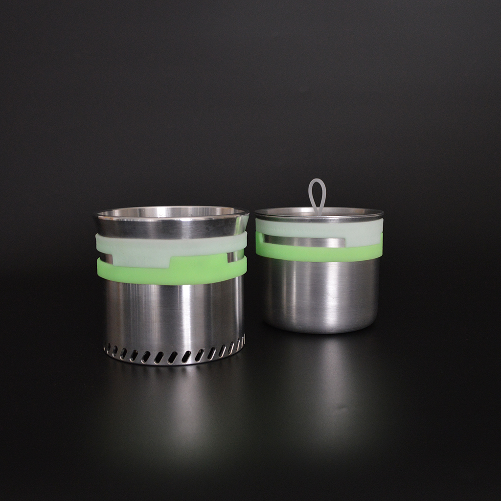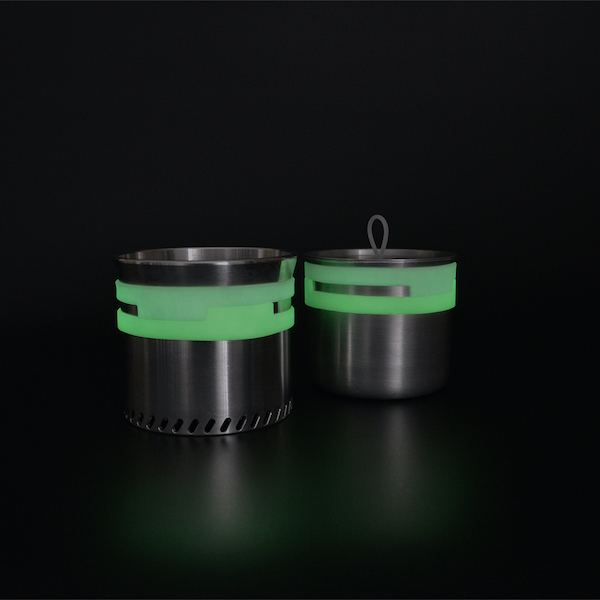 LEISMOR『GHOST BAND M-size』は、JMWのHillbilly pot 350や、TMR industriesのL.T.Cooker、W.R.Cookerなど、外径93mmまでのノーハンドルクッカーに装着できる蓄光仕様の耐熱バンド。 ノーハンドルクッカーを火器から降ろす際、これまでポットリフターを使っていました。このポットリフターが意外に嵩張るものが多く、火器と一緒にクッカー内へ収納が難しかったり、クッカーの縁がキズだらけになったり、そもそもクッカーの縁の形状に合わず、沸騰したお湯を持ち上げようとしたら重みで傾いてこぼしそうになったり。 クッカーのハンドルを無くすことで重さや収納の嵩張りを気にせず使えるはずが、ポットリフターでストレスを多く感じていては本末転倒になってしまいます。 GHOST BANDは収納の嵩張りを考える必要は一切なく、クッカーの縁が傷付くこともありません。また、掴む部分以外を徹底して削ぎ落とした形状によって非常に軽量に仕上げました。 ノーハンドルクッカーをお持ちの方は一度ぜひこのアイテムをご使用いただき、ミニマルな世界を楽しんでいただければ嬉しいです。 カラー:White × White カラー:White × Green カラー:Green × Green 左:JMWのHillbilly pot 350 右:TMR industriesのL.T.Cooker