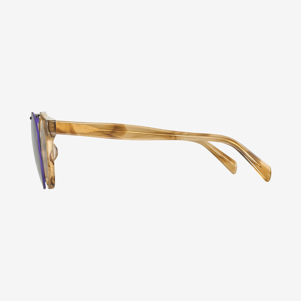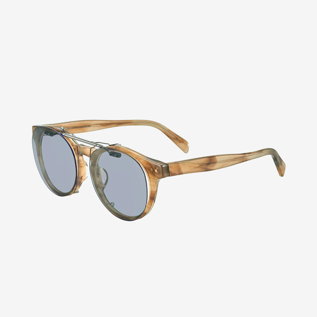 福井県鯖江市を拠点に、過酷な環境を想定して開発されたハイスペックな素材を使い、快適なサングラスを提案する【OWL MILS】(アウルミルズ)のクラシックラインが【owl classic】(アウルクラシック) 高品質なチタンフレームや、アセテートを使ったクラシックなフレームデザインと、掛け心地、装着感の良さも両立させています。 採用する国産ハイスペックレンズ『MILS LENS』は、「偏光+ハイコントラスト」で、明るさを残しつつ、眩しさをカットすることで、朝から夕方、曇りや雪など、全天候に対応し、クリアな視界を確保します。 また、紫外線は99%カット、ブルーライトも約80%カットします。 “偏光レンズ”とは、ギラつきや乱反射を抑え、余分な光をカットして、目の健康を保つ上でも非常に優れたレンズ。 “ハイコントラストレンズ”とは、レンズカラーに応じた機能性により、特定の波長(色)をカットすることで色彩のコントラストを高め、より鮮明で視界がくっきり見えるレンズ。 『MILS LENS』の大きな特徴は、その高い透明度。一般的な偏光レンズの可視光線透過率は20%前後ですが、MILS LENSの可視光線透過率は31〜32%。 そのため、眩しさを抑えながらも従来のサングラスよりも視界が暗くなりすぎず、たとえば曇りの日や樹林帯を歩く時、トンネル内を運転するような時もサングラスを掛けたままで快適に過ごせます。 また、色の見え方も裸眼で見た時との差が少なく、カメラやスマホでの撮影時にも快適です。 『Hnos』(フノス)は、アセテートフレームにシーザーフリップタイプのMILS LENSを組み合わせたサングラス。 必要ない時はMILS LENSをサッと片手で跳ね上げて使えます。 col.1 ブラック col.2 クリアベージュ col.3 クリア カラー:col.2 クリアベージュ
