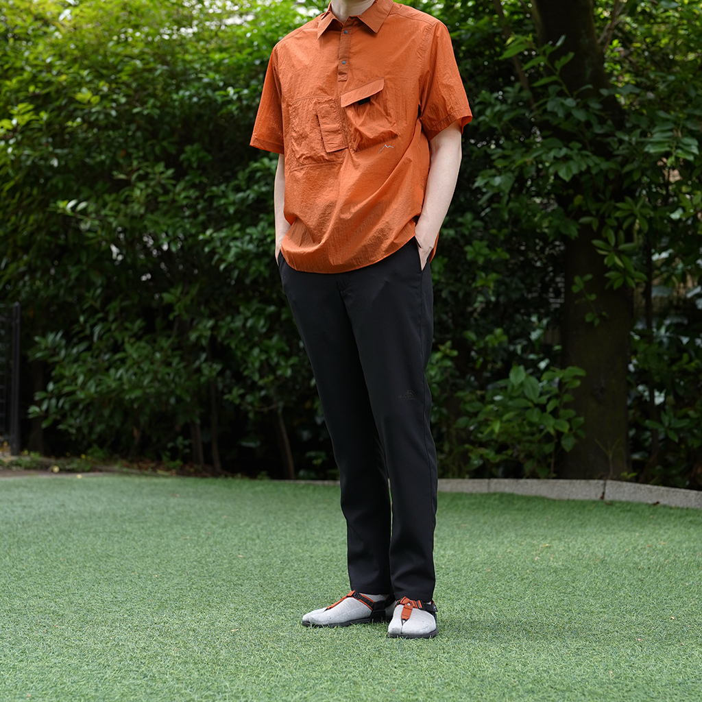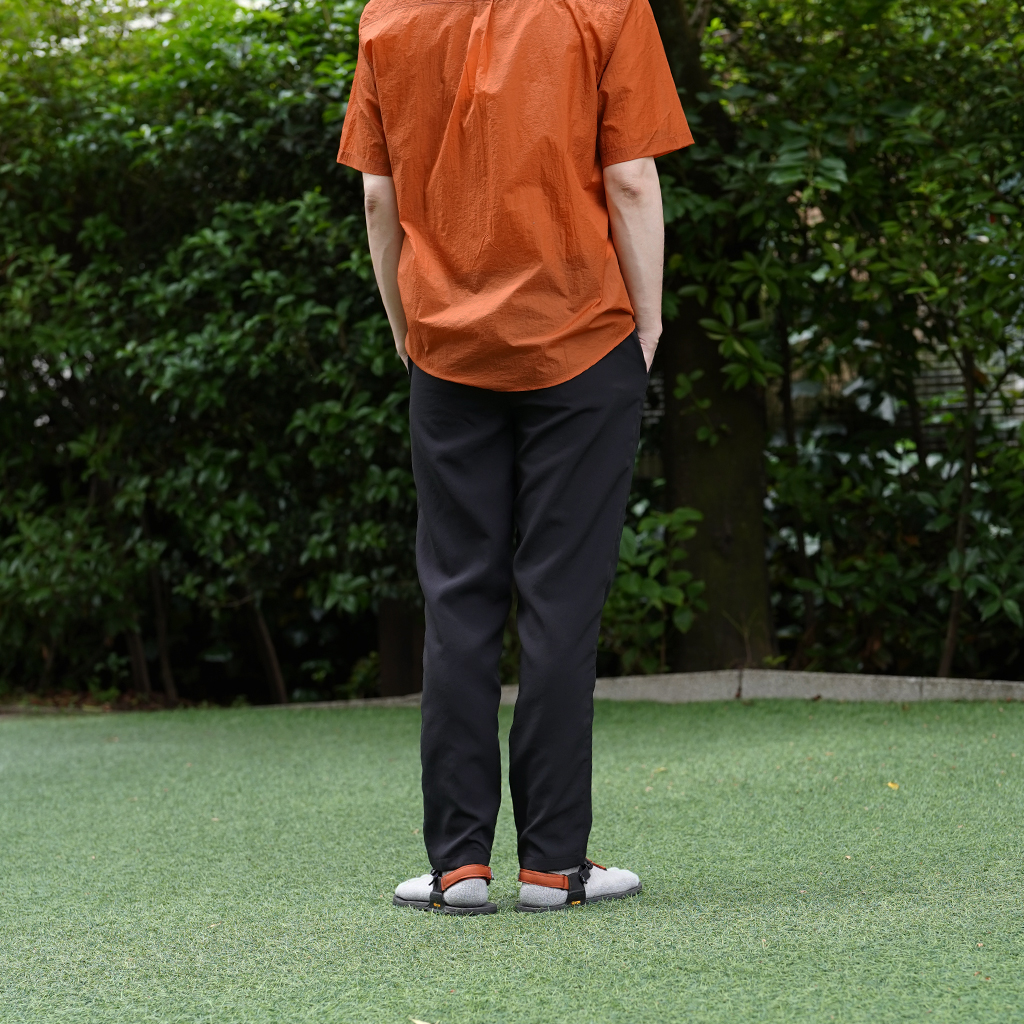 生地にははっ水加工を施し、多少の雨や泥は弾きます。UVケア(UPF15-30、紫外線カット率85%以上)機能付き。スッキリとしたシンプルなシルエットで、春夏秋のアウトドアシーンで幅広く着用できる1着。背面。目立ちにくいブラックロゴ。モデル:182cm / Lサイズ