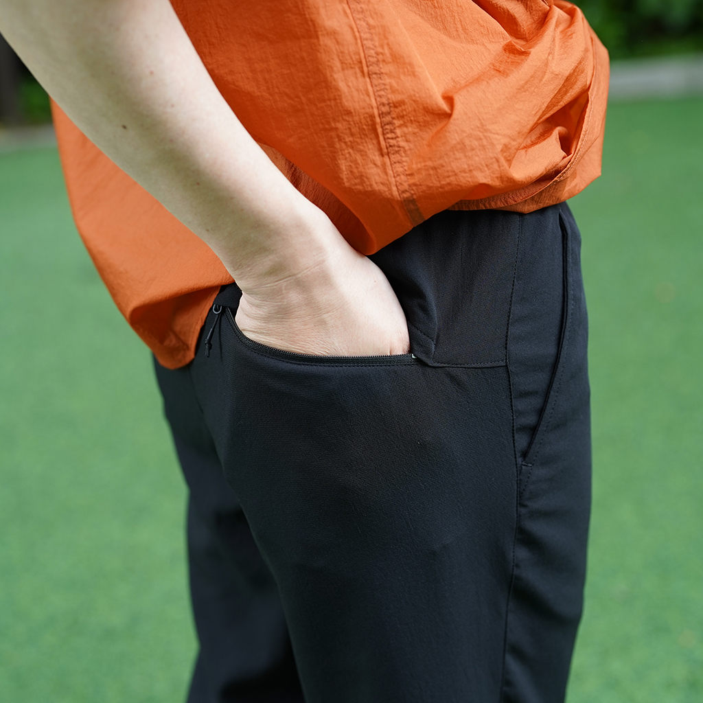 メッシュ地の2層構造により通気性を高めています。リサイクルポリエステルのメカニカルストレッチ素材を採用し、ダイナミックな脚の動きにもスムーズ寄り添ってくれます。
