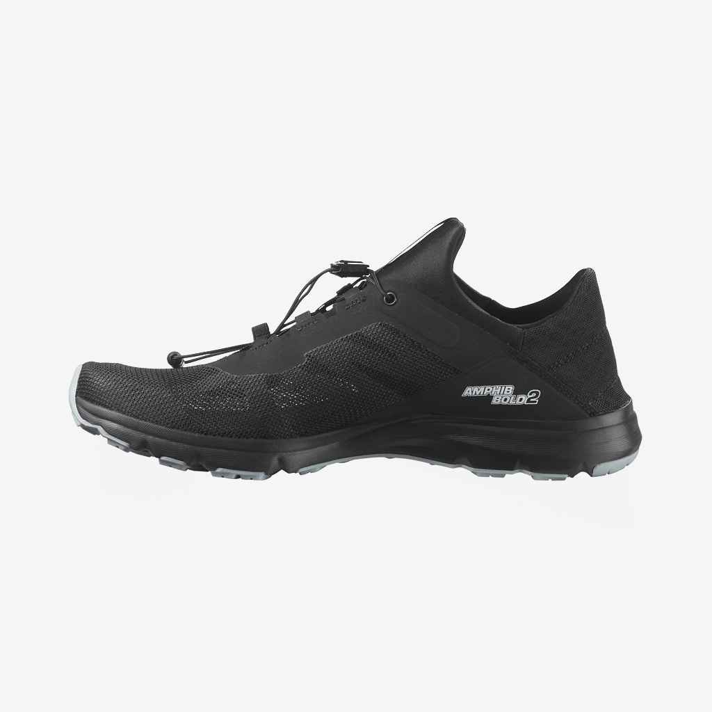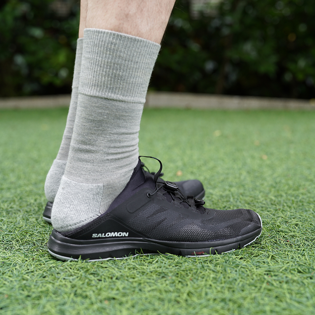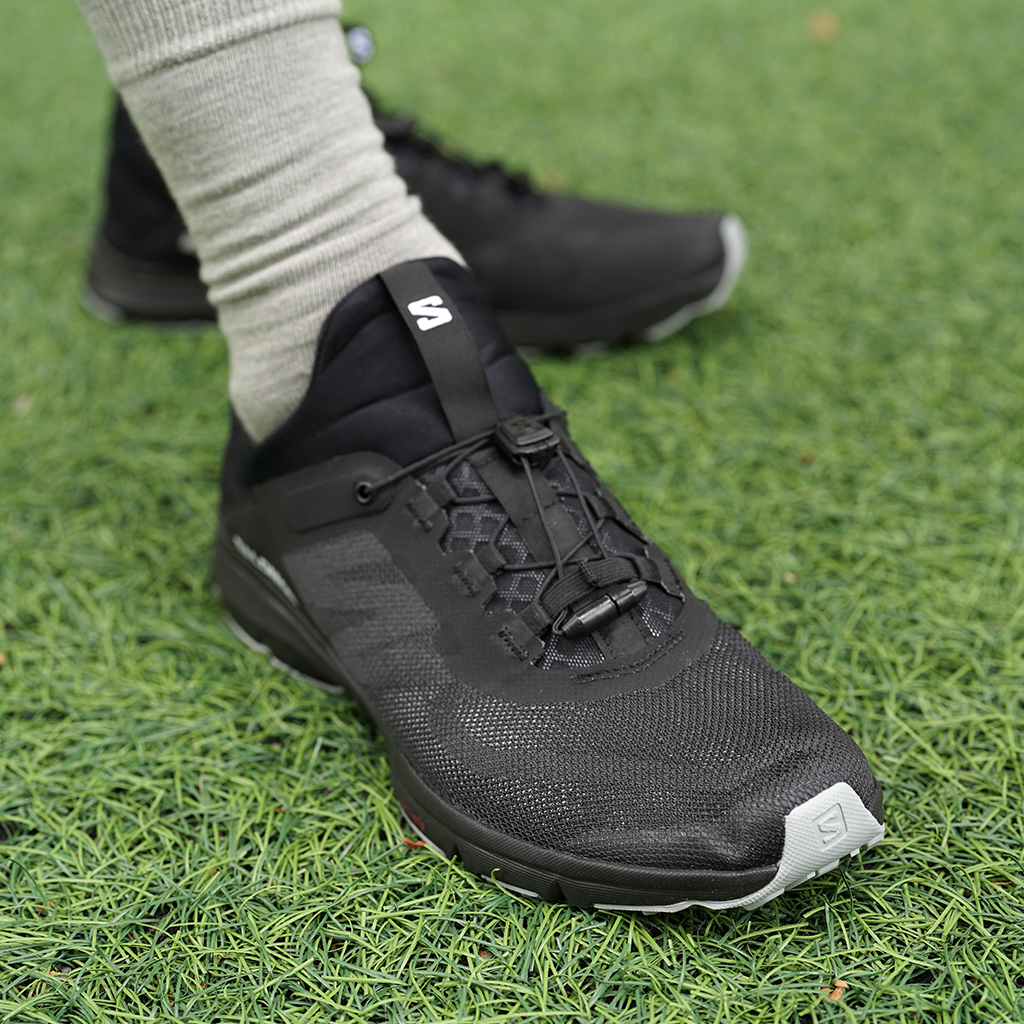 水辺のアドベンチャーや水にそのまま入れるウォーターシューズとしても使える名品SALOMON『AMPHIB BOLD 2』が、さらに軽く、通気性も高くなりアップデート。 かかとを折りたたんでサンダルのように履いたり、Quicklaceを調節すればランニングも楽しめます。 通気性と速乾性に優れたメッシュに、コーヒーの粉から作られた防臭効果の高い S-Cafeソックライナーを採用。足と一体化したような接地感で、濡れた路面もしっかり捉えます。 Quicklace採用で、濡れても解けず、フィッティングや着脱もスムーズです。 夏のアクティビティの幅がいっそう広がる軽量シューズです。 踵を折りたたんでサンダルとしても履けるのが本当に便利。