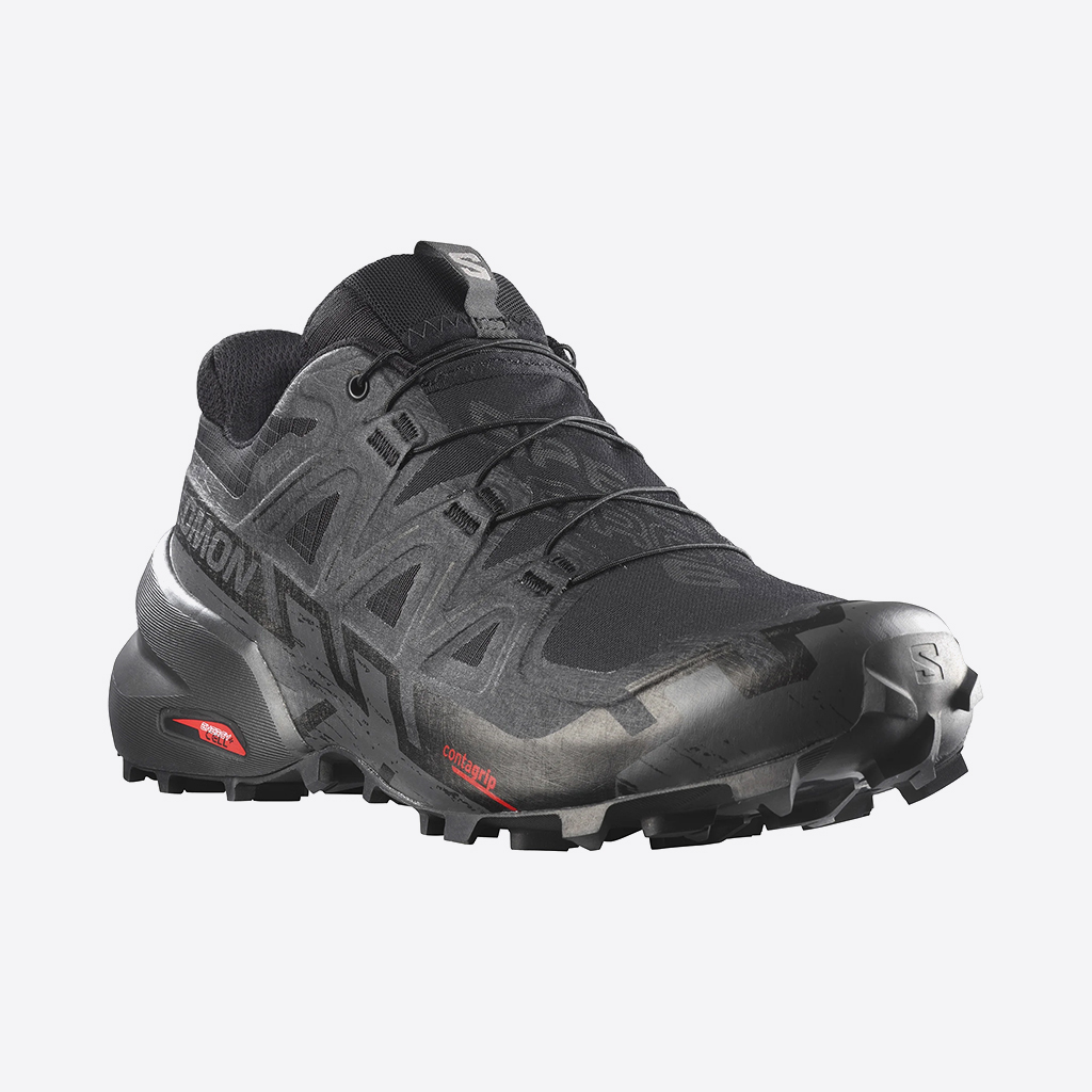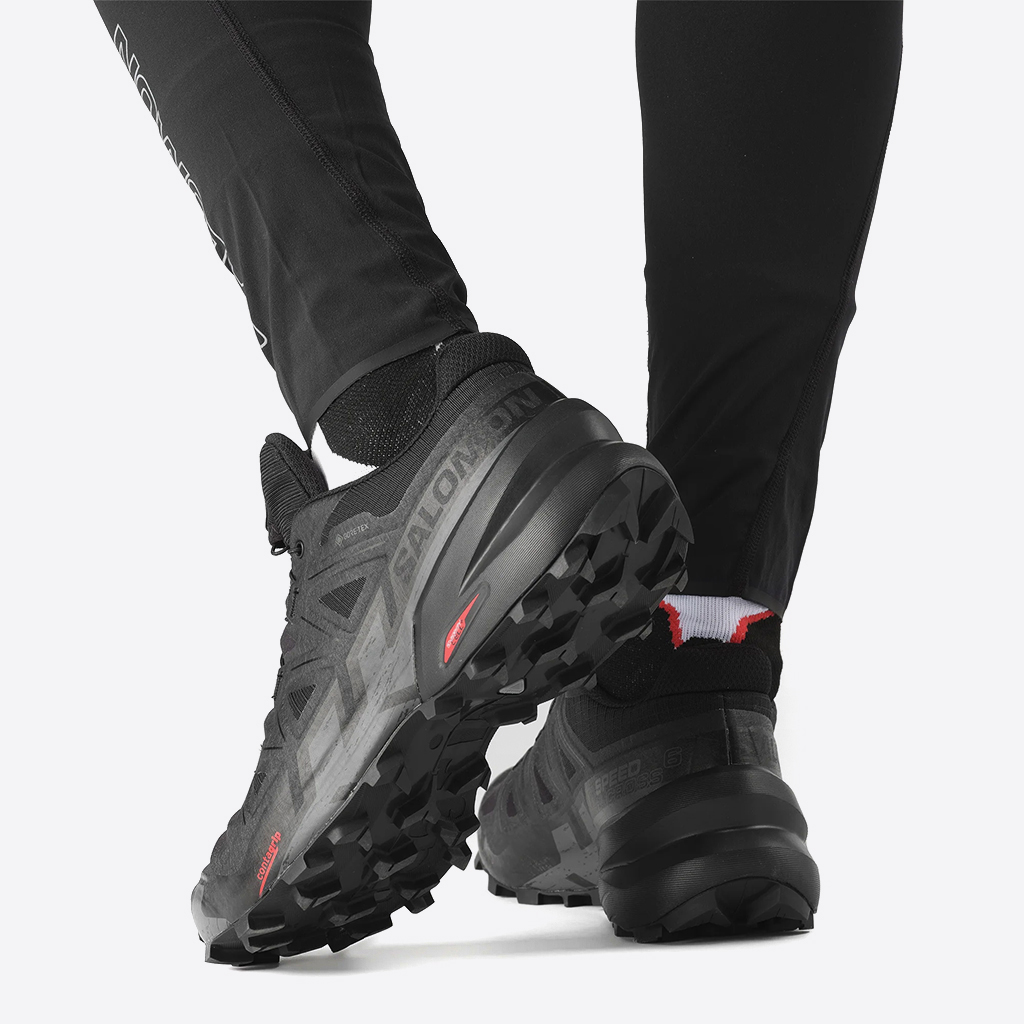 SALOMONの代表的モデルのひとつ『SPEEDCROSS 6 GTX』は、泥落ちのよい最新のアウトソールを採用し、湿った地面でのグリップ力がさらにアップ。 防水性と通気性に優れた GORE-TEX メンブレンが足をドライに保ち、ぬかるみなどの過酷なコンディションでも快適さが続きます。SPEEDCROSSの快適さはそのままに、軽量化を追求しています。 SensiFit? 構造が正確で最適なホールド感と SPEEDCROSS のこれまでと変わらぬ快適さを提供。 Quicklace?採用。細くて丈夫な紐を 1 回で締めあげることができます。着脱しやすいデザイン。 優れたクッション性と耐久性を誇る EnergyCell?+ は、並外れたエネルギーリターンを実現するリバウンド力の高いミッドソールコンパウンドです。 Mud Contagrip_ は、密着性の高いコンパウンドを使った深いシャープなラグを採用。ぬかるんだ柔らかい表面や硬い起伏のある表面で最大のグリップ力を発揮するデザインです。 足とフットベッドの間に土や砂が入り込むのを防ぐ、目の詰まったメッシュ。ナイロン製の織り生地で、摩耗に強く、裂けにくい耐久性を持っています。 SALOMONのルーツに忠実なトレイルの定番モデルです。