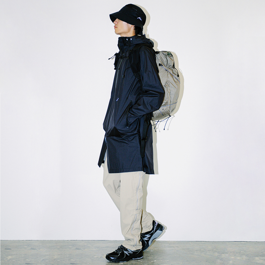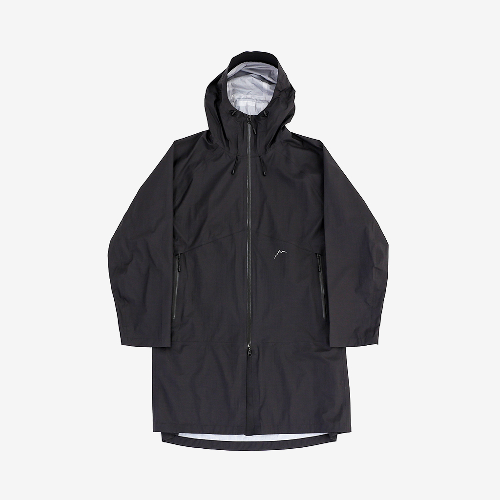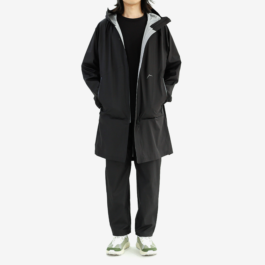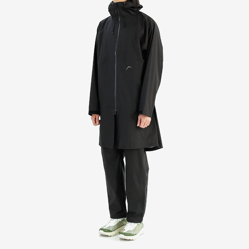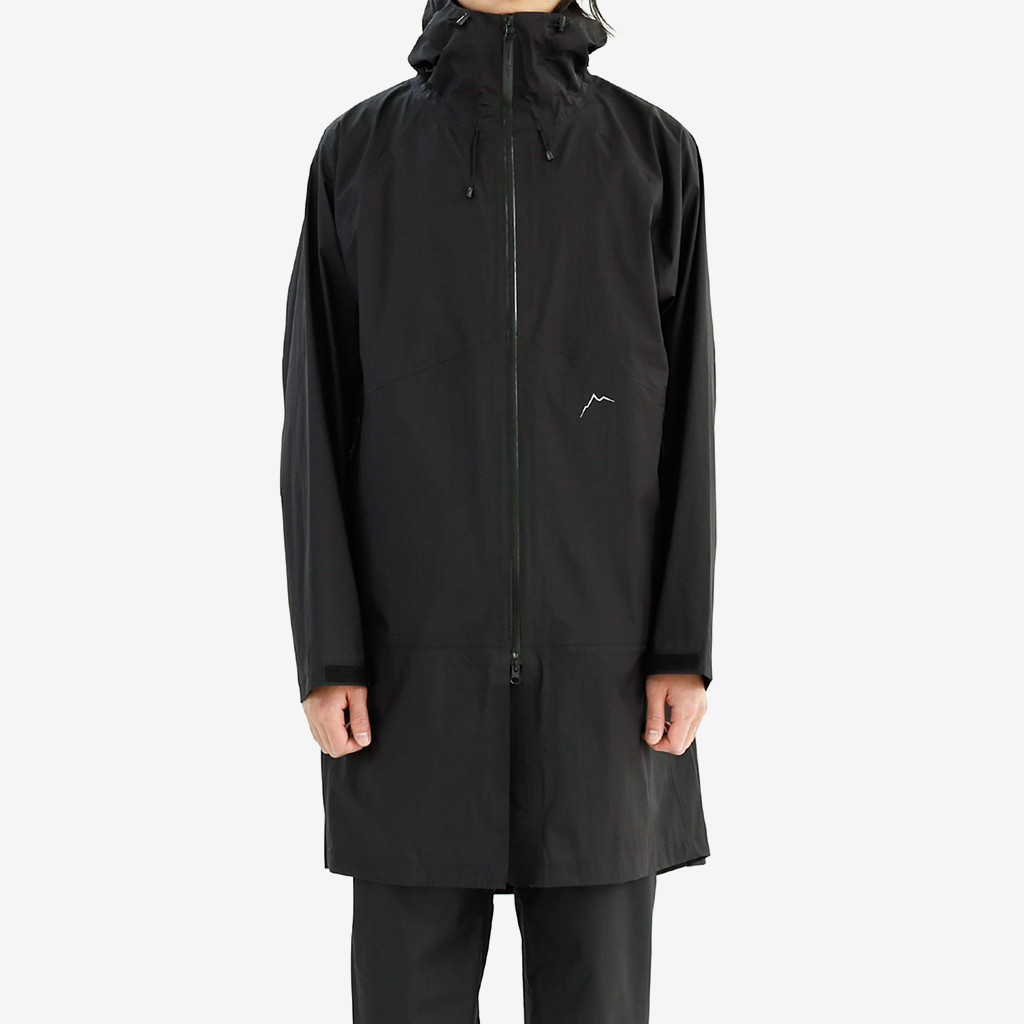 CAYL『Light 3L Rain Coat』は、高レベルの防水性、透湿性、低結露性を実現した防水透湿素材である東レ『Dermizax(ダーミザクス)』を使用して作られた3レイヤーの軽量レインコート。 優れたストレッチ性で着心地もしなやかで、太ももくらいまで雨風を防いでくれるので、レインパンツを使わずともある程度の雨を凌いでくれます。 一番の特徴はシルエットの可変性。背面側がゆとりを持たせたパターンになっていて、30Lくらいのバックパックなら上から羽織れるようになっています。 またサイドのスナップボタンで開き具合の調整もできます。フロントはダブルジッパー、フードもストリングコードで絞れます。 山だけでなく、フェスやデイリーユースなど、いろんな使い方の可能性が広がるレインウェアです。 背面。 フロントもダブルジッパーで、下から開けて換気もできます。 サイドのスナップボタンで開き具合の調整もできます。 袖はベルクロで調整。 背面部のパターン。 バックパックの上から羽織ったイメージ。 CAYLのMari(約30L)の上からも羽織れるサイズ感です。 モデル:184cm/Lサイズ