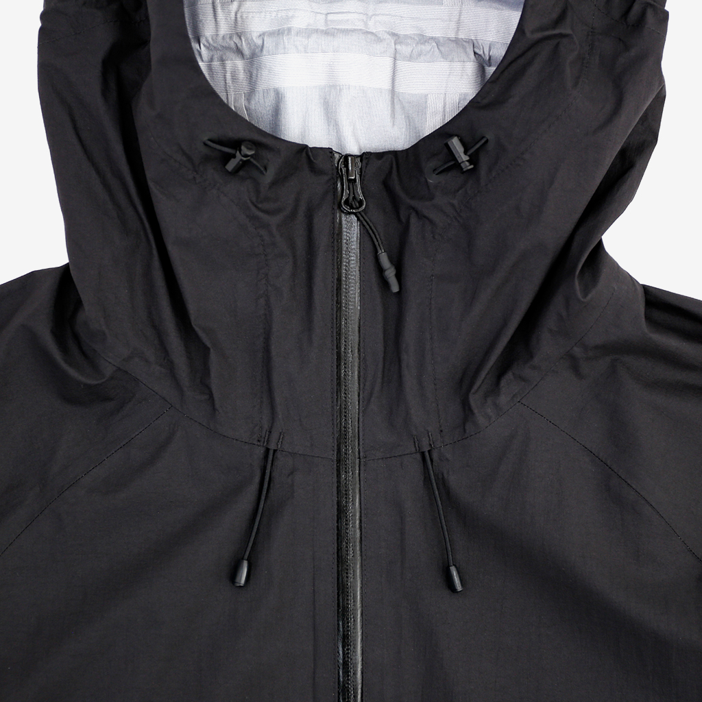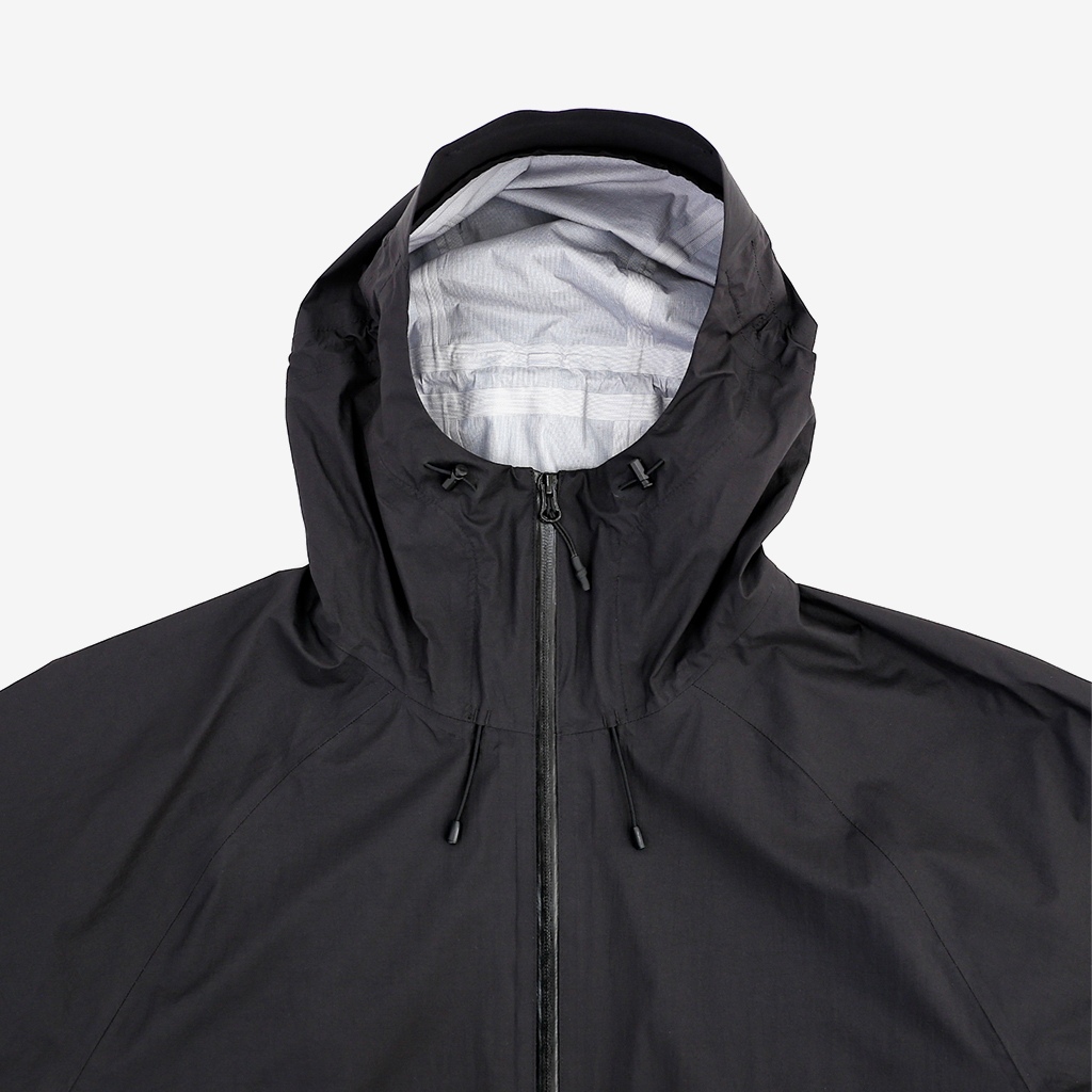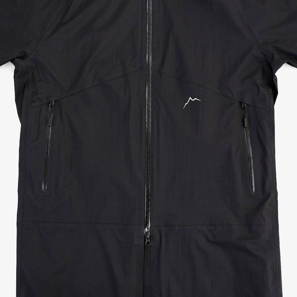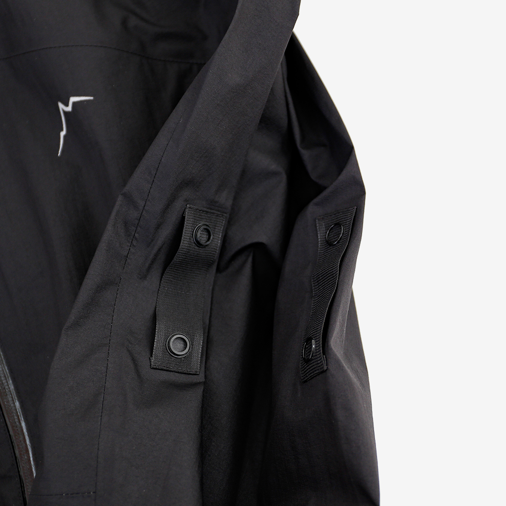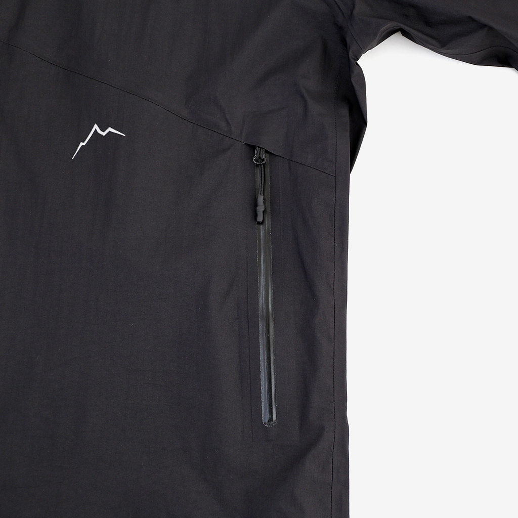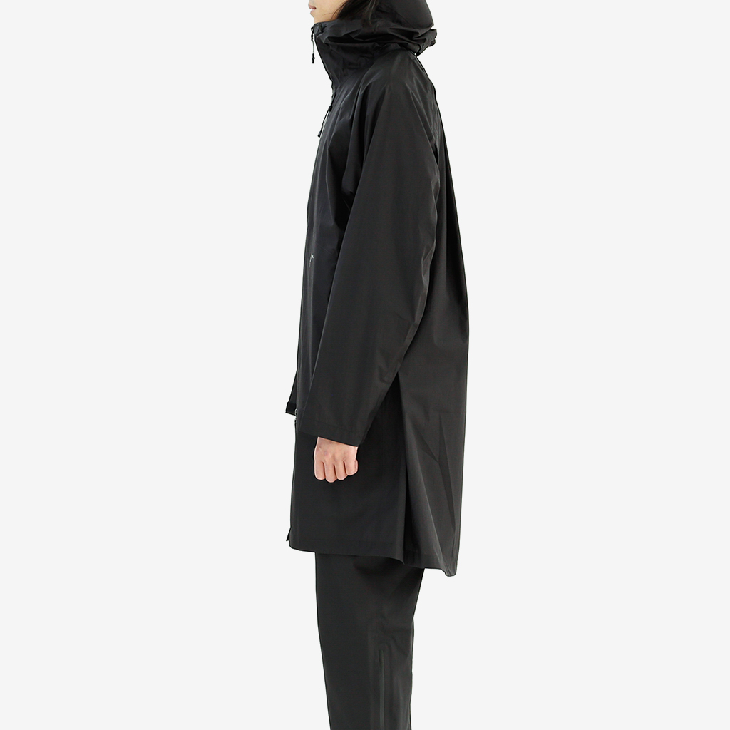 CAYL『Light 3L Rain Coat』は、高レベルの防水性、透湿性、低結露性を実現した防水透湿素材である東レ『Dermizax(ダーミザクス)』を使用して作られた3レイヤーの軽量レインコート。 優れたストレッチ性で着心地もしなやかで、太ももくらいまで雨風を防いでくれるので、レインパンツを使わずともある程度の雨を凌いでくれます。 一番の特徴はシルエットの可変性。背面側がゆとりを持たせたパターンになっていて、30Lくらいのバックパックなら上から羽織れるようになっています。 またサイドのスナップボタンで開き具合の調整もできます。フロントはダブルジッパー、フードもストリングコードで絞れます。 山だけでなく、フェスやデイリーユースなど、いろんな使い方の可能性が広がるレインウェアです。 背面。 フロントもダブルジッパーで、下から開けて換気もできます。 サイドのスナップボタンで開き具合の調整もできます。 袖はベルクロで調整。 背面部のパターン。 バックパックの上から羽織ったイメージ。 CAYLのMari(約30L)の上からも羽織れるサイズ感です。 モデル:184cm/Lサイズ